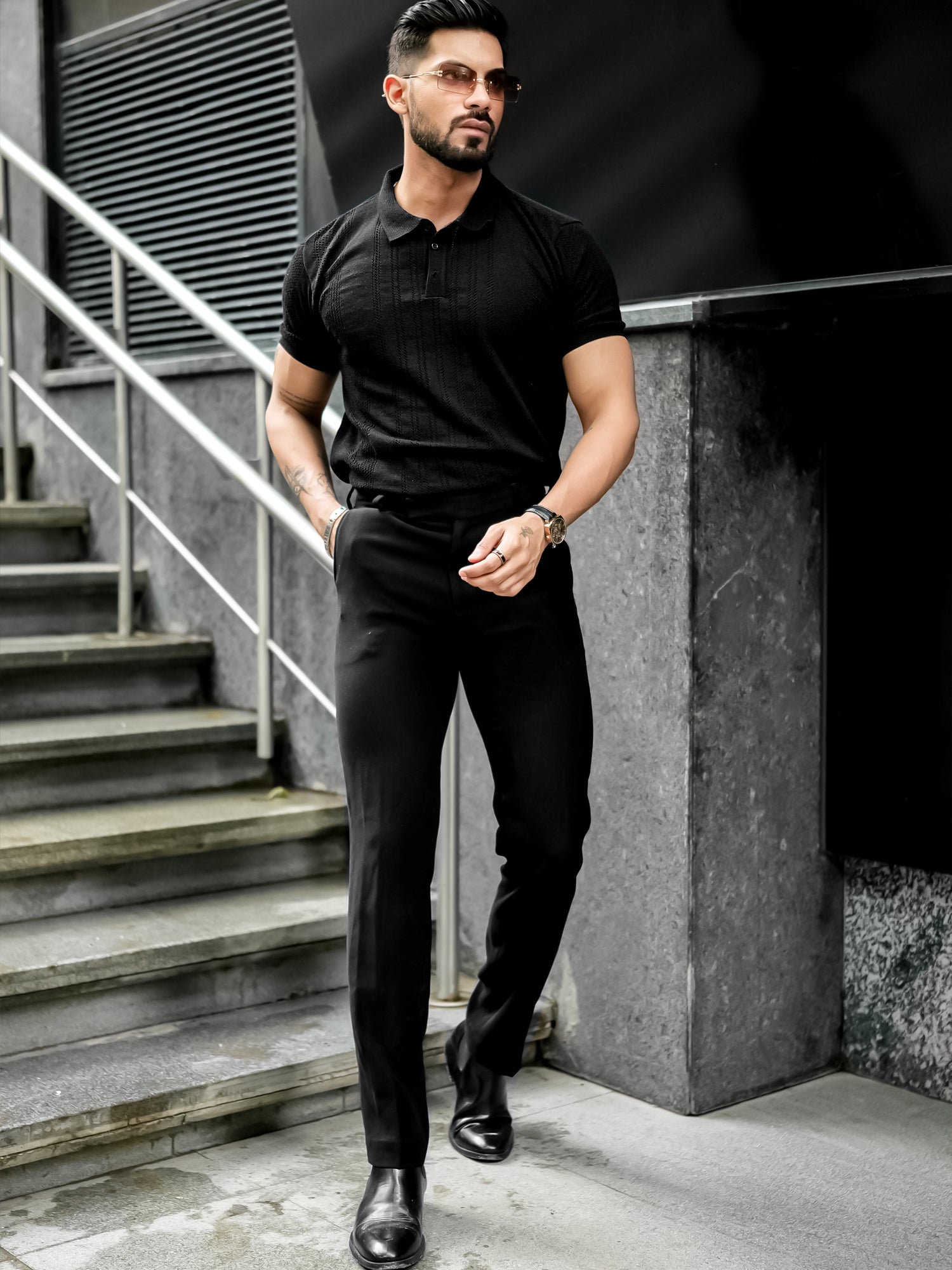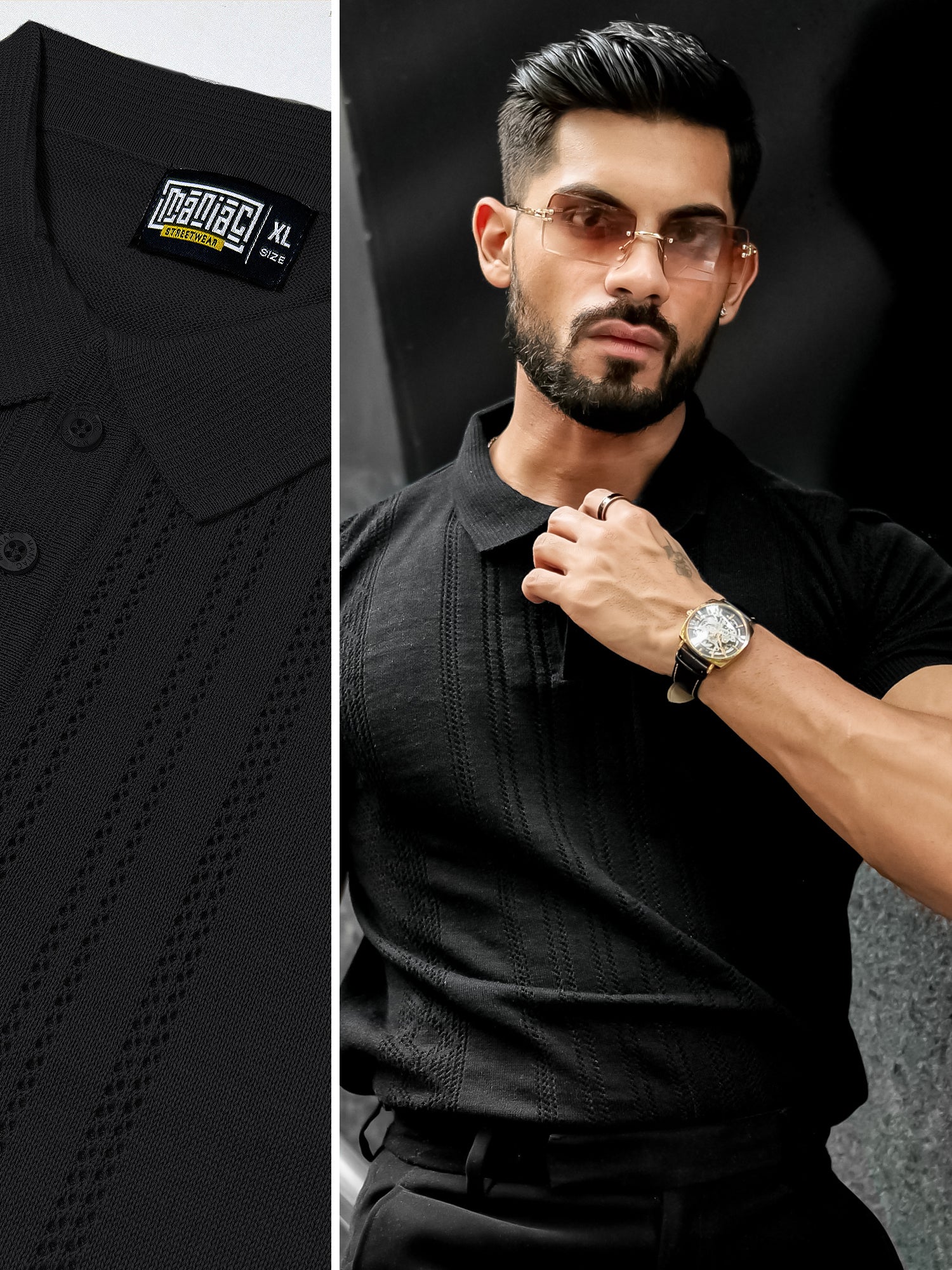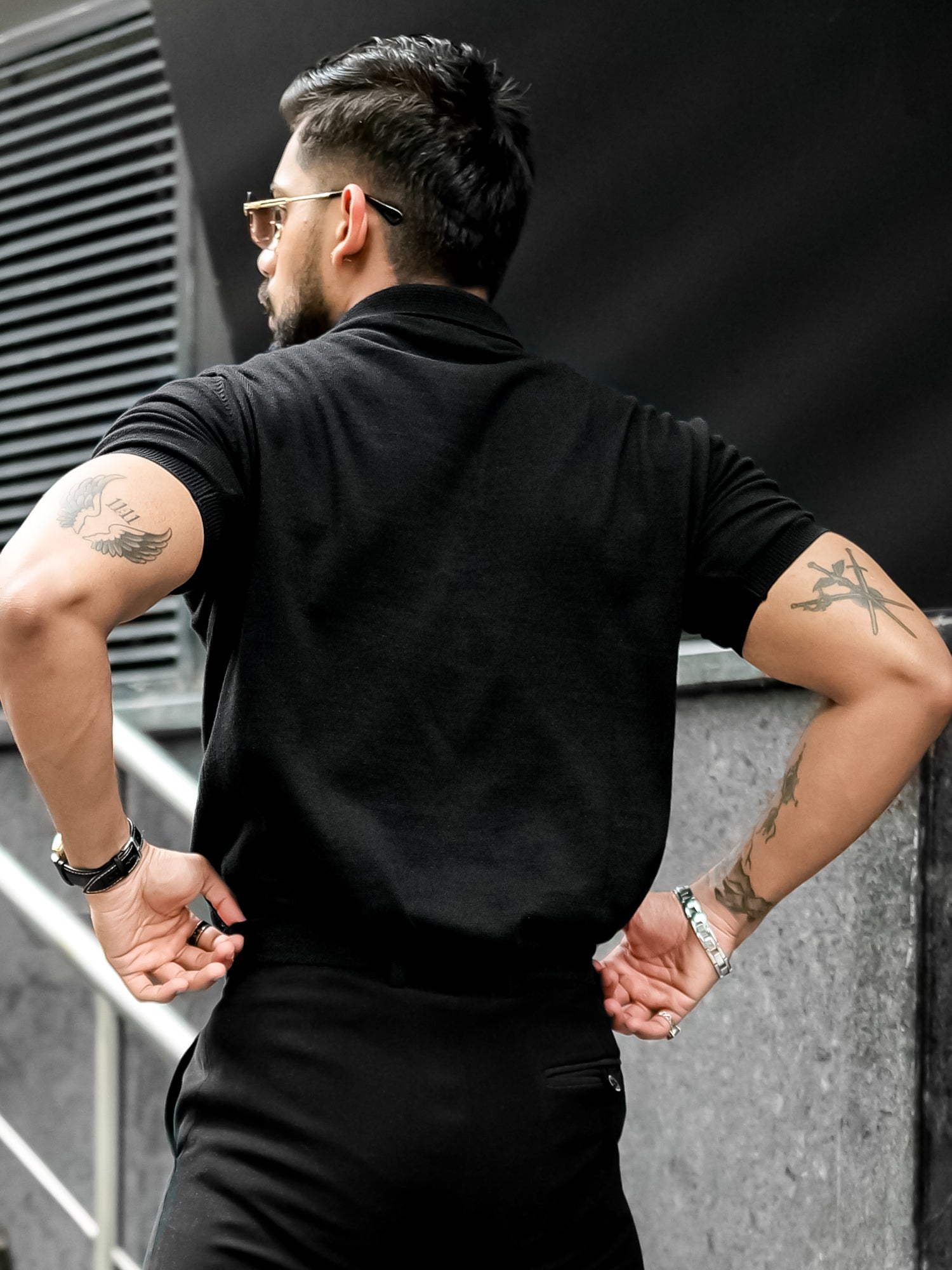Flat Knit Black Slim Half Sleeve T-Shirt