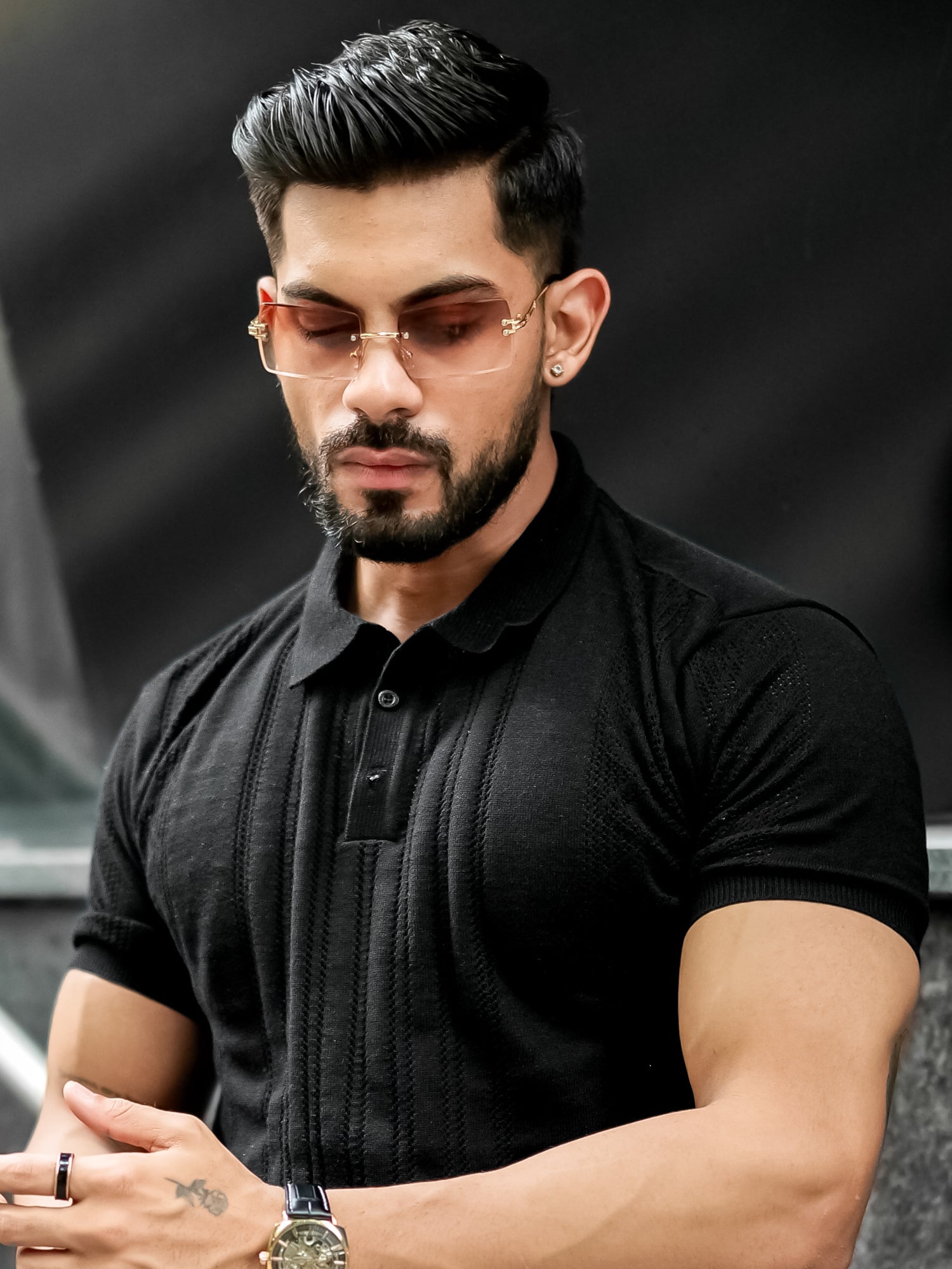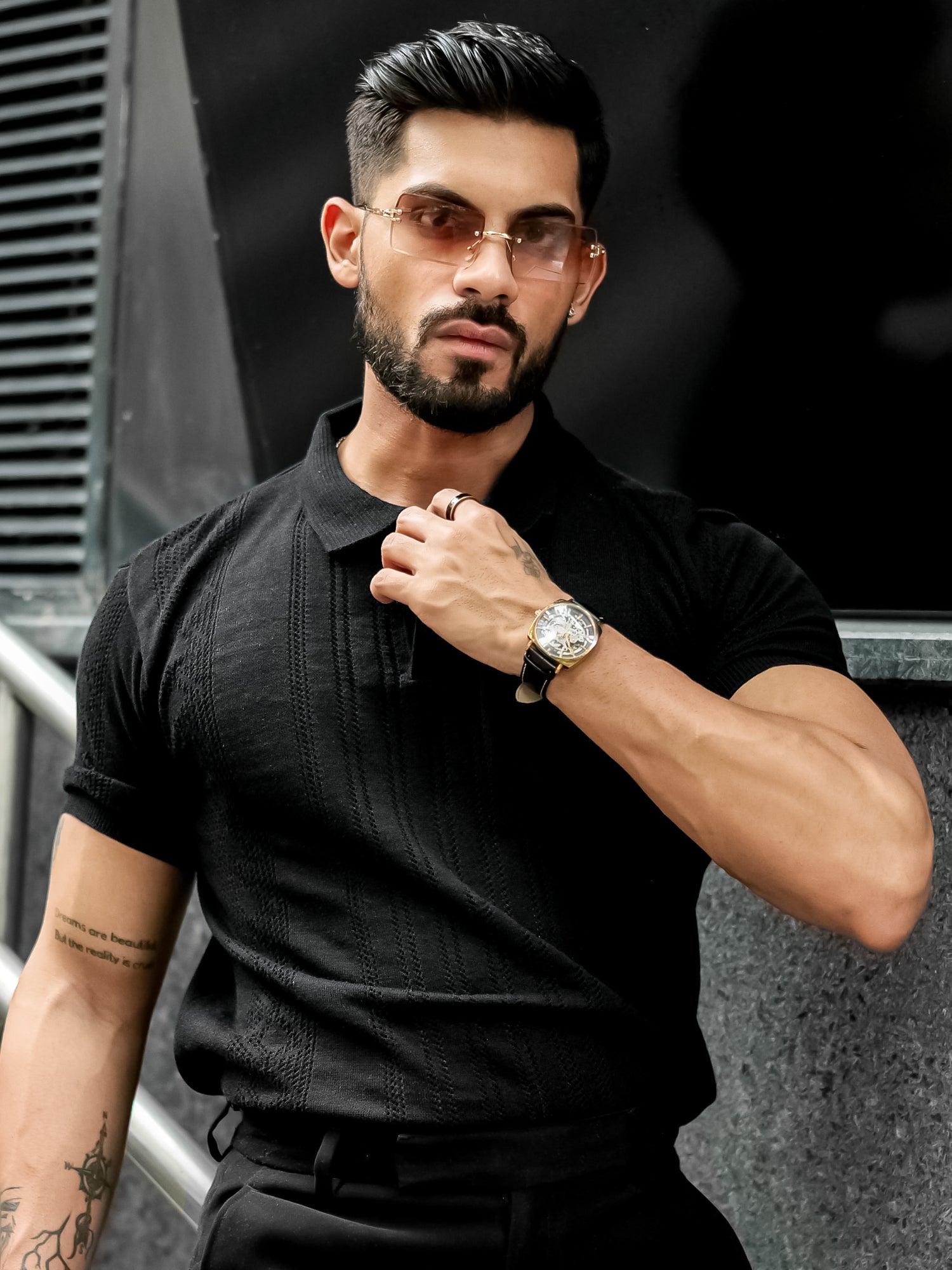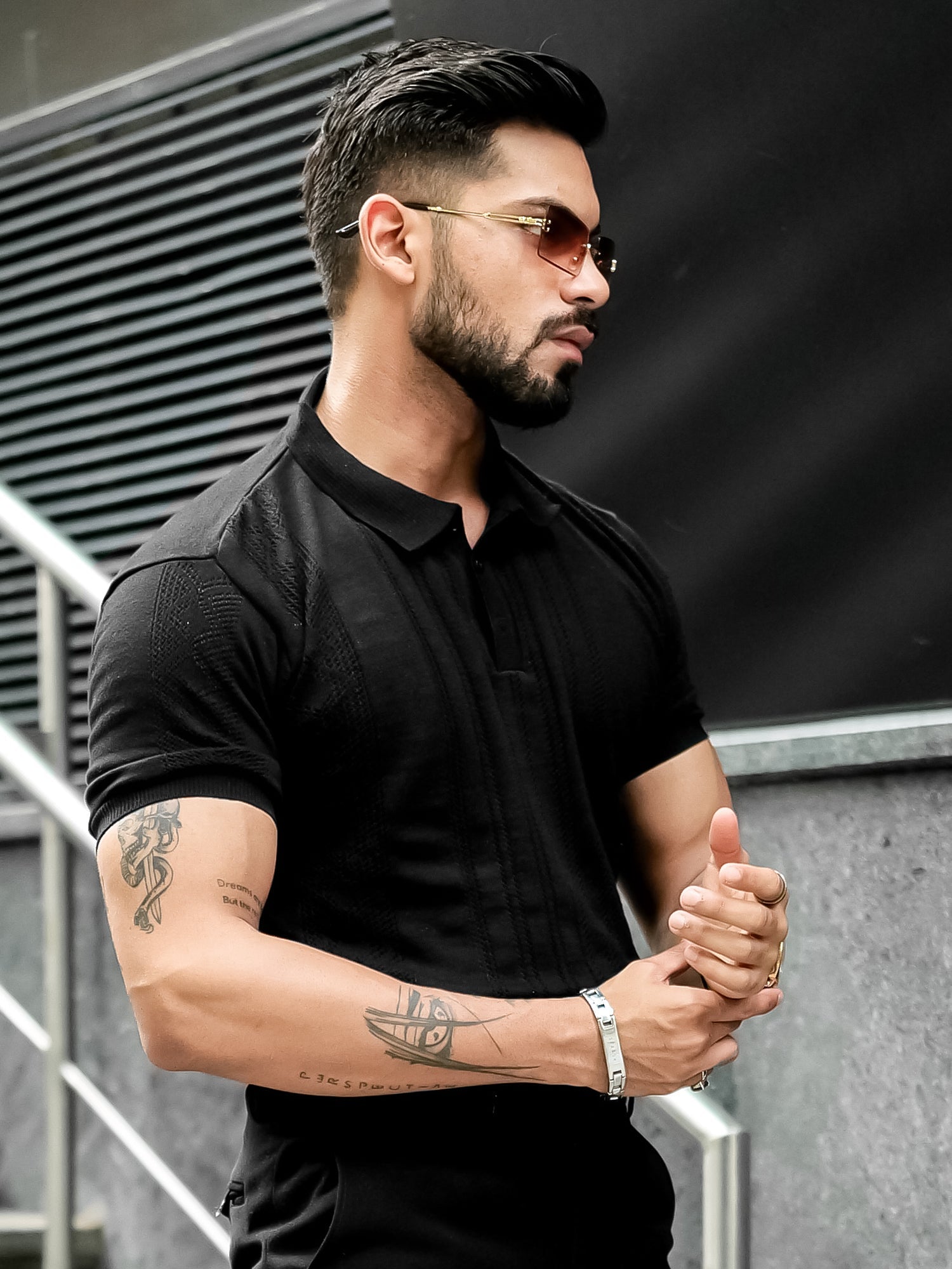 Flat Knit Black Slim Half Sleeve T-Shirt
