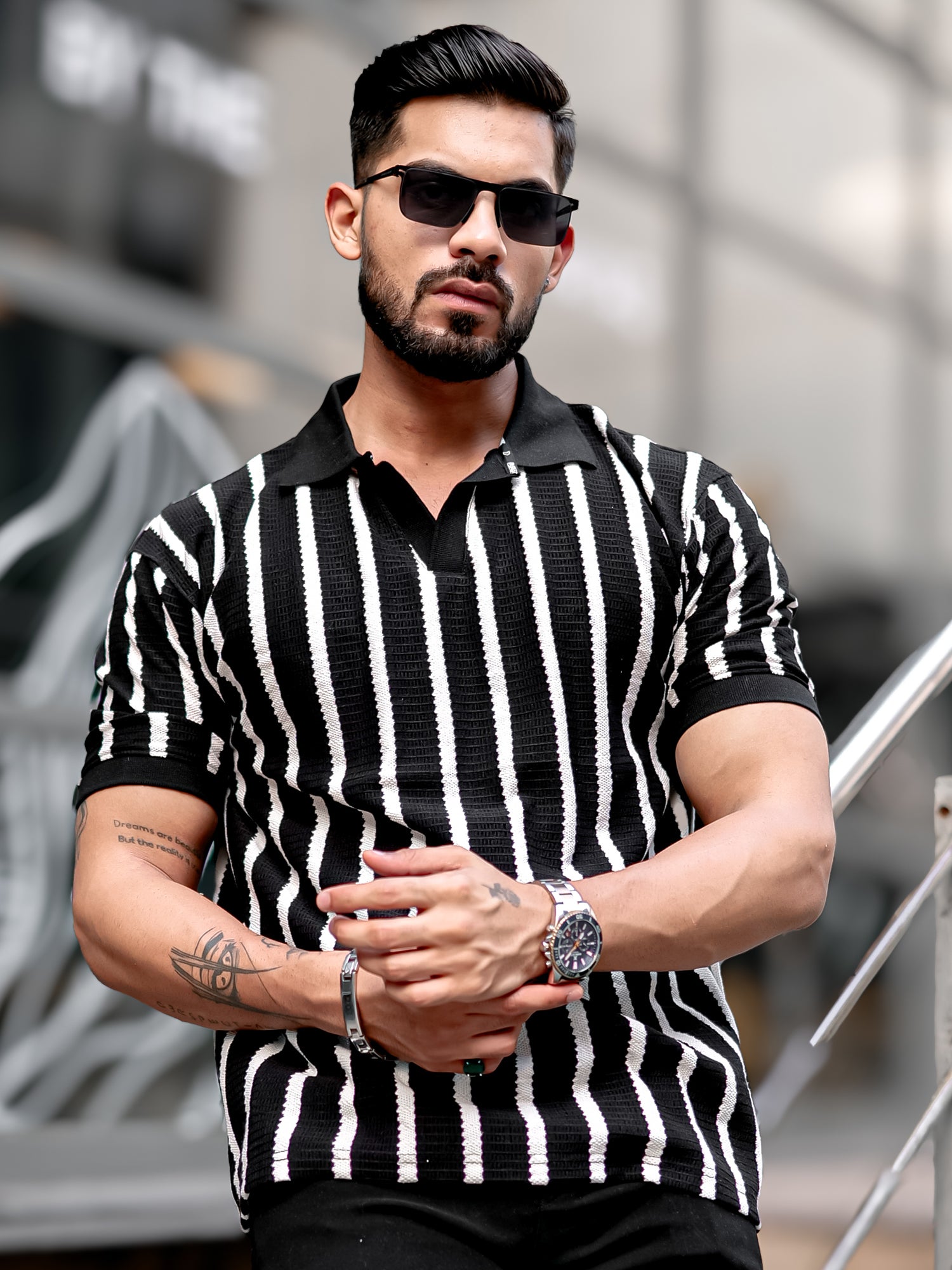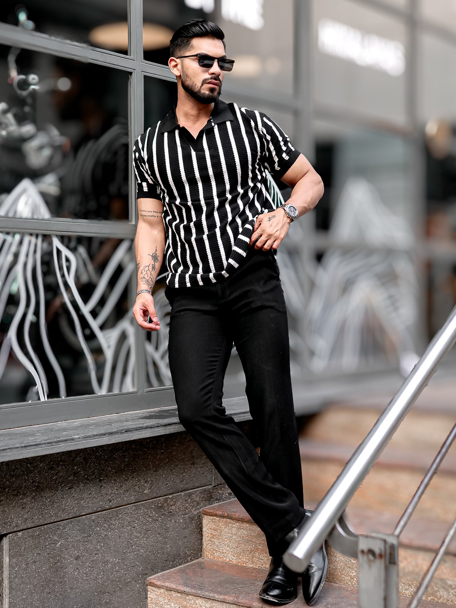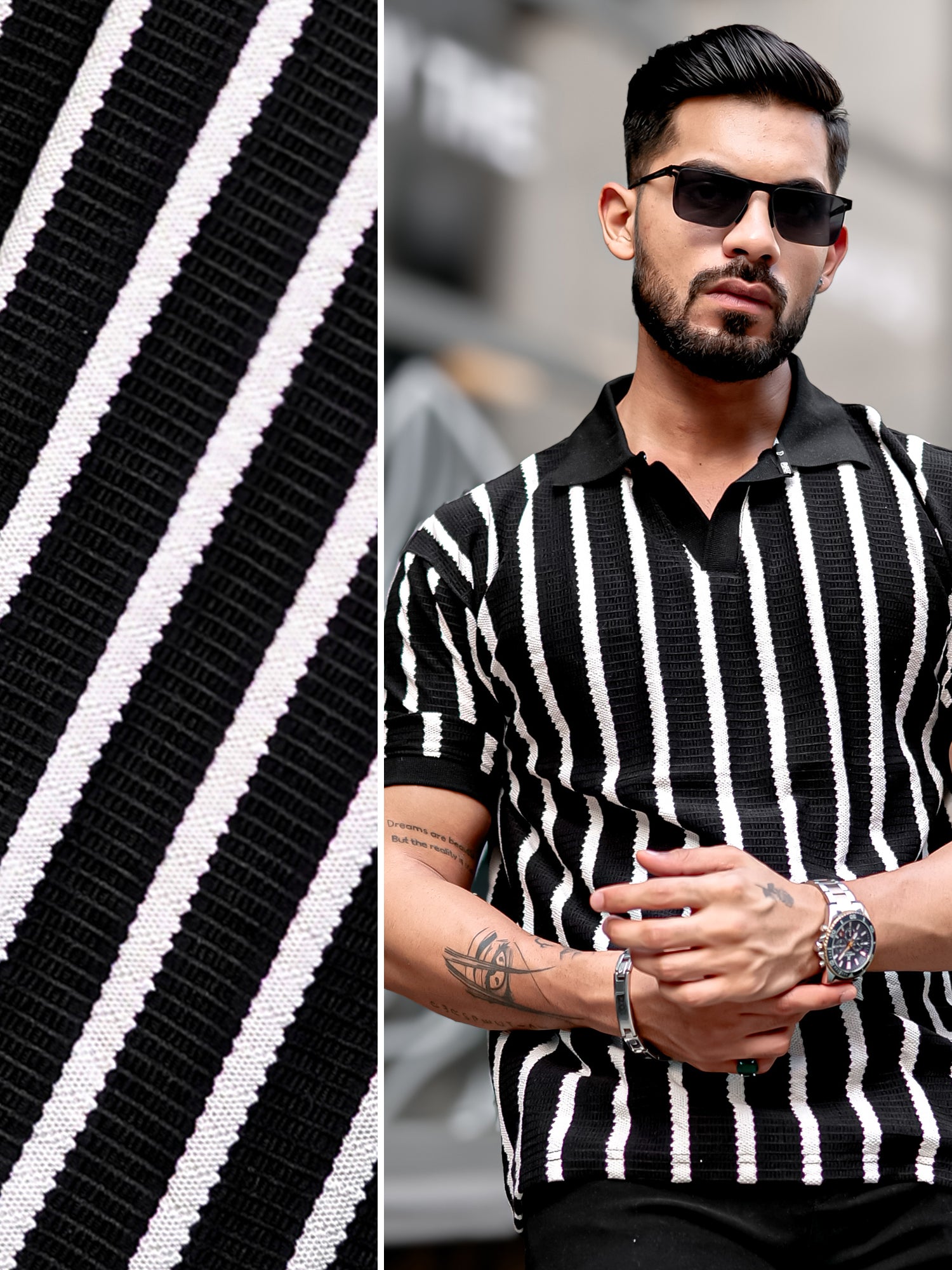 Popcorn Knit Black Polo Half Sleeve T-Shirt