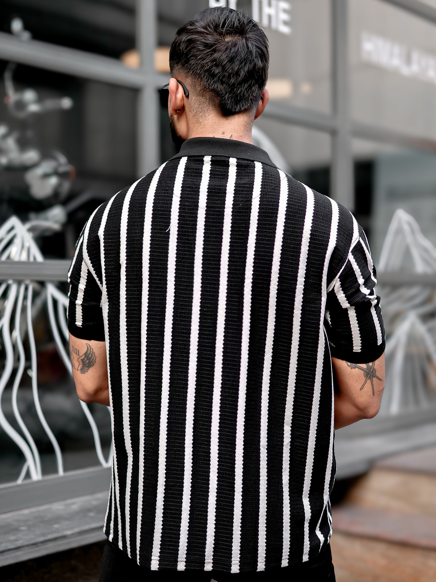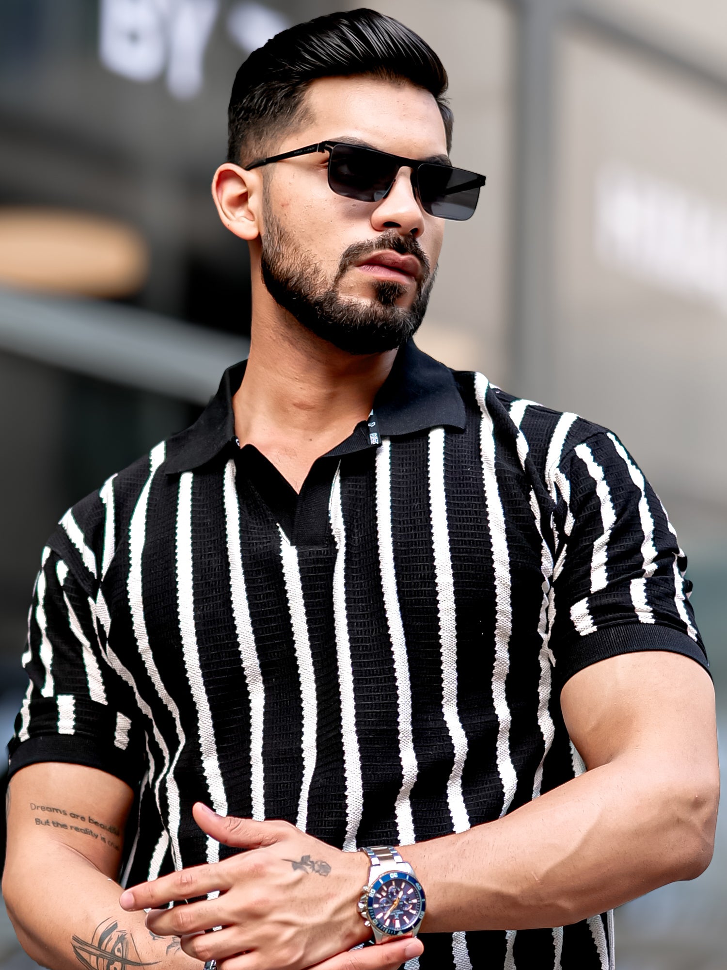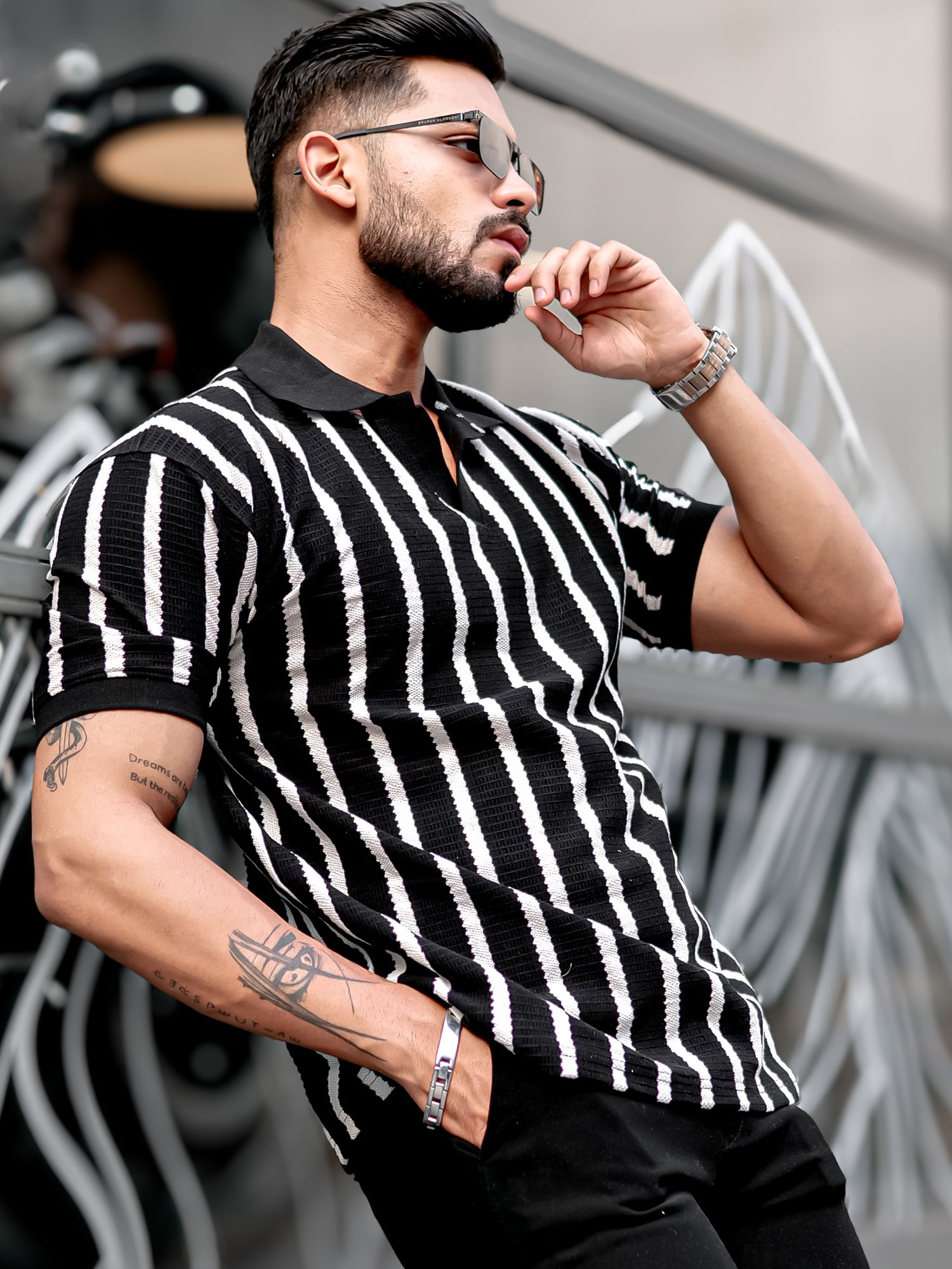 Popcorn Knit Black Polo Half Sleeve T-Shirt