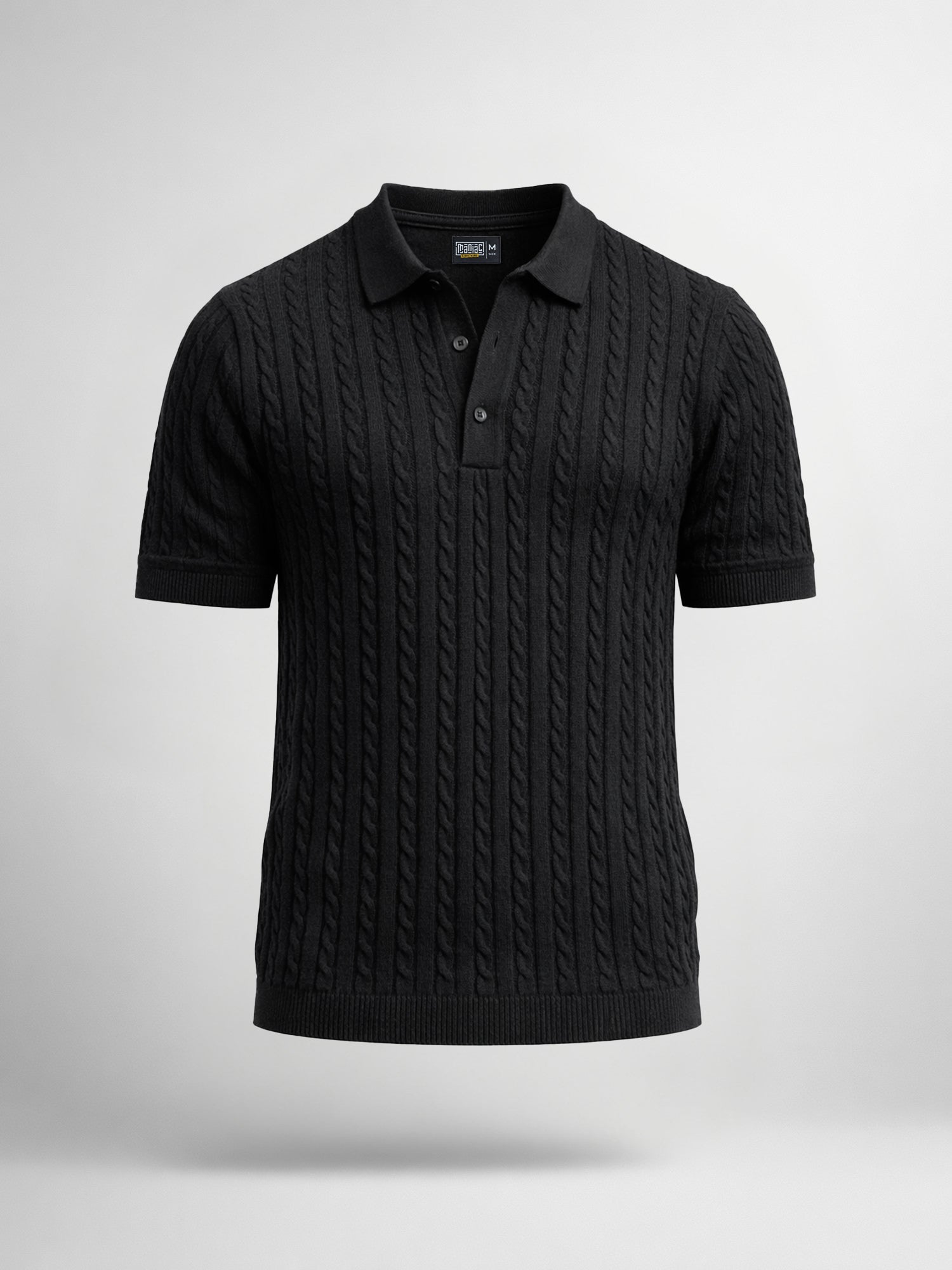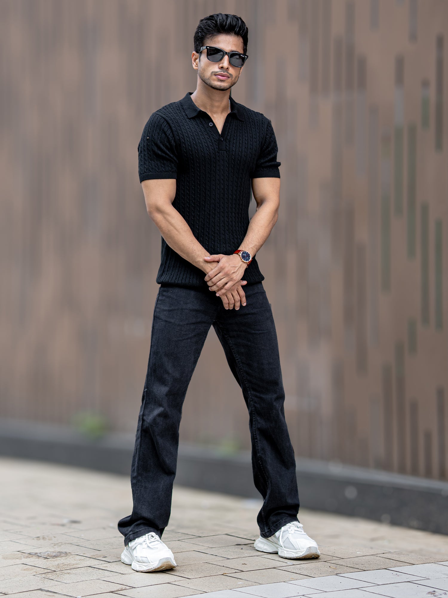 Ribbed Knit Black Polo Half Sleeve T-Shirt