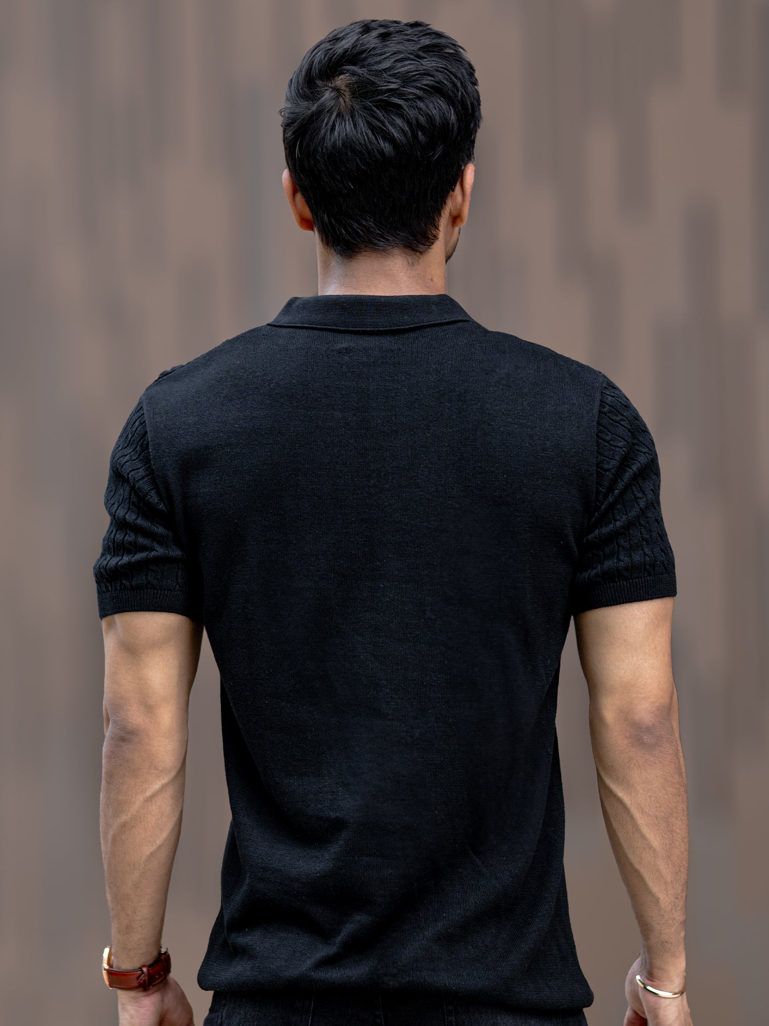 Ribbed Knit Black Polo Half Sleeve T-Shirt