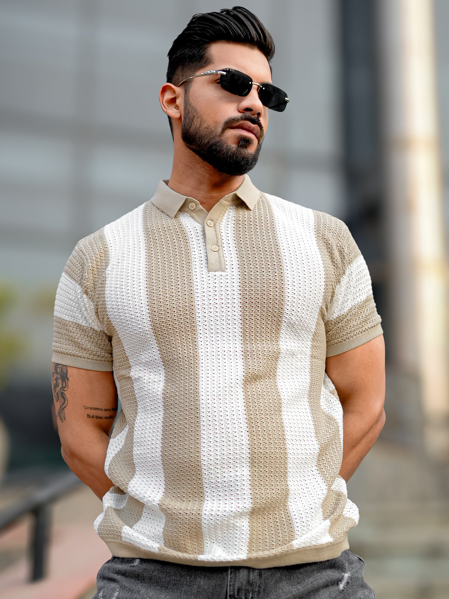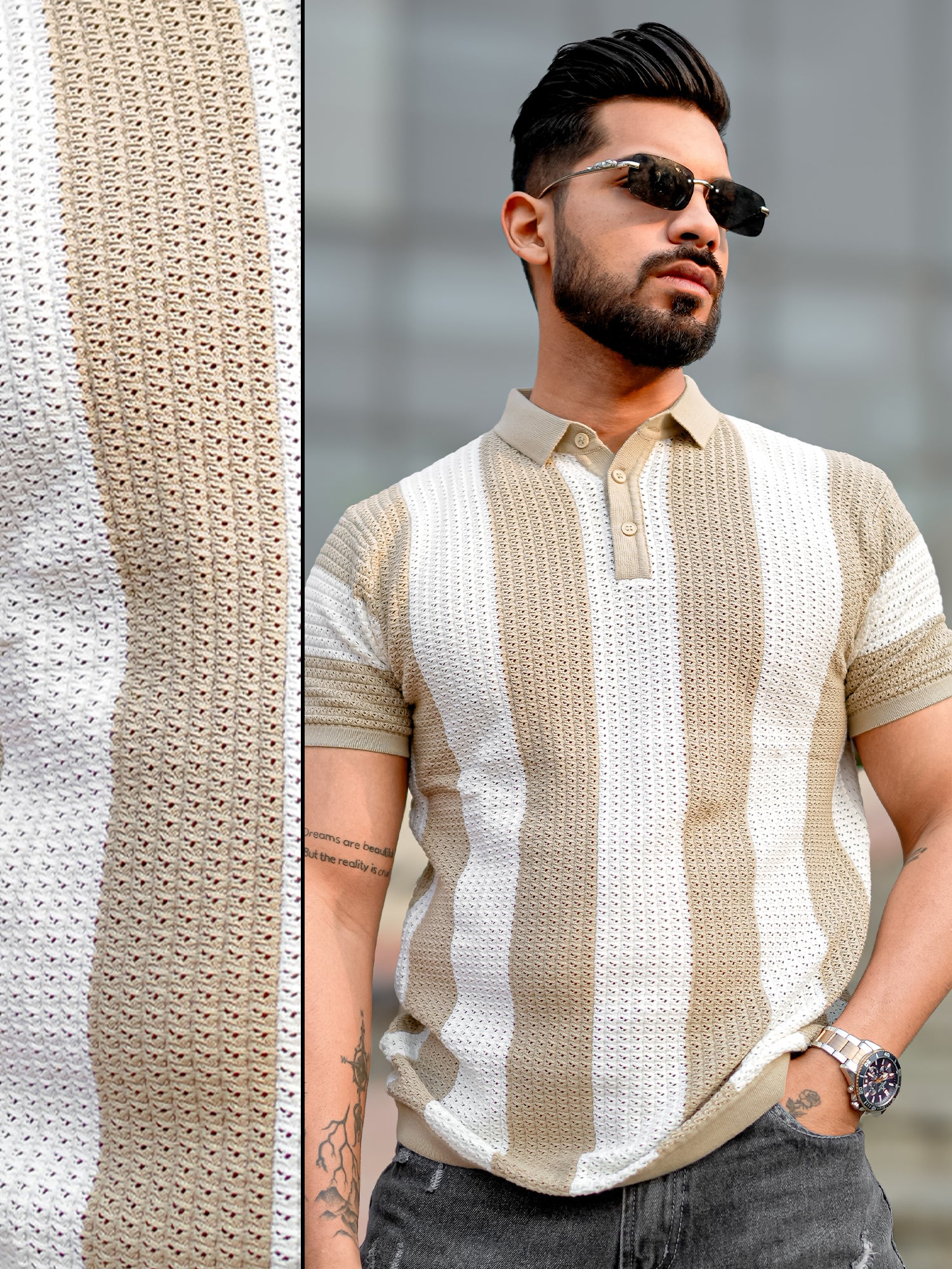 Vertical Stripe FlatKnit Cotton Beige Half Sleeve Polo T-Shirt