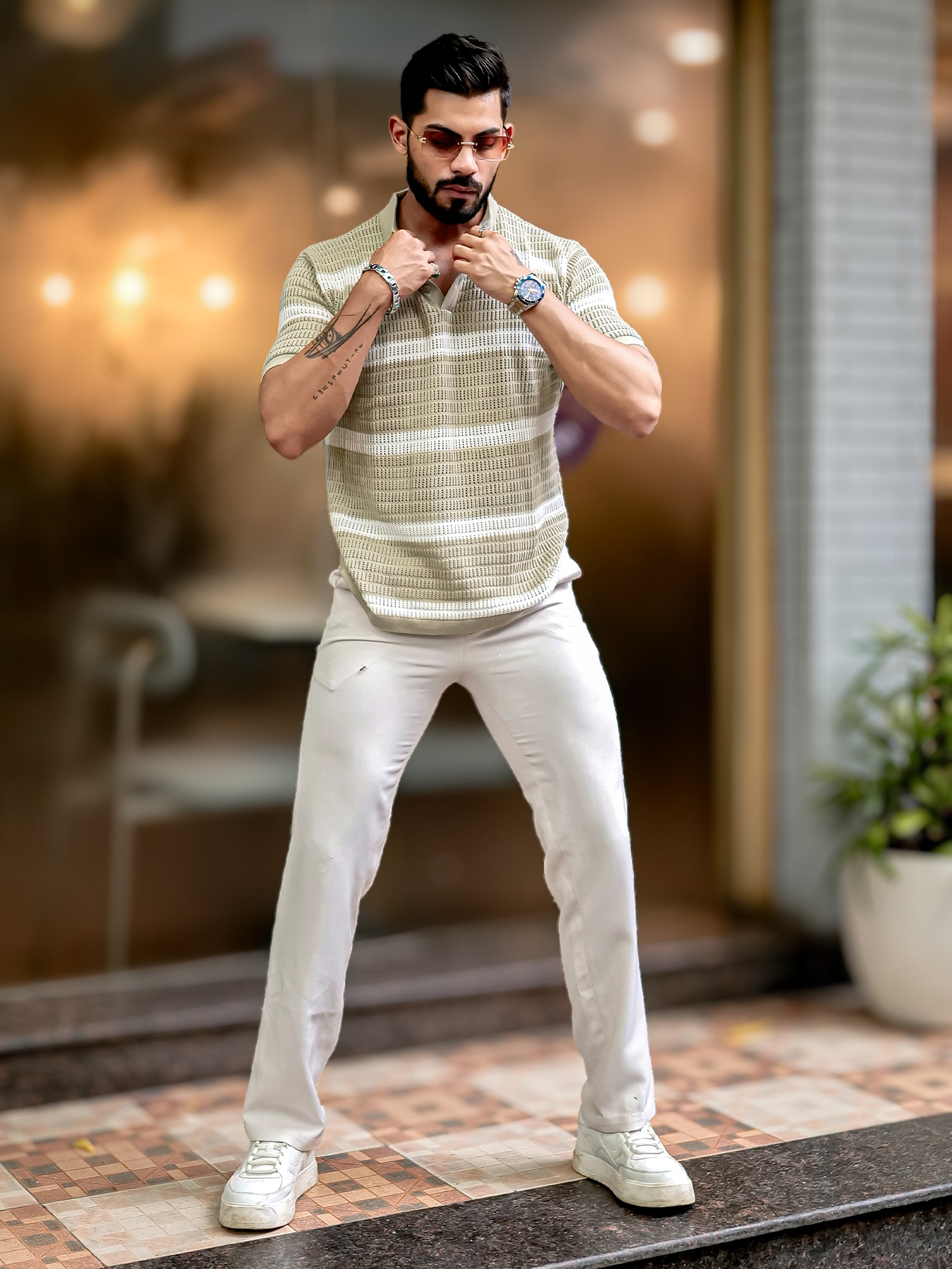 Sheer FlatKnit Cotton Beige Polo T-Shirt
