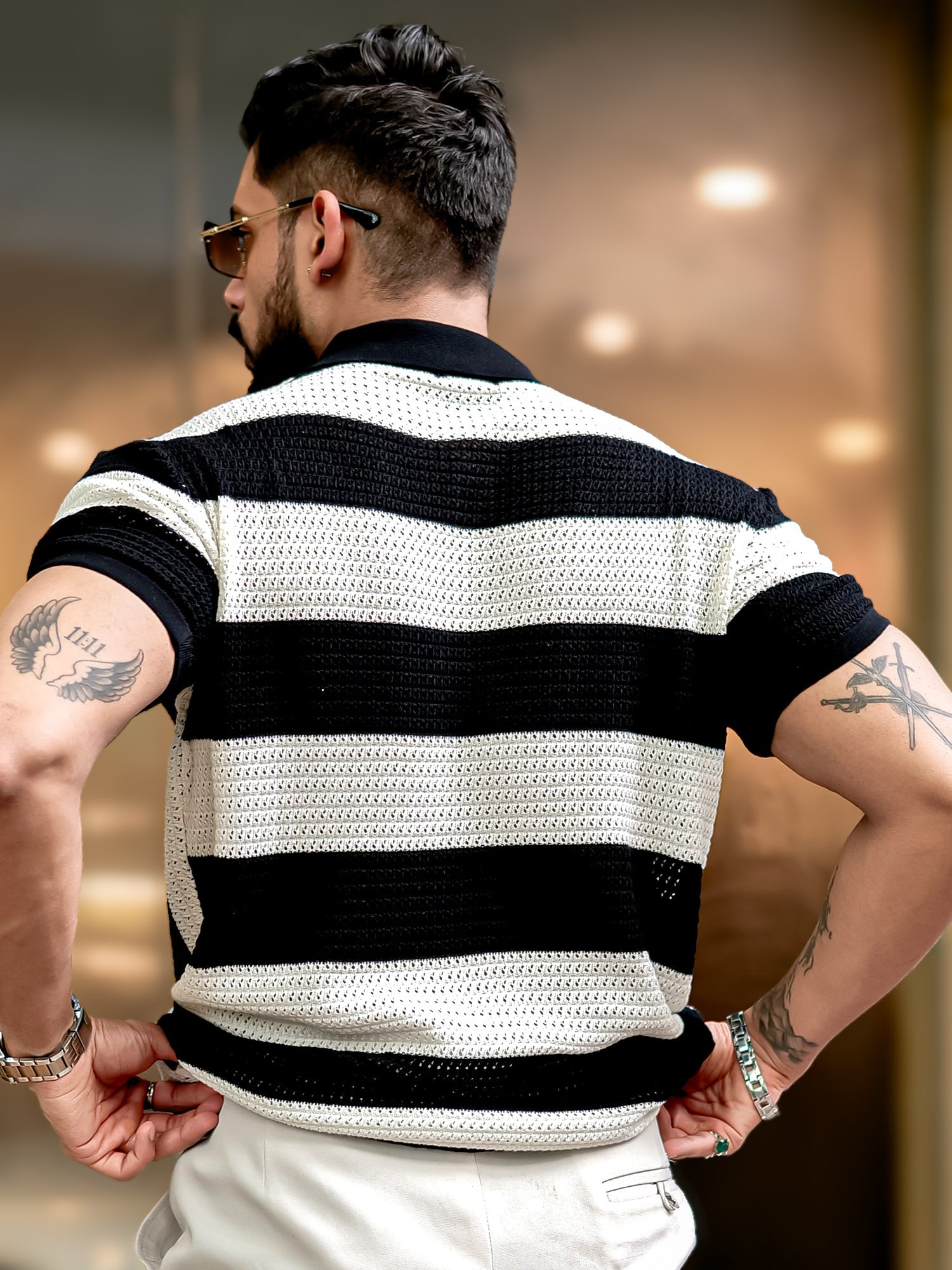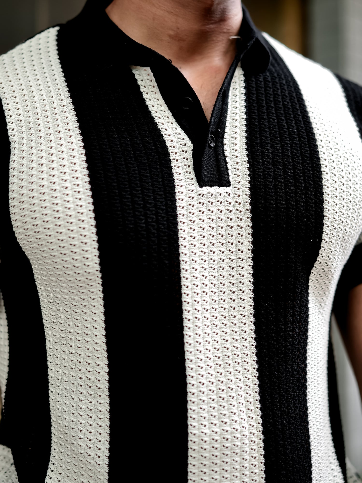 Vertical Stripe FlatKnit Cotton Black Half Sleeve Polo T-Shirt