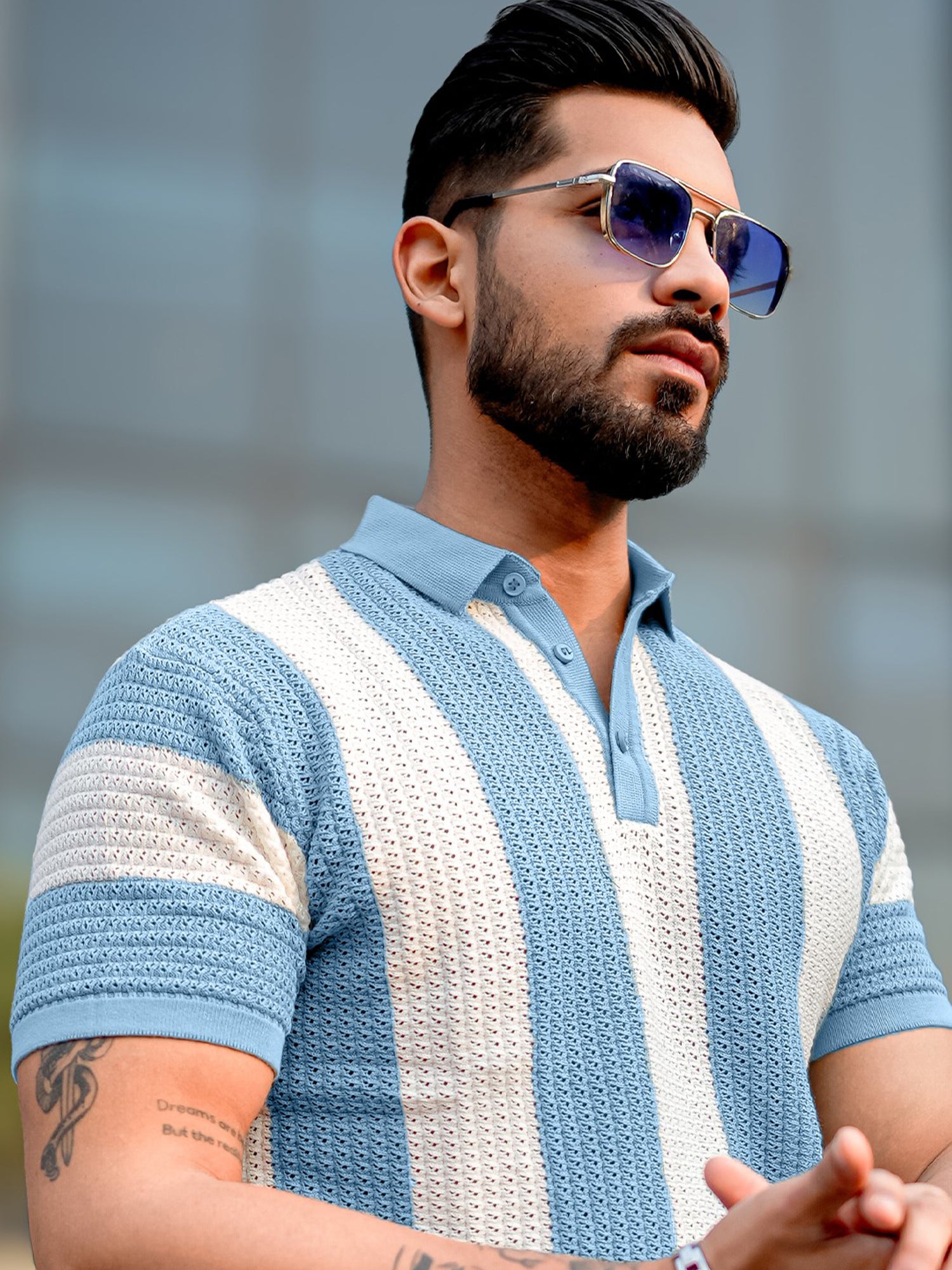 Vertical Stripe FlatKnit Cotton Blue Half Sleeve Polo T-Shirt