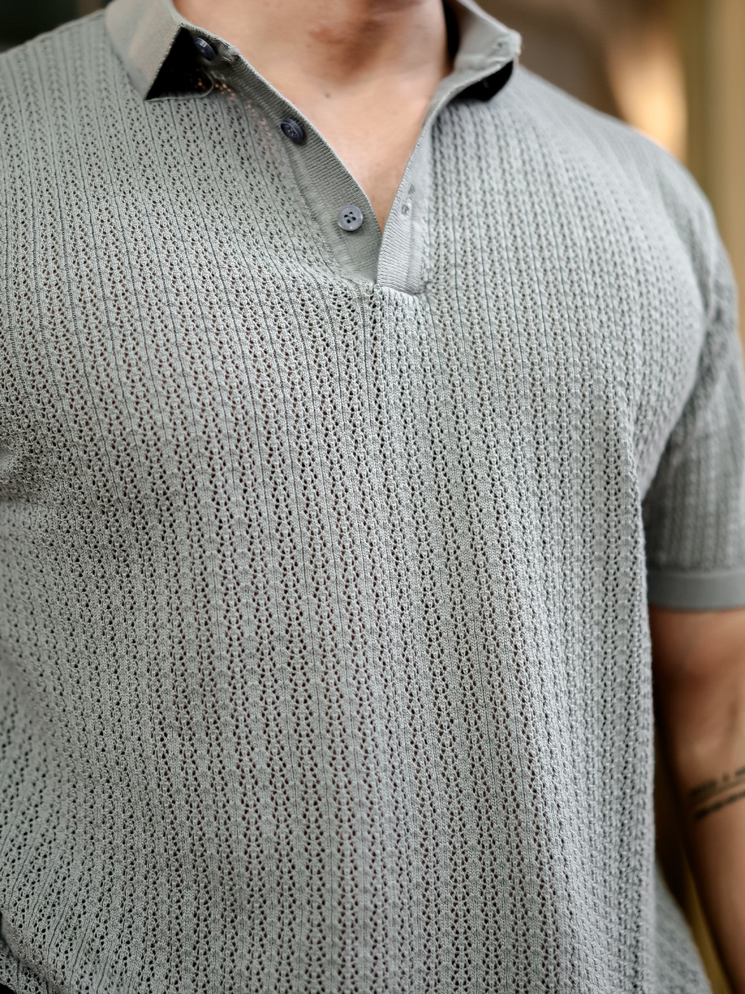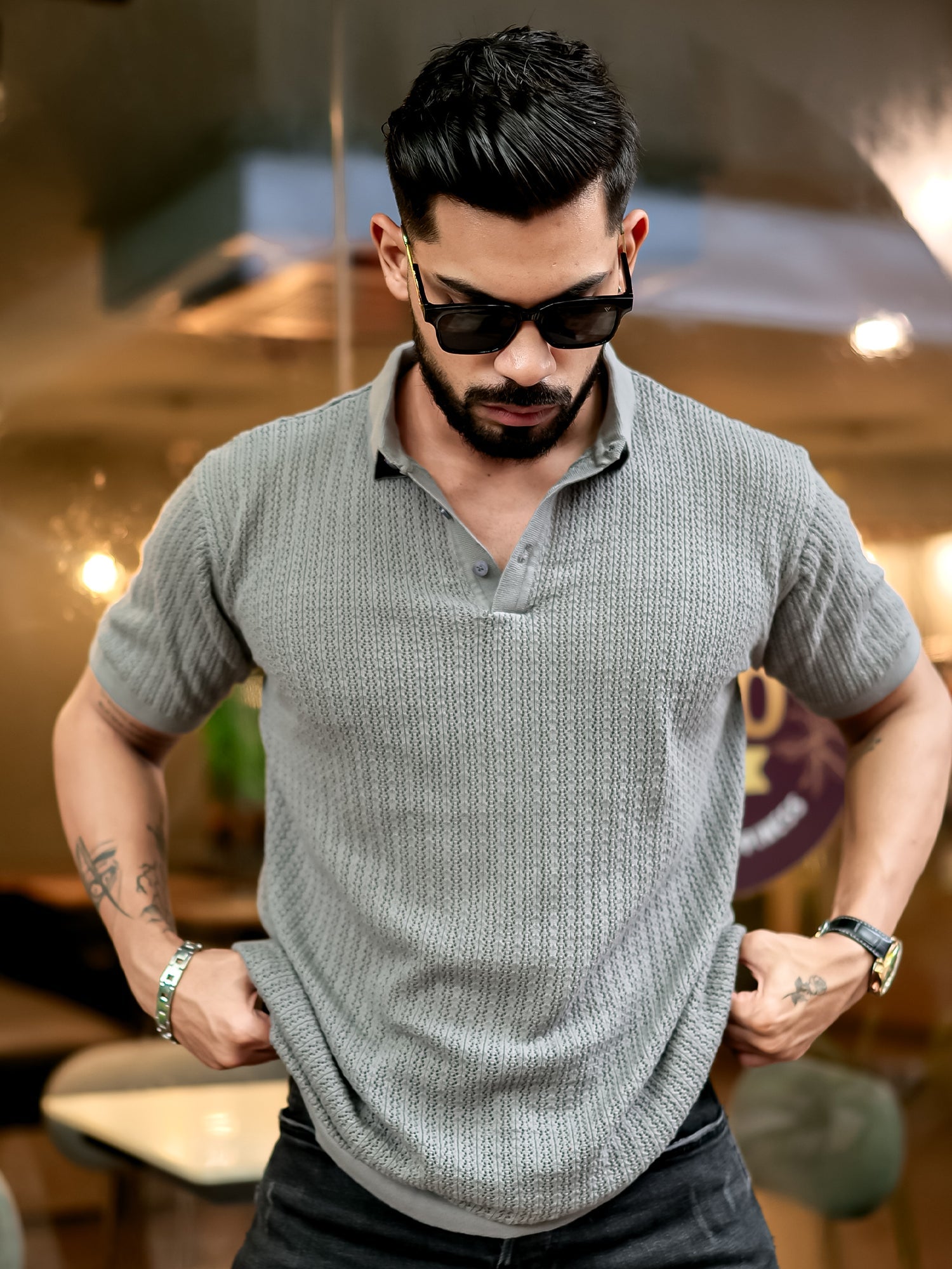 Classic Rib Knit Grey Polo Half Sleeve T-Shirt