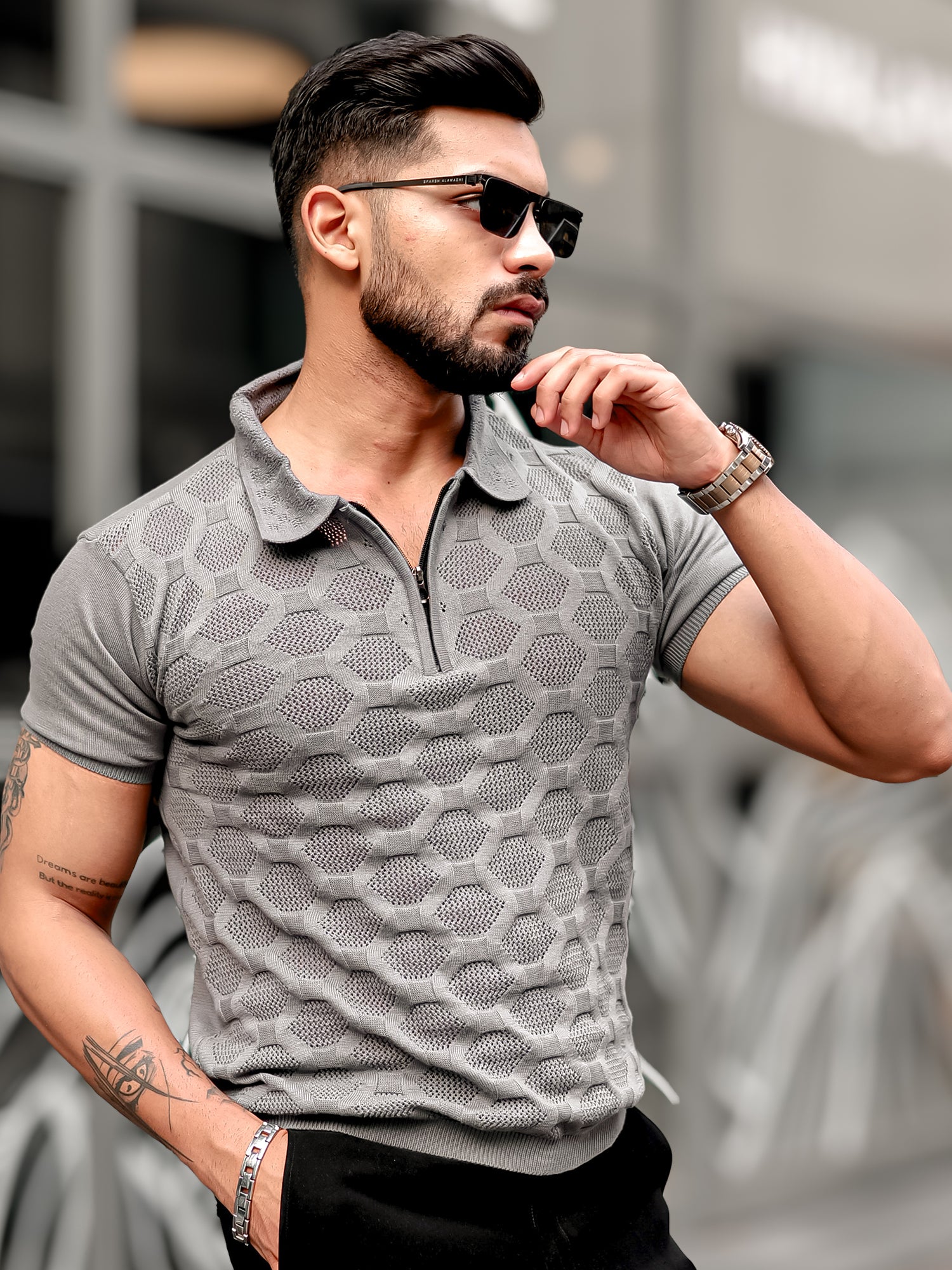 Diamond Knit Dark Grey Slim Half Sleeve Polo T-Shirt