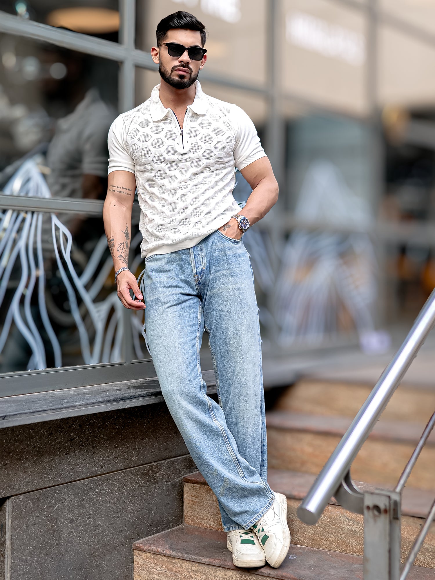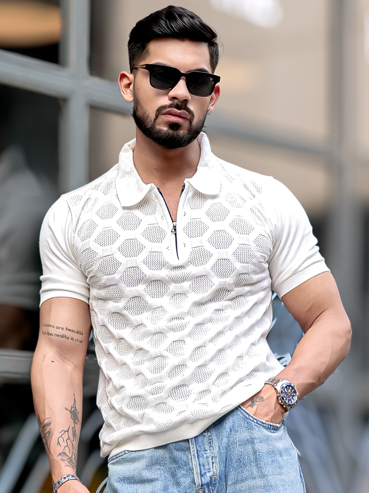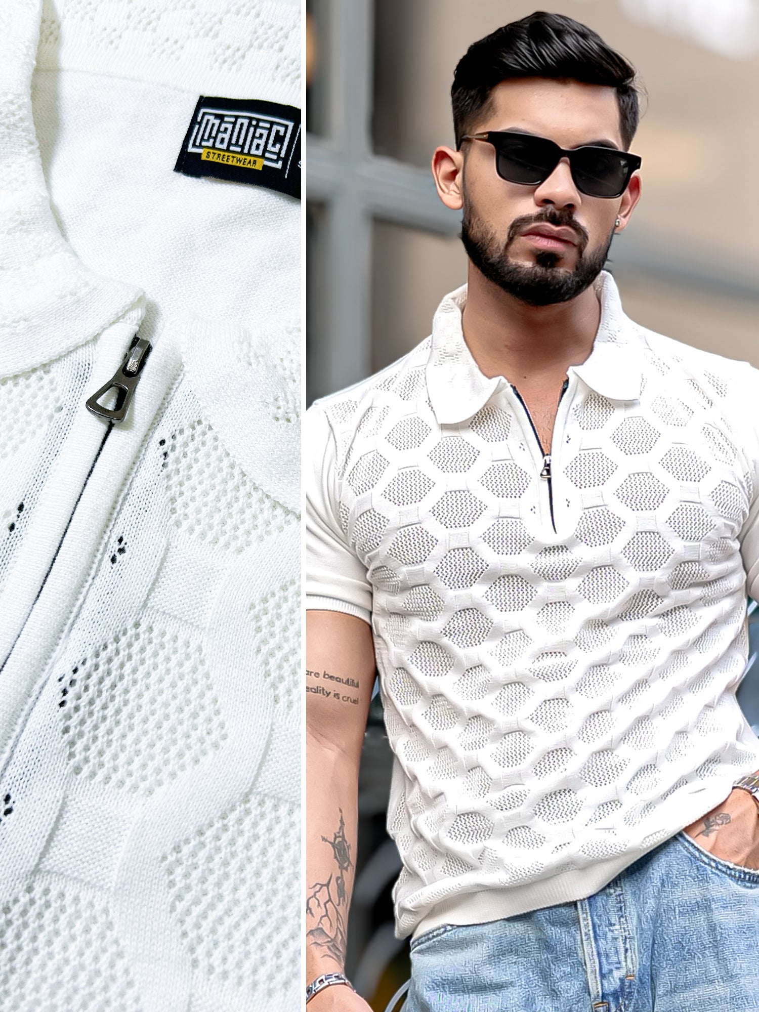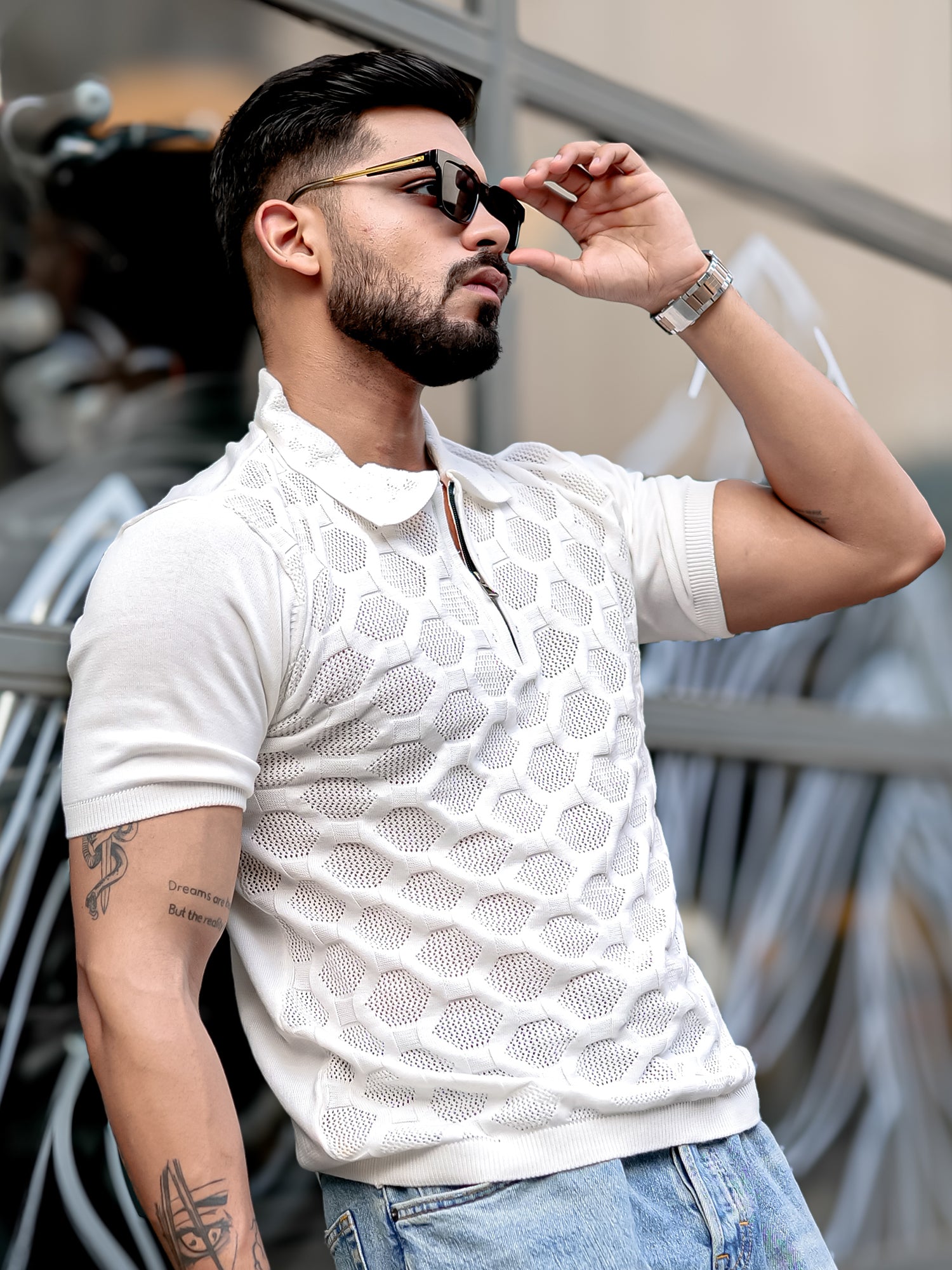 Diamond Knit White Slim Half Sleeve Polo T-Shirt