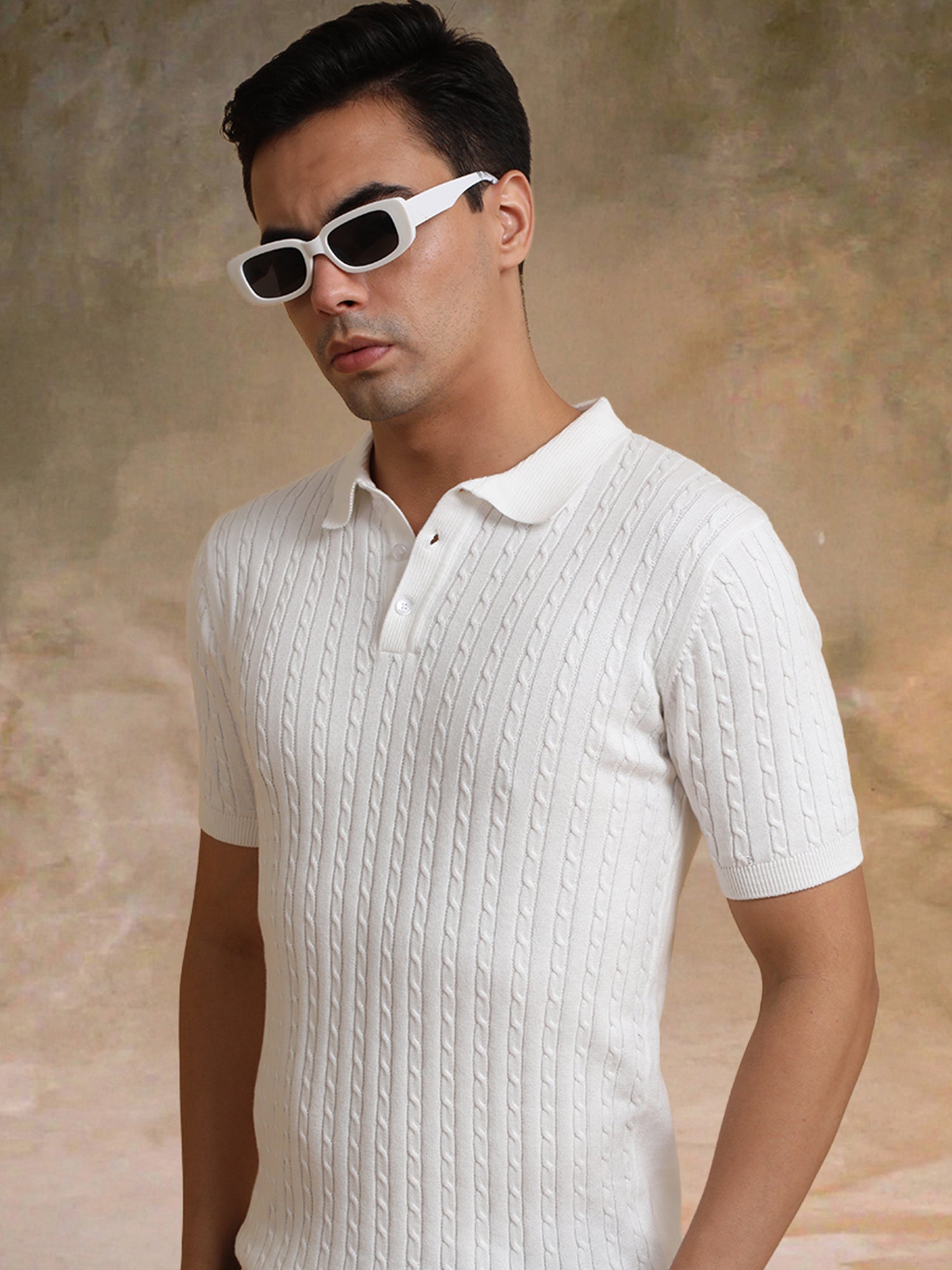 Ribbed Knit White Polo Half Sleeve T-Shirt