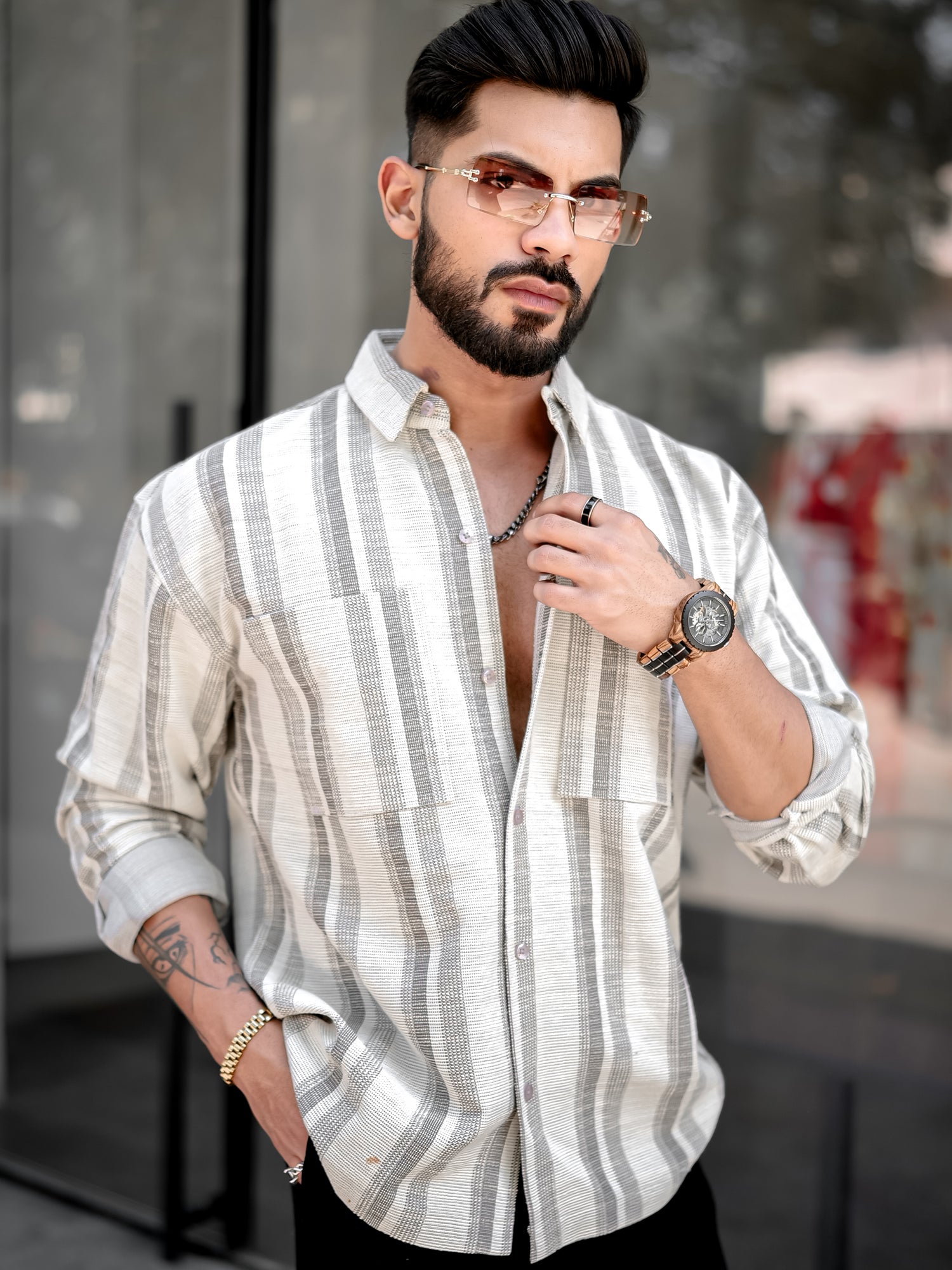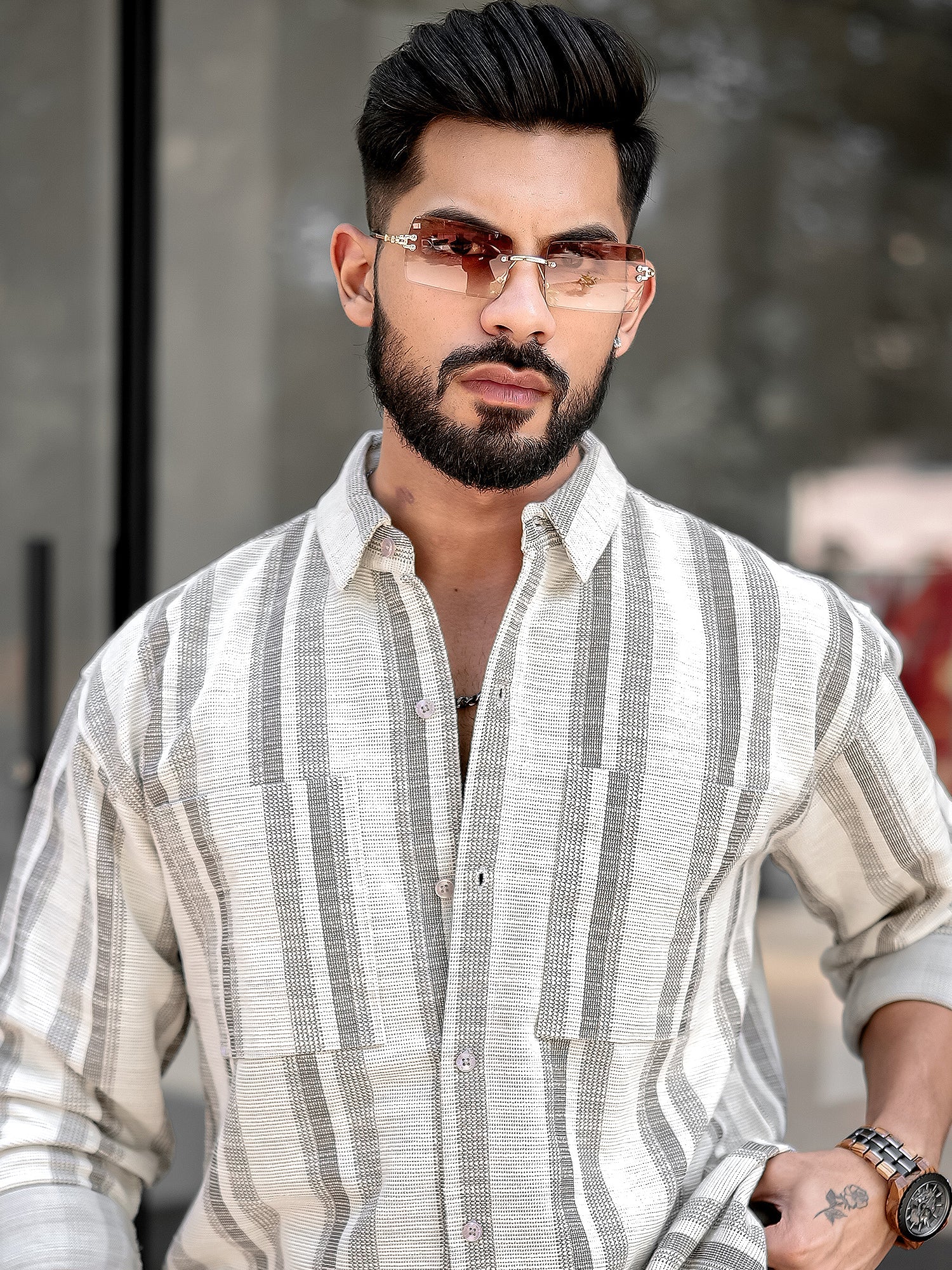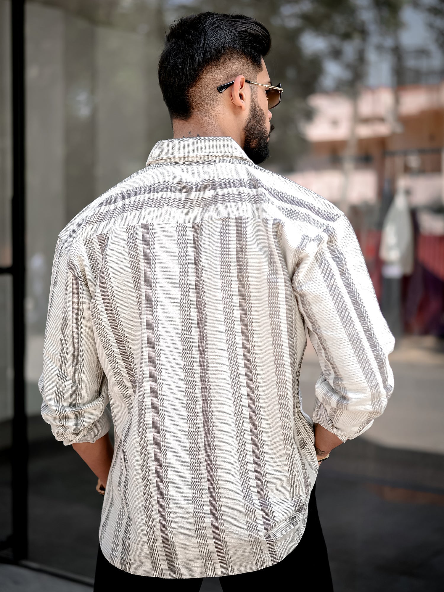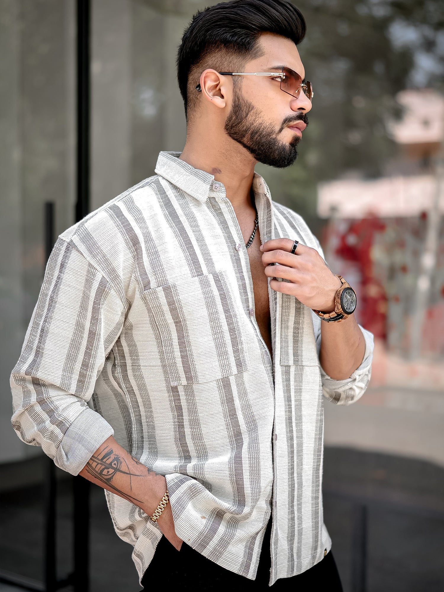 Tweed Vertical Stripe Half White Double Pocket Full Sleeve Shirt