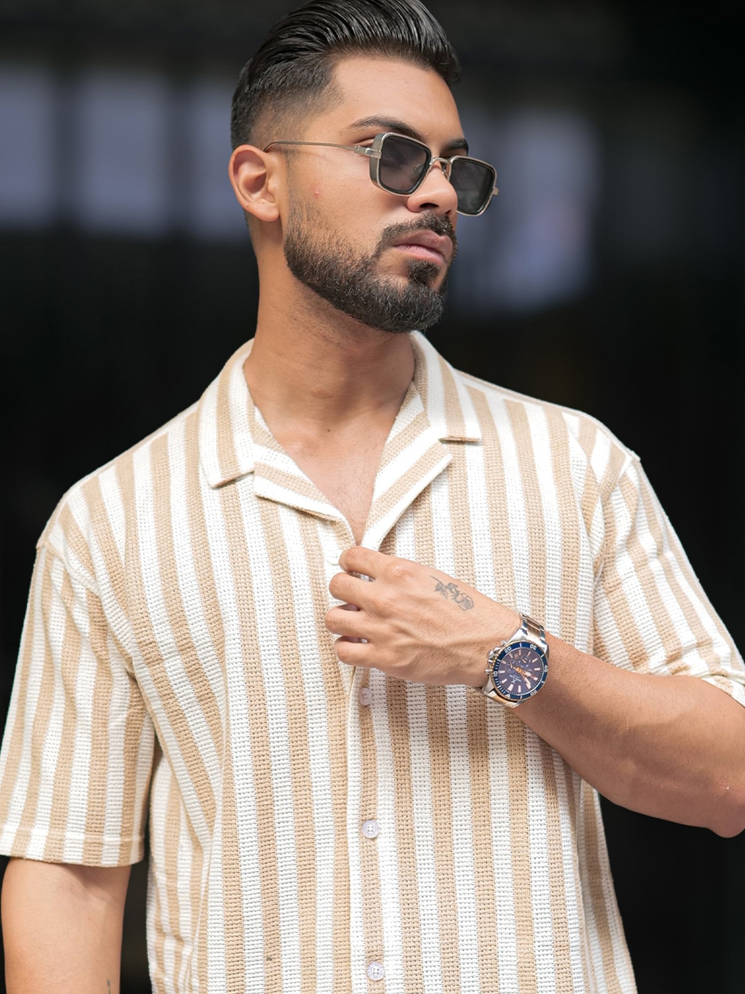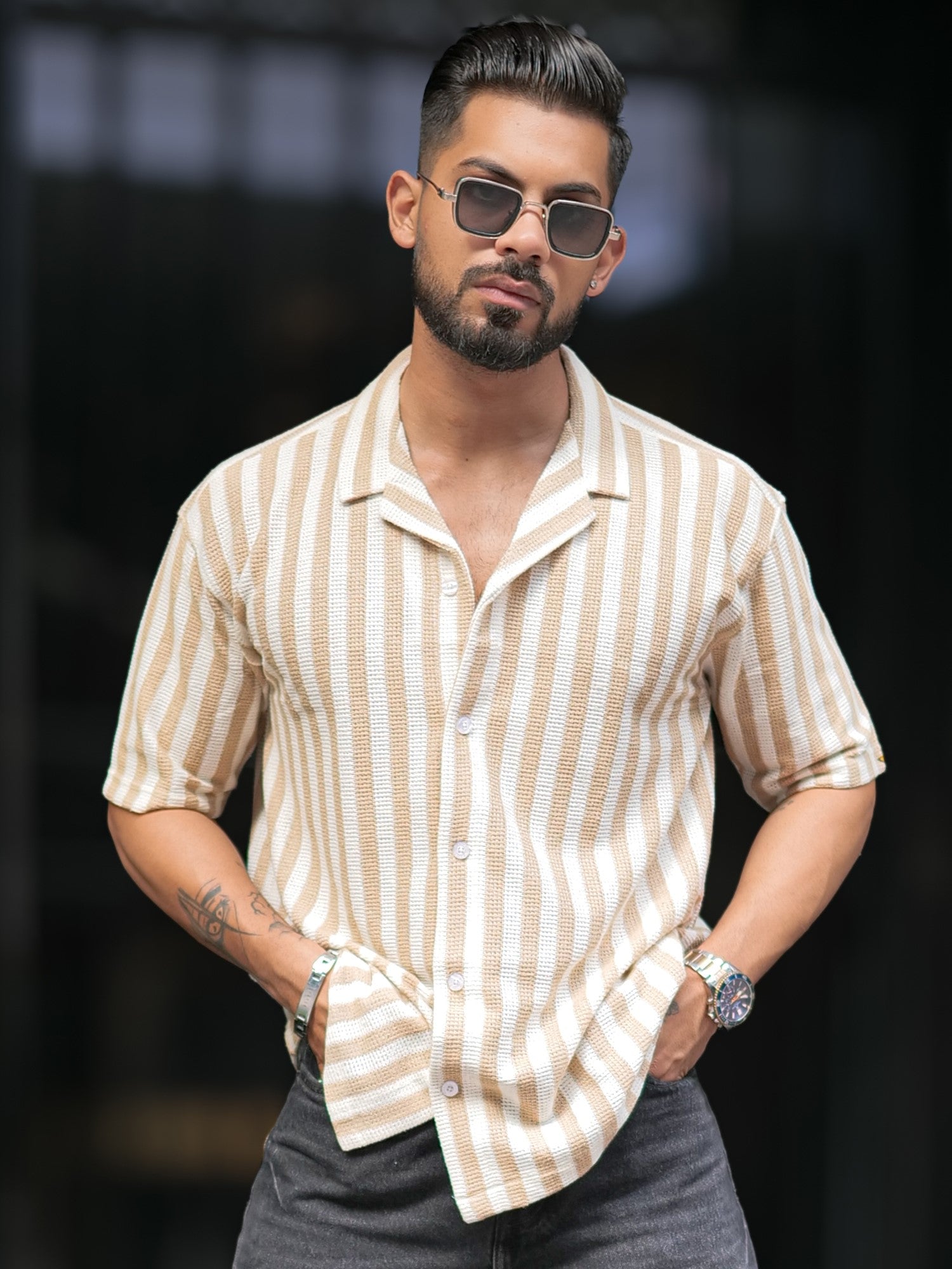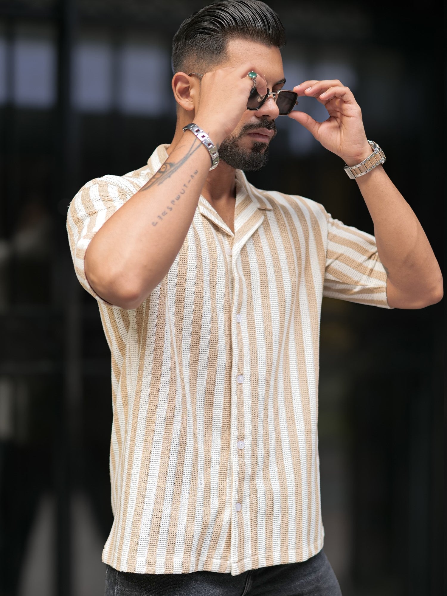 Waffle Flatknit Cotton Beige Half Sleeve Shirt