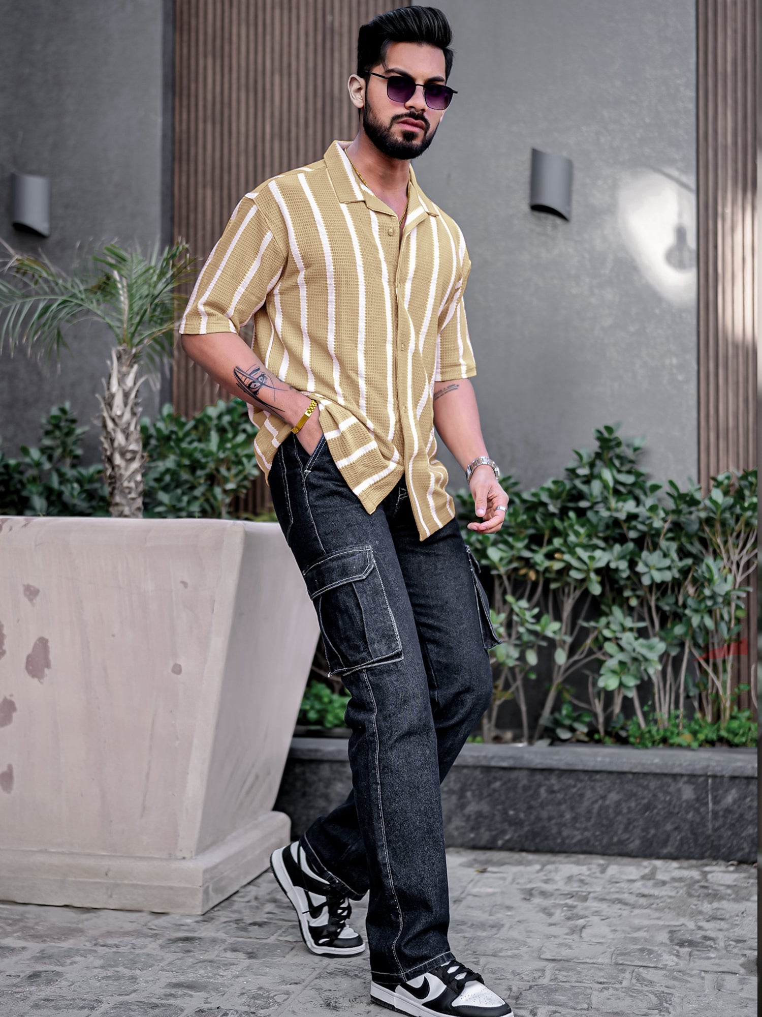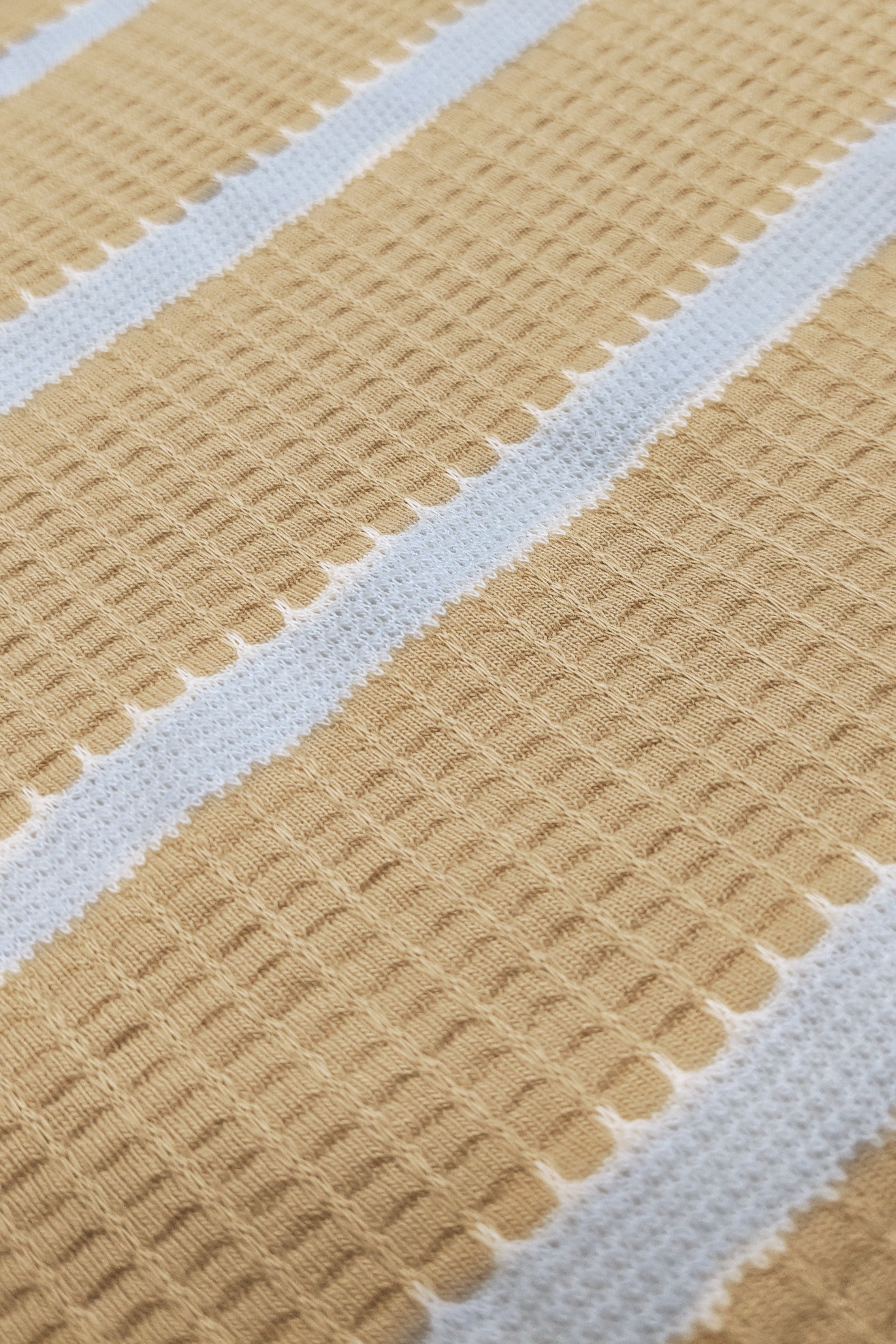 Popcorn Knit Vertical Stripe Beige Half Sleeve Shirt