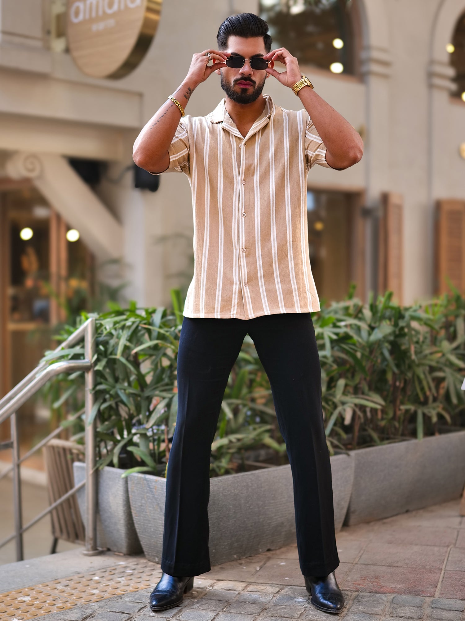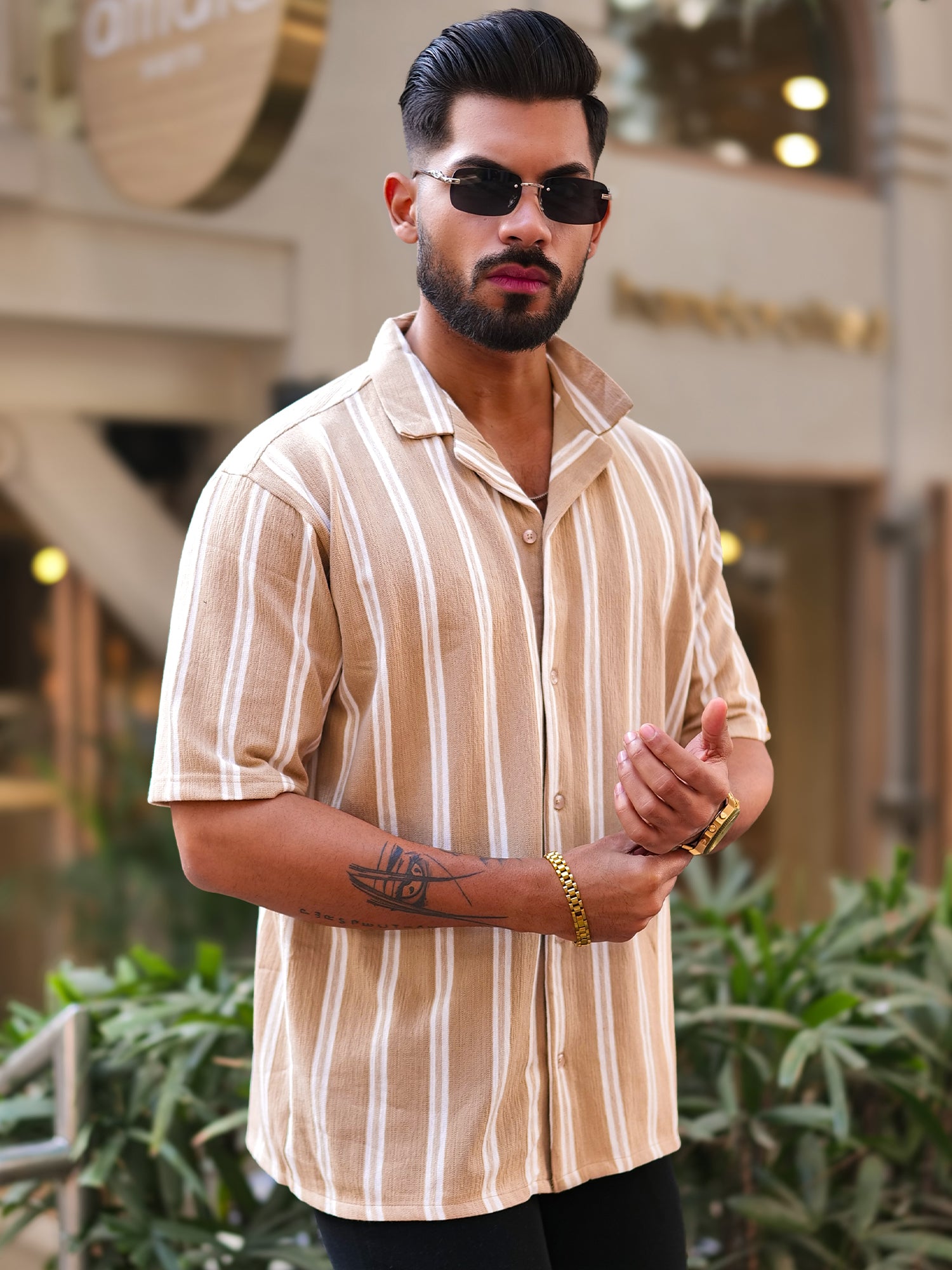 Terry Vertical Stripes Beige Half Sleeve Shirt