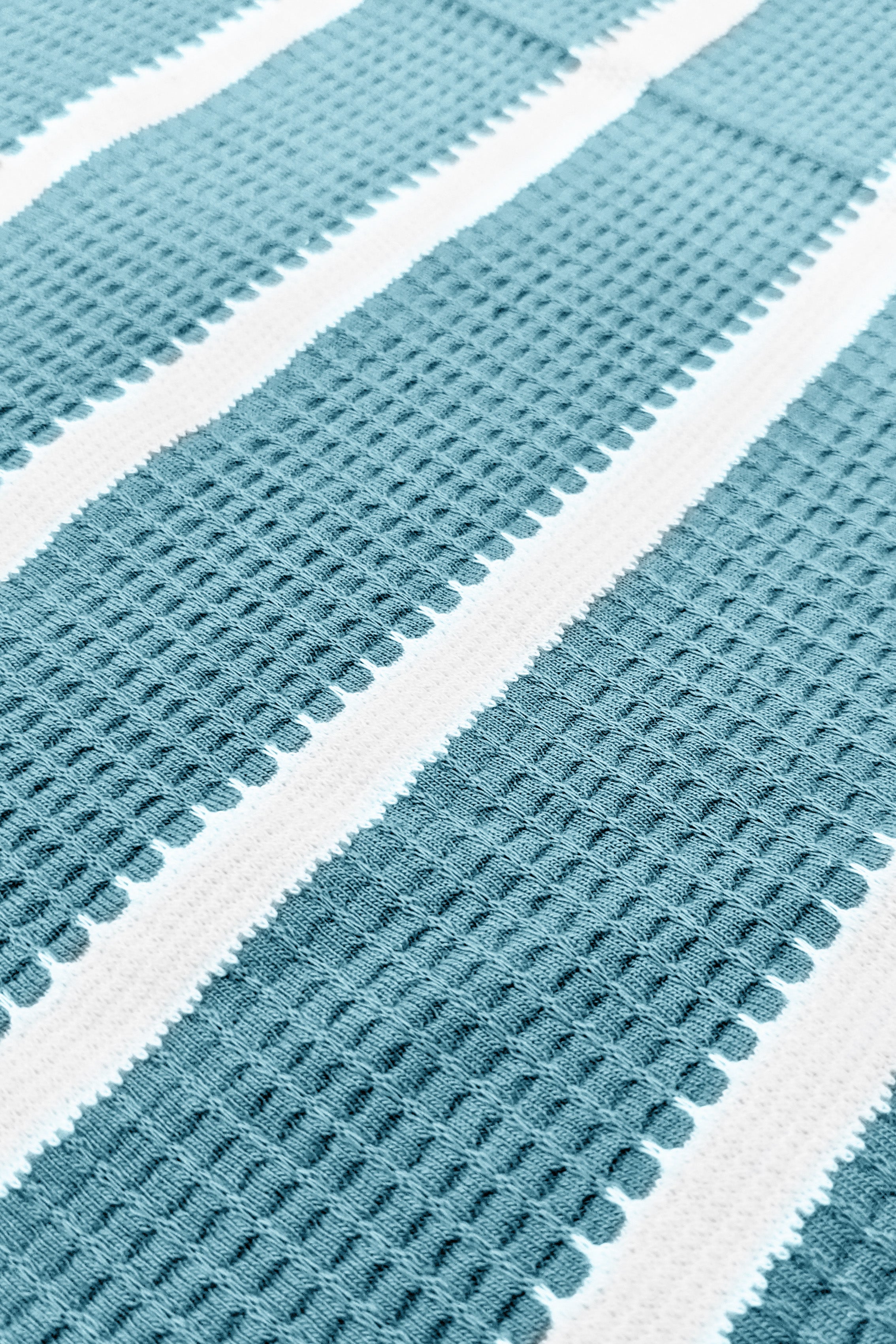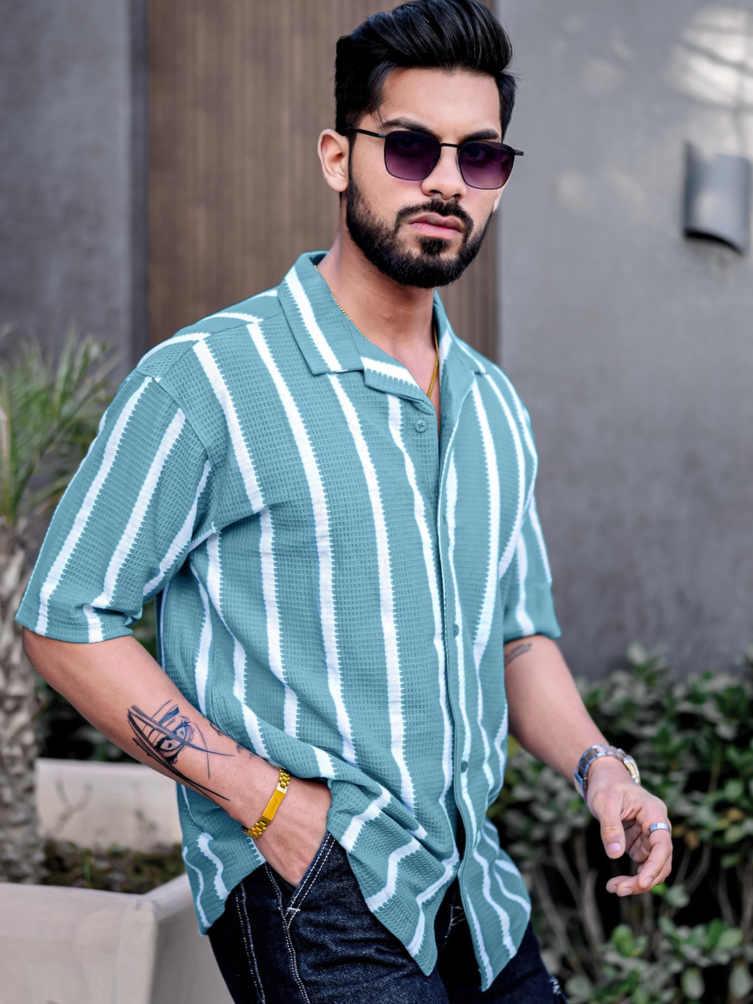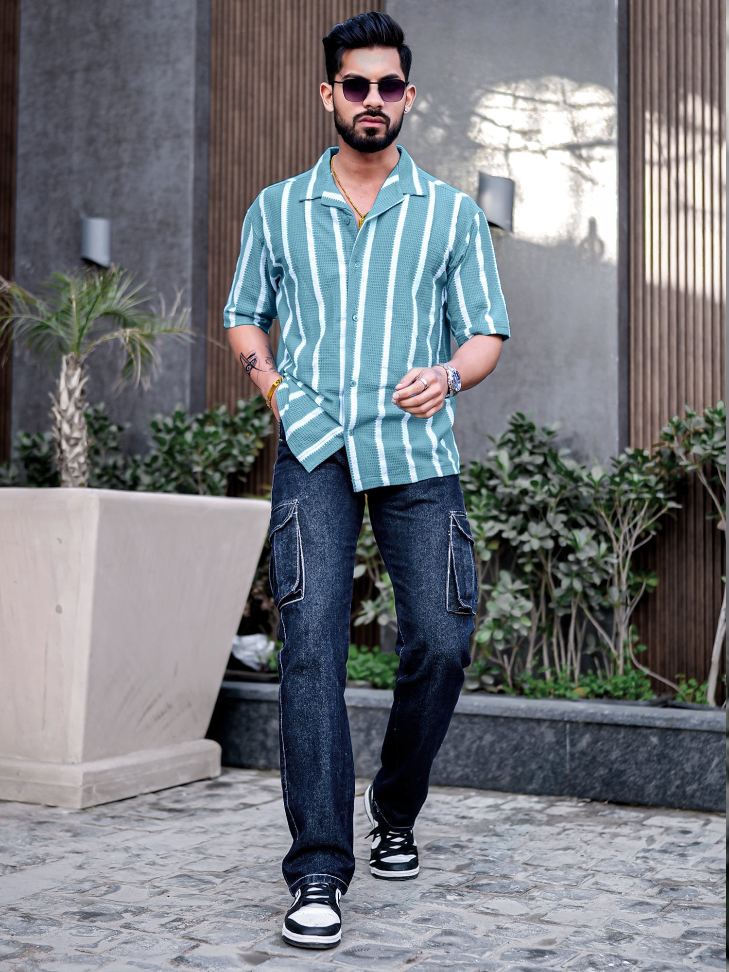 Popcorn Knit Vertical Stripe Blue Half Sleeve Shirt