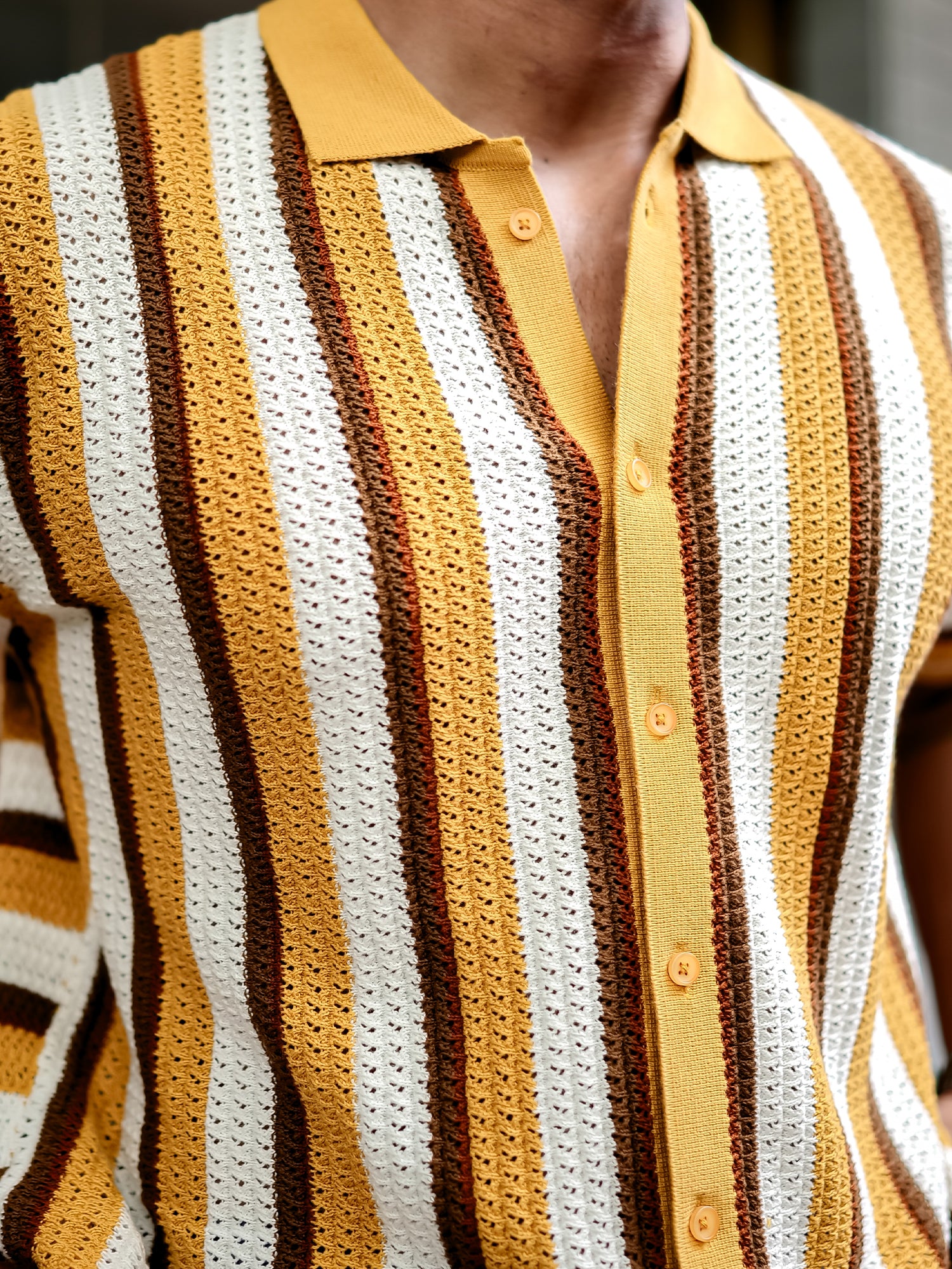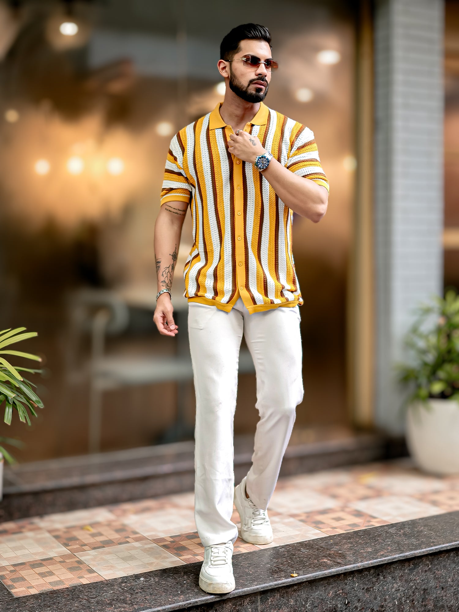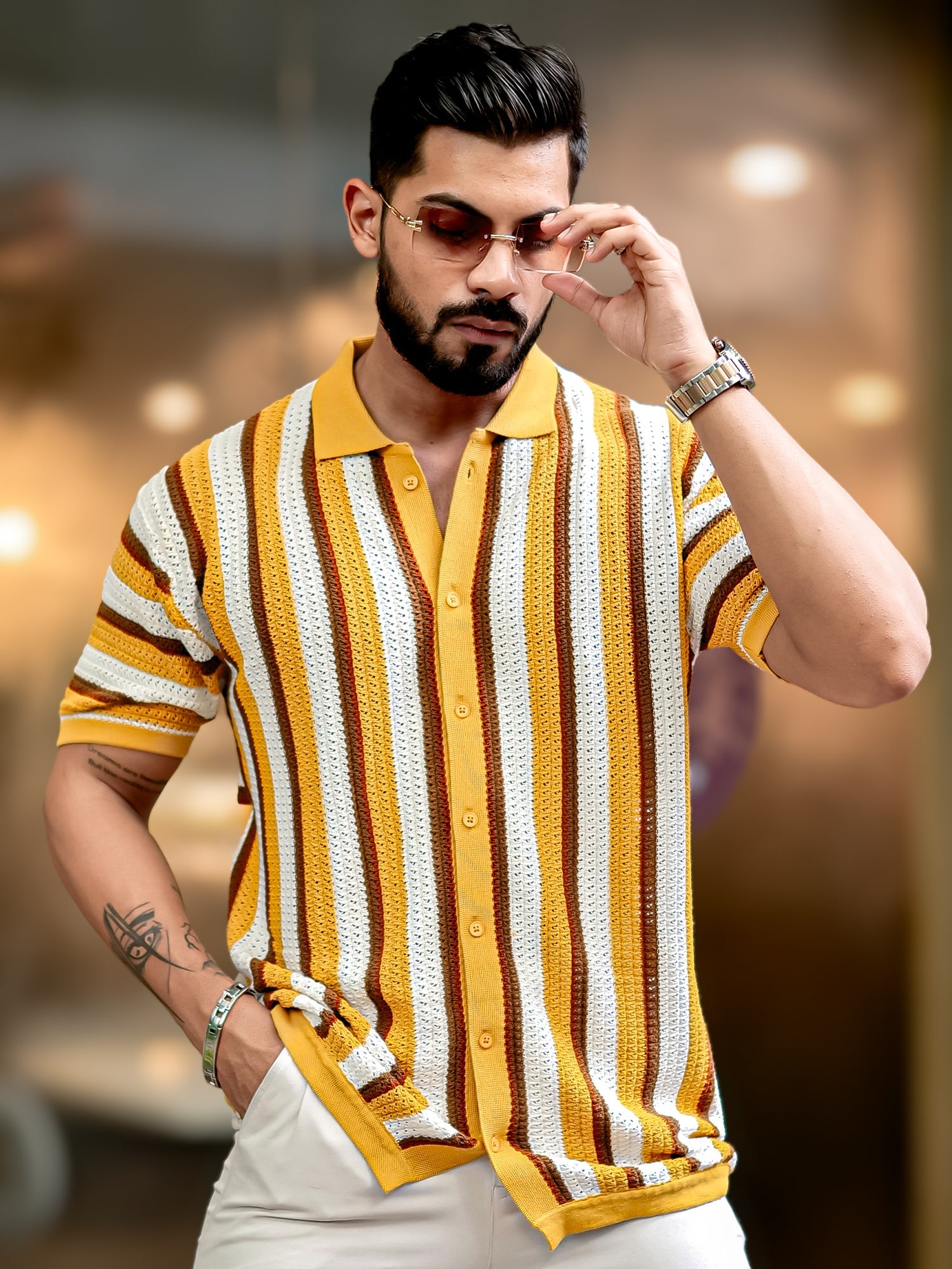 Vertical Stripe FlatKnit Cotton Mustard Half Sleeve Shirt