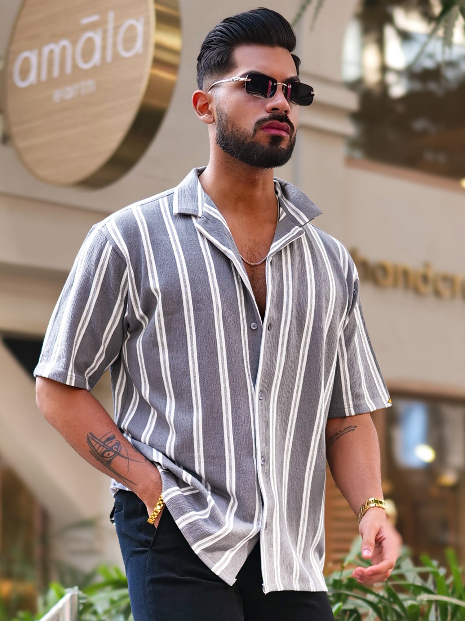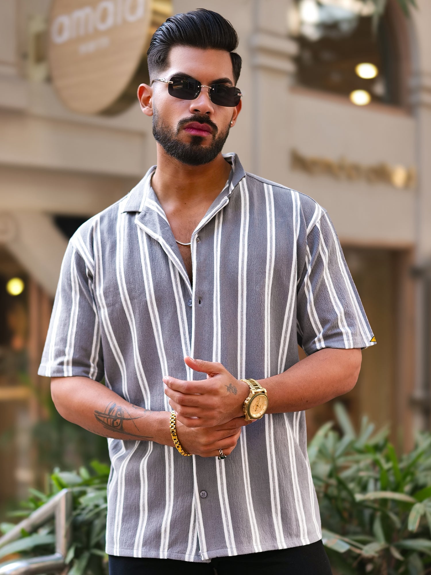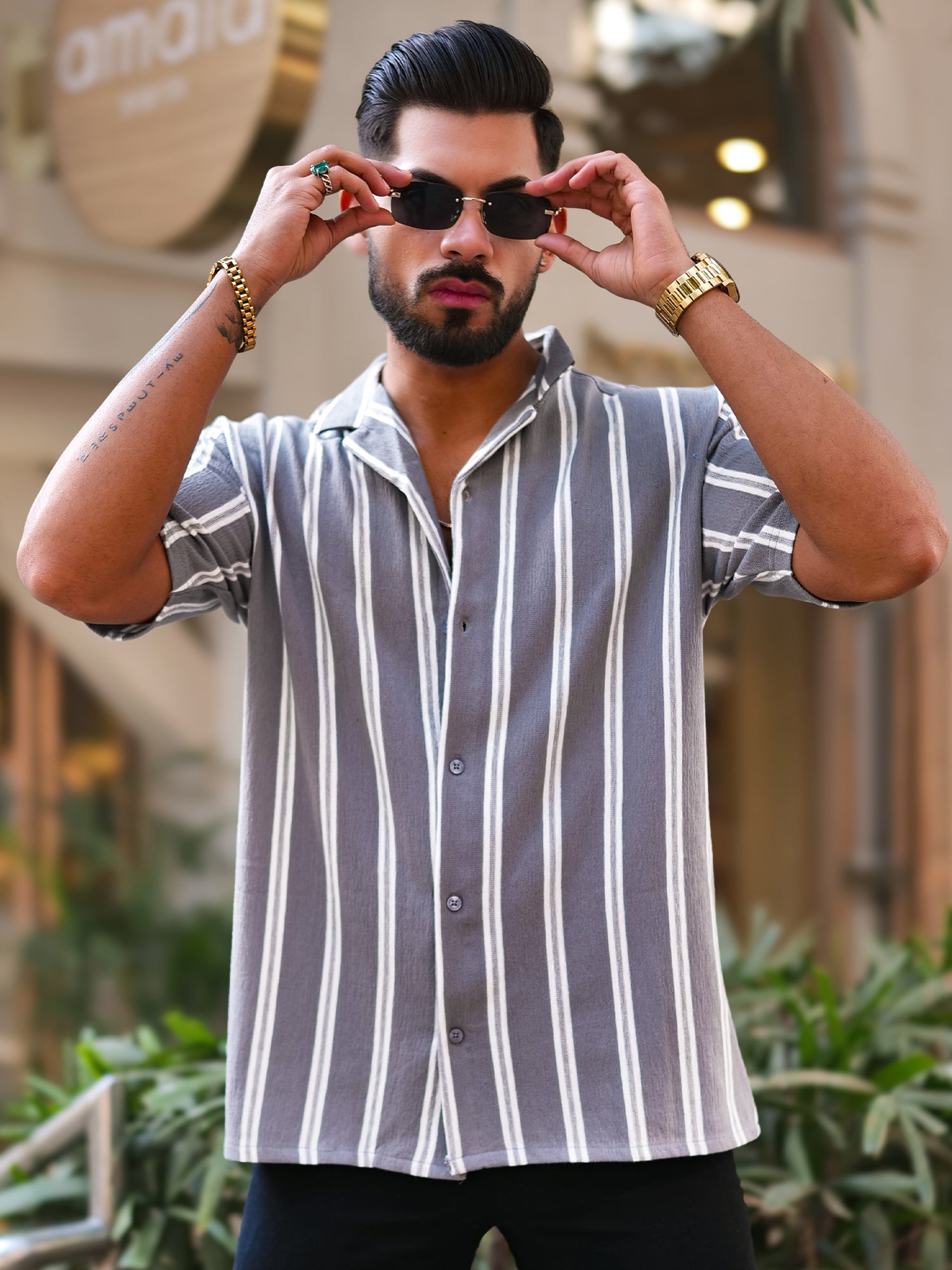Terry Vertical Stripes Grey Half Sleeve Shirt