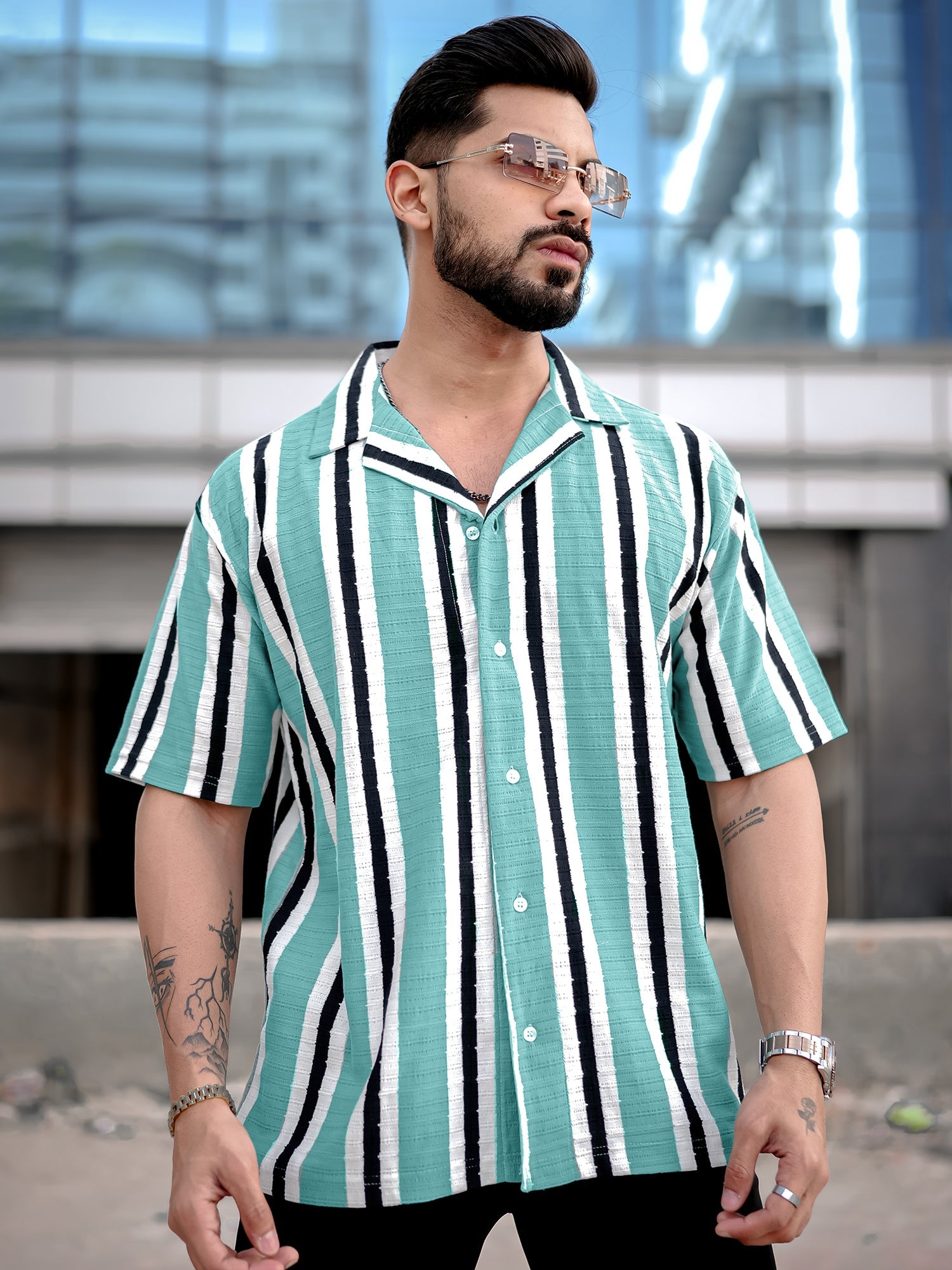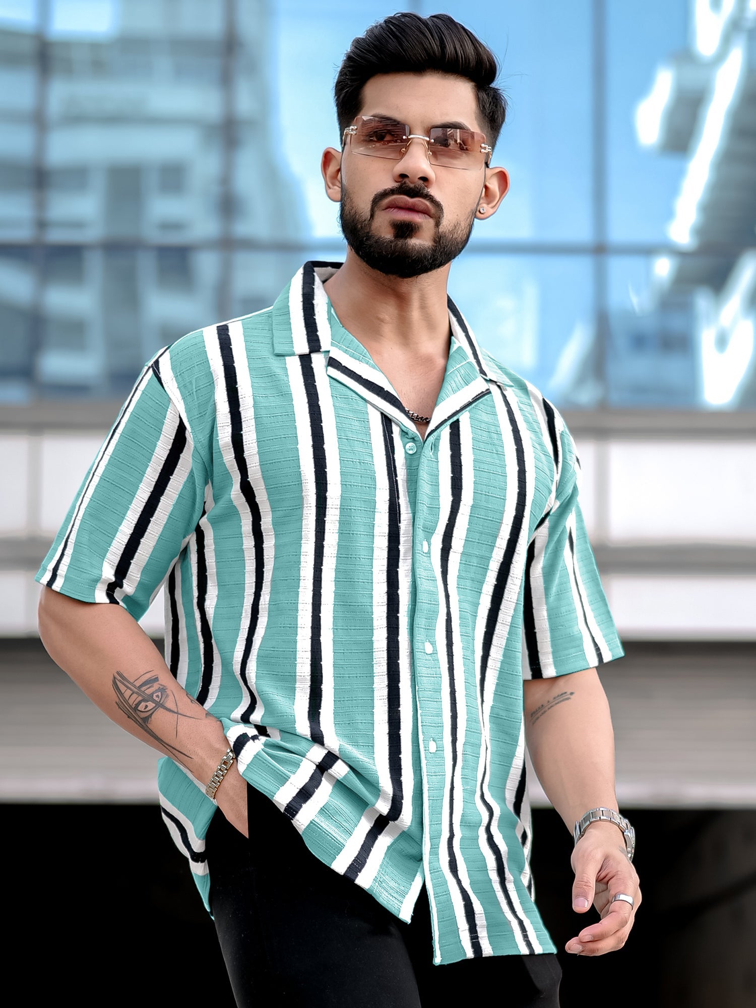 Vertical Jacquard Knit SeaBlue Half Sleeve Shirt