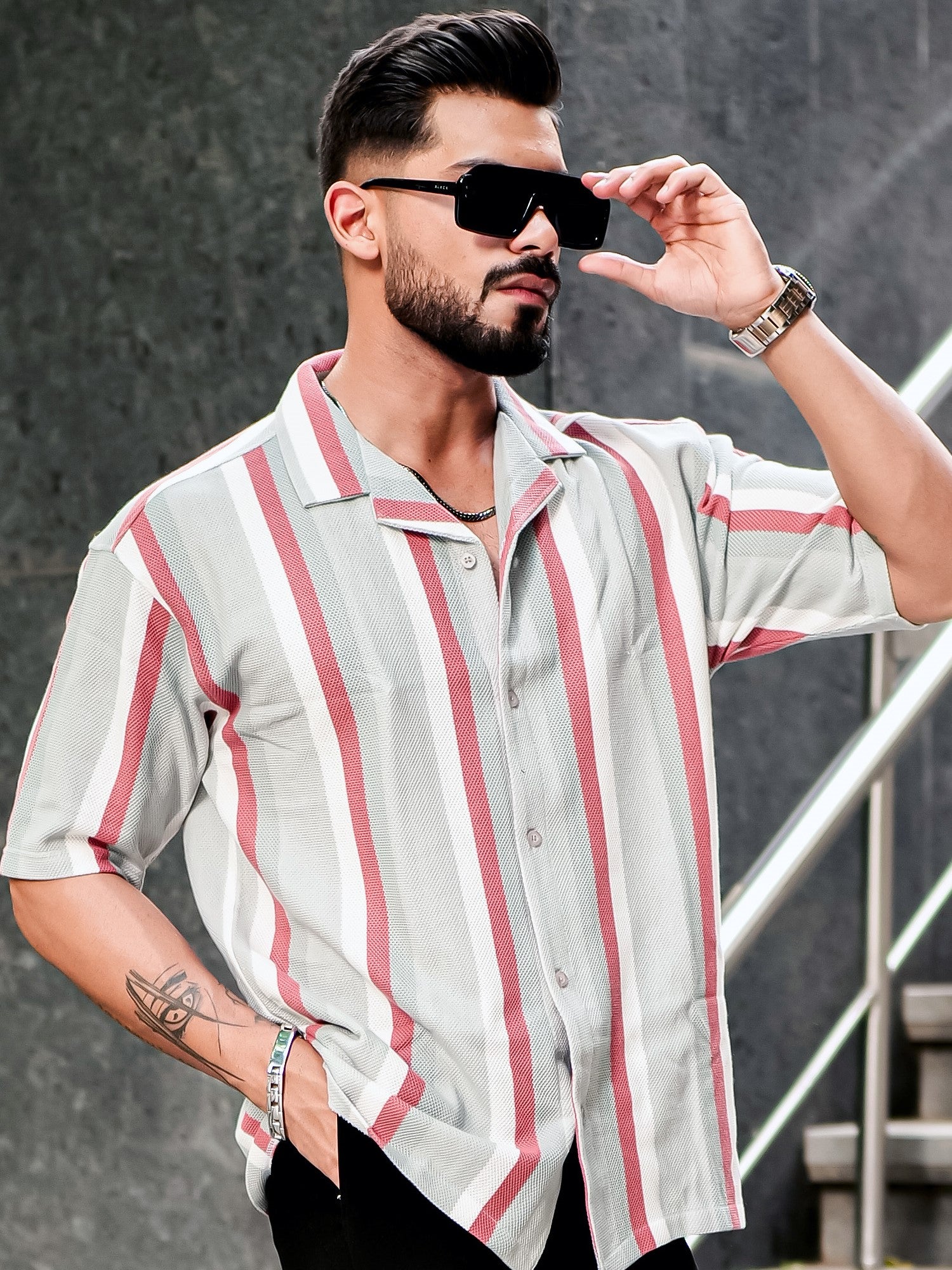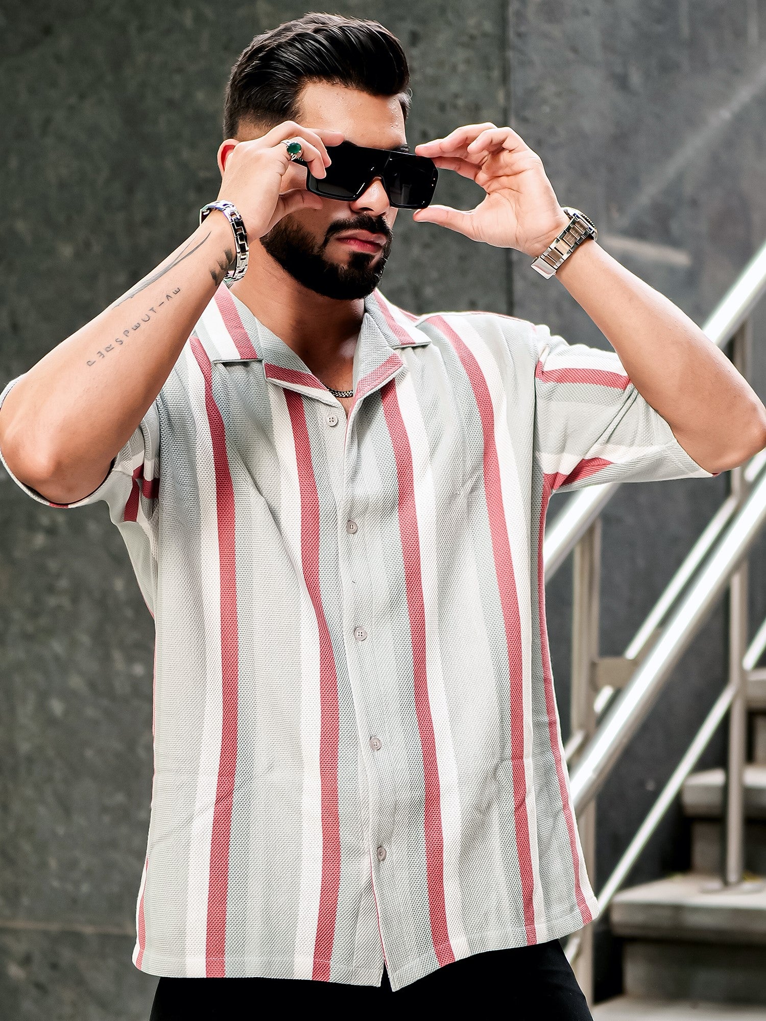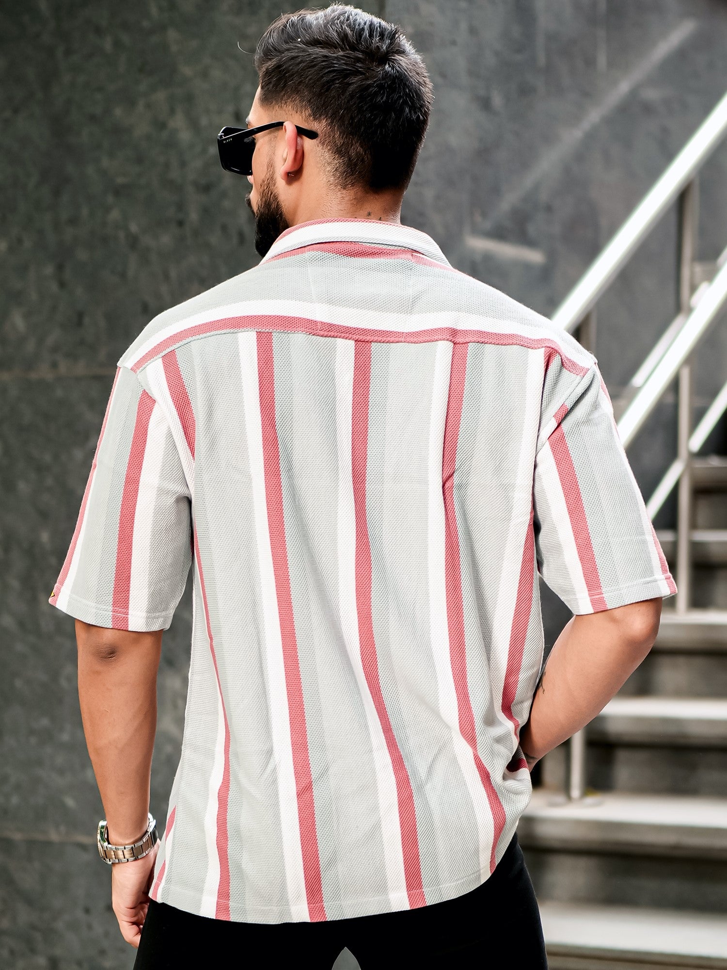 Roman Stripe Silver Grey Half Sleeve Shirt