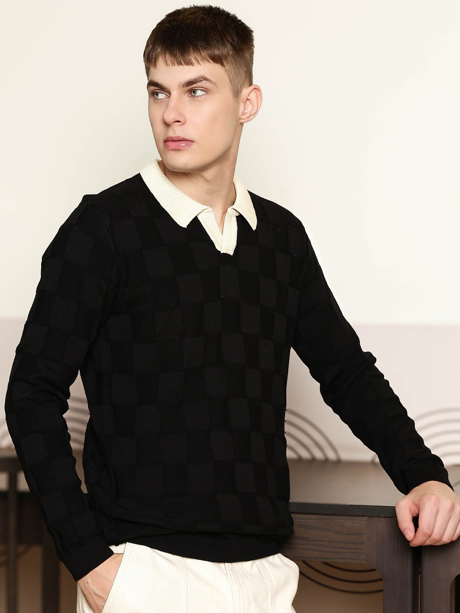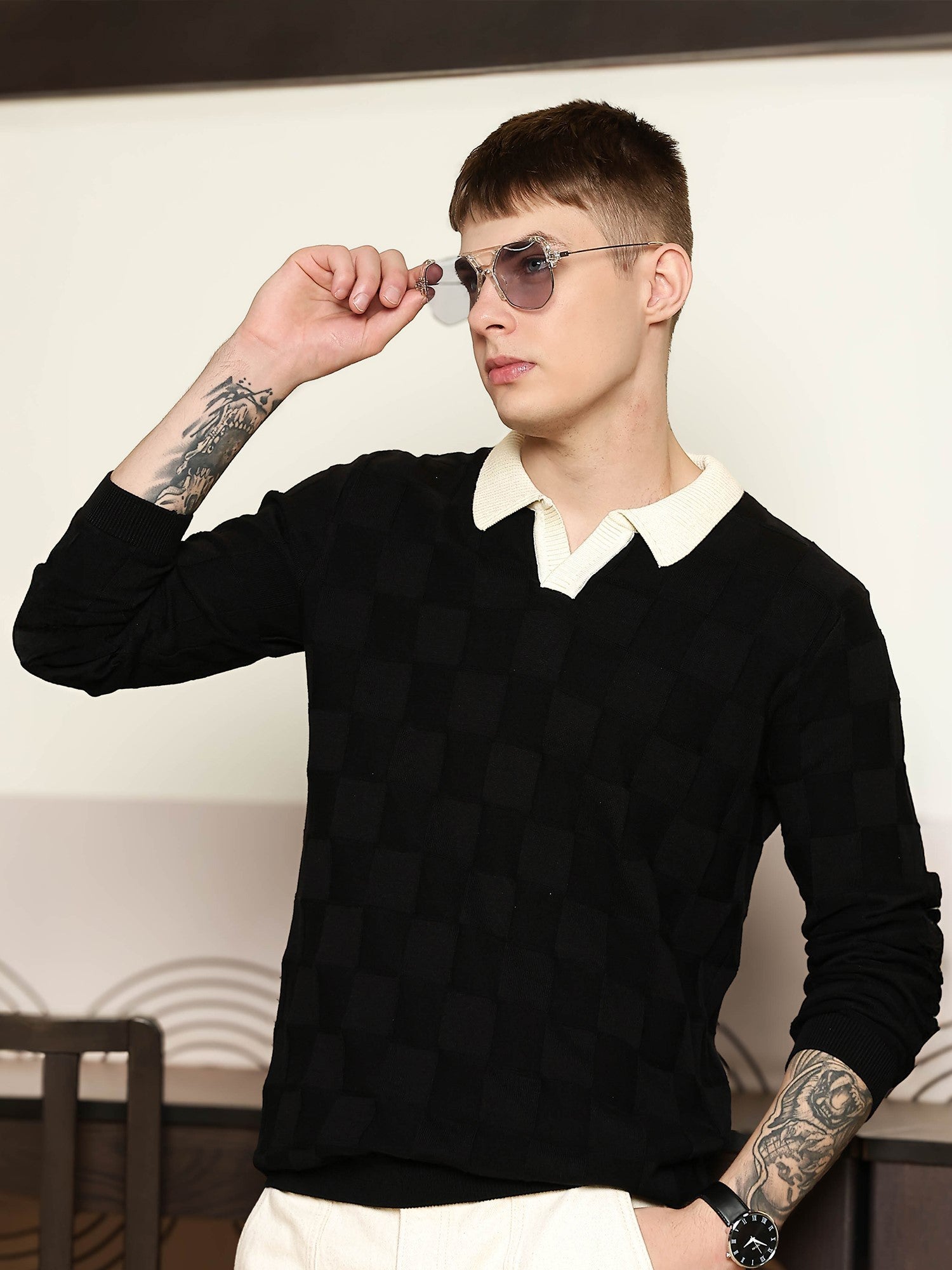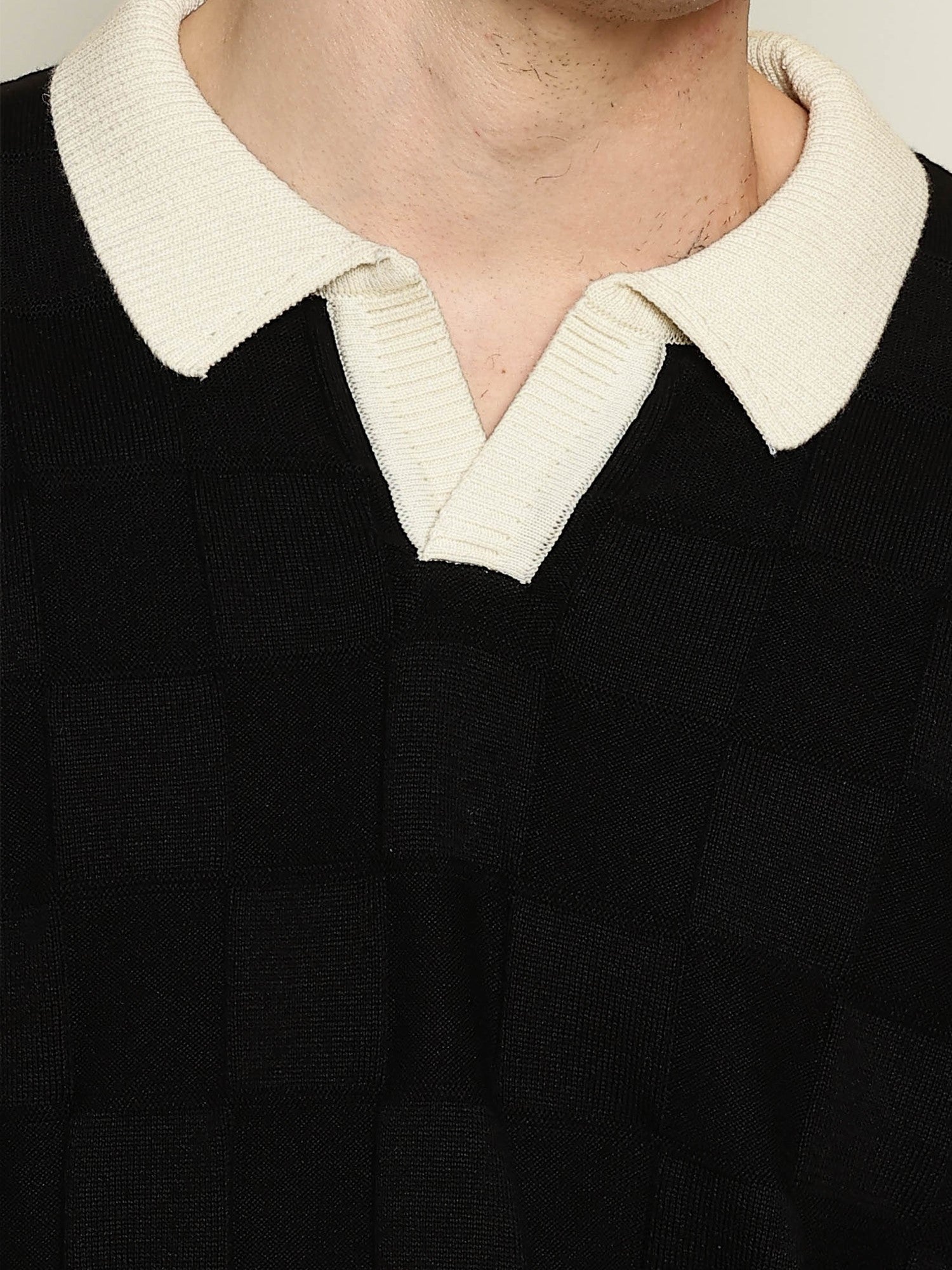 Cubic Knit Black Full Sleeve Polo T-Shirt