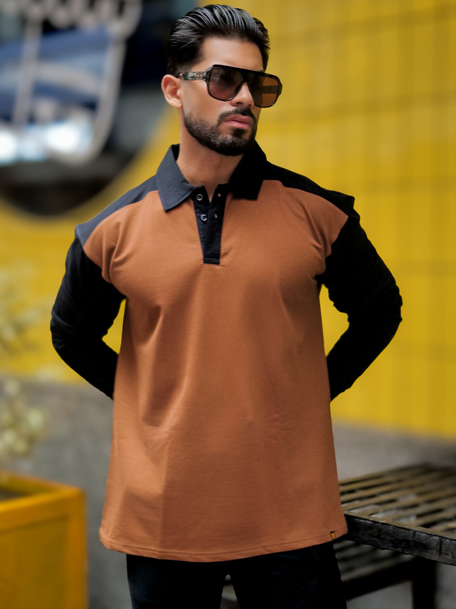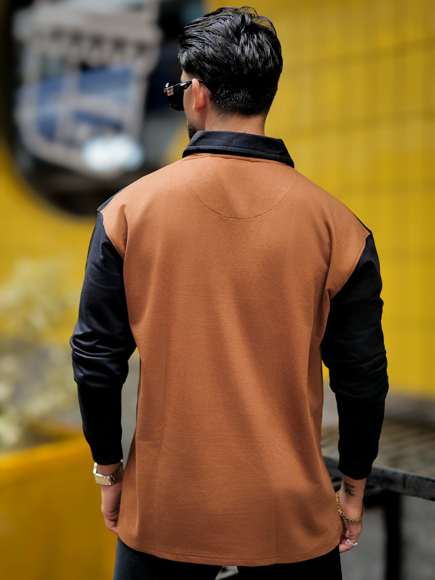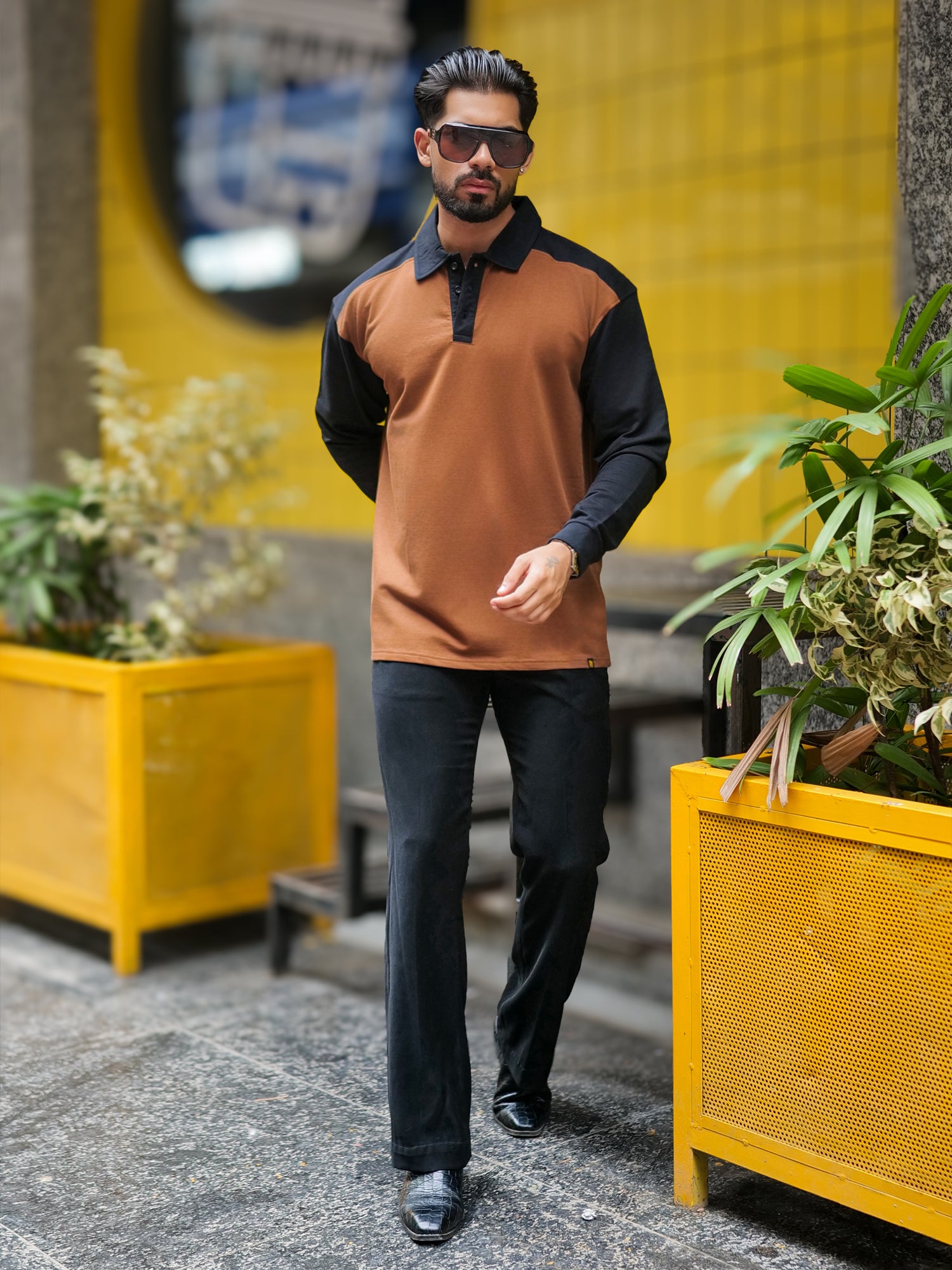 Colorblock Brown Full Sleeve Polo T-Shirt