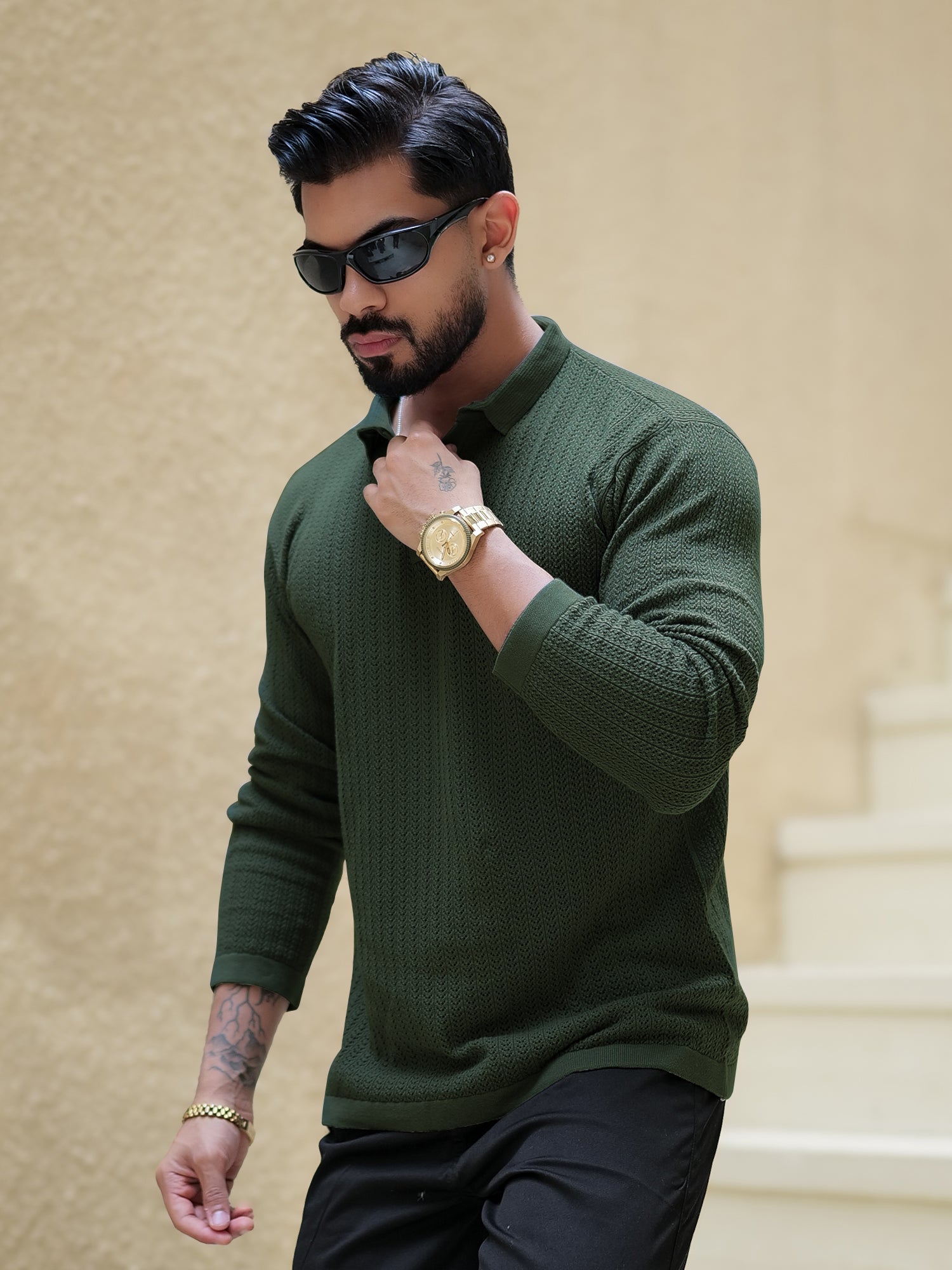 Classic Rib Dark Green Full Sleeve Polo T-Shirt