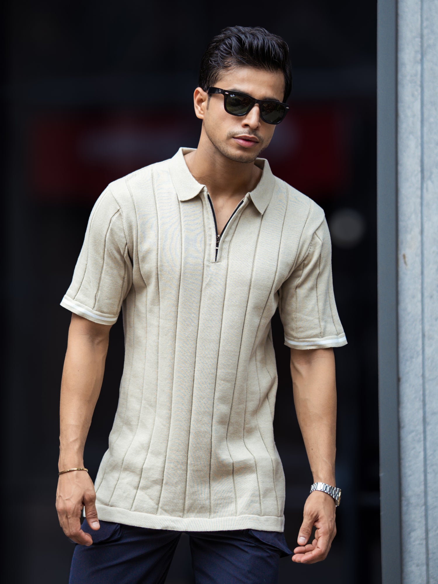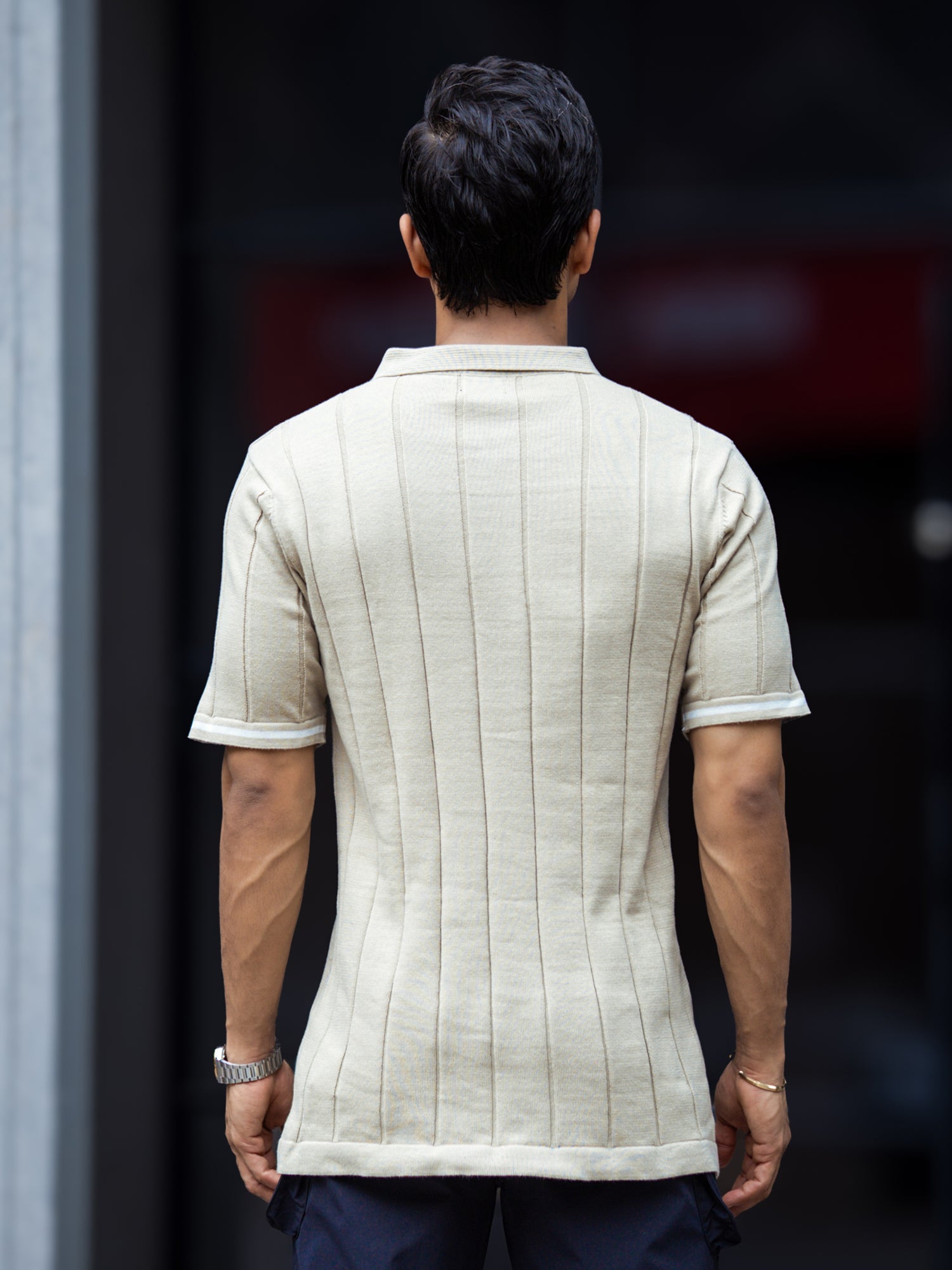 Drop Needle Beige Flatknit Half Sleeve Polo T-Shirt