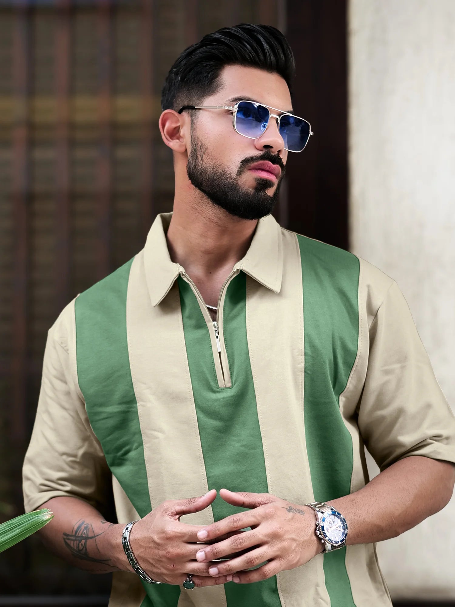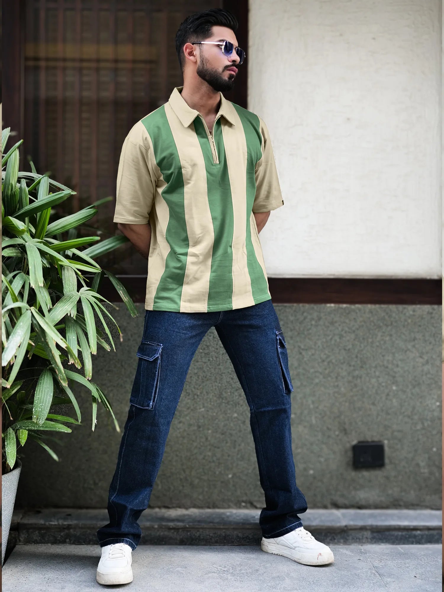 Bold Vertical Stripe Biscuit Polo Half Sleeve Tshirt