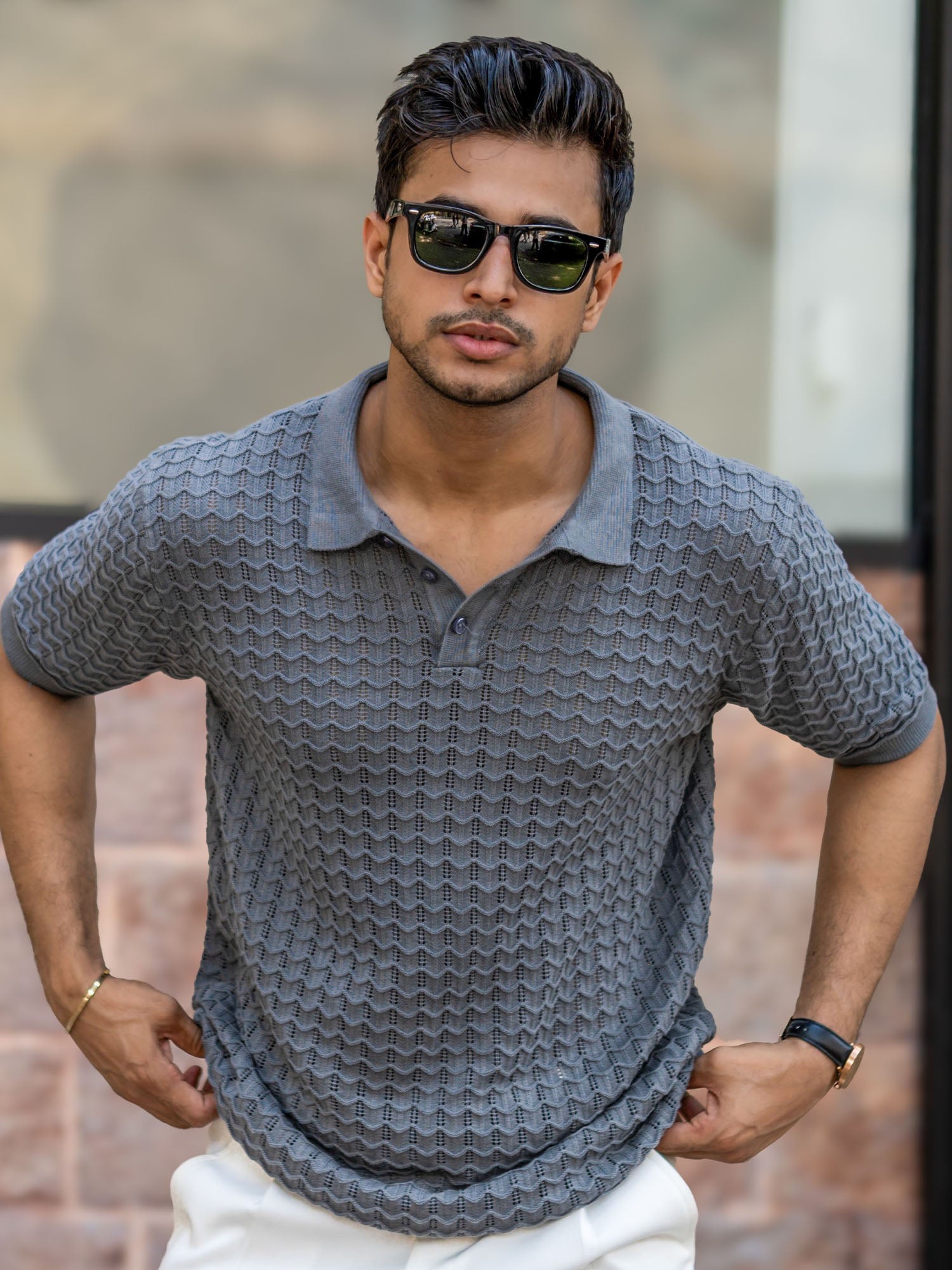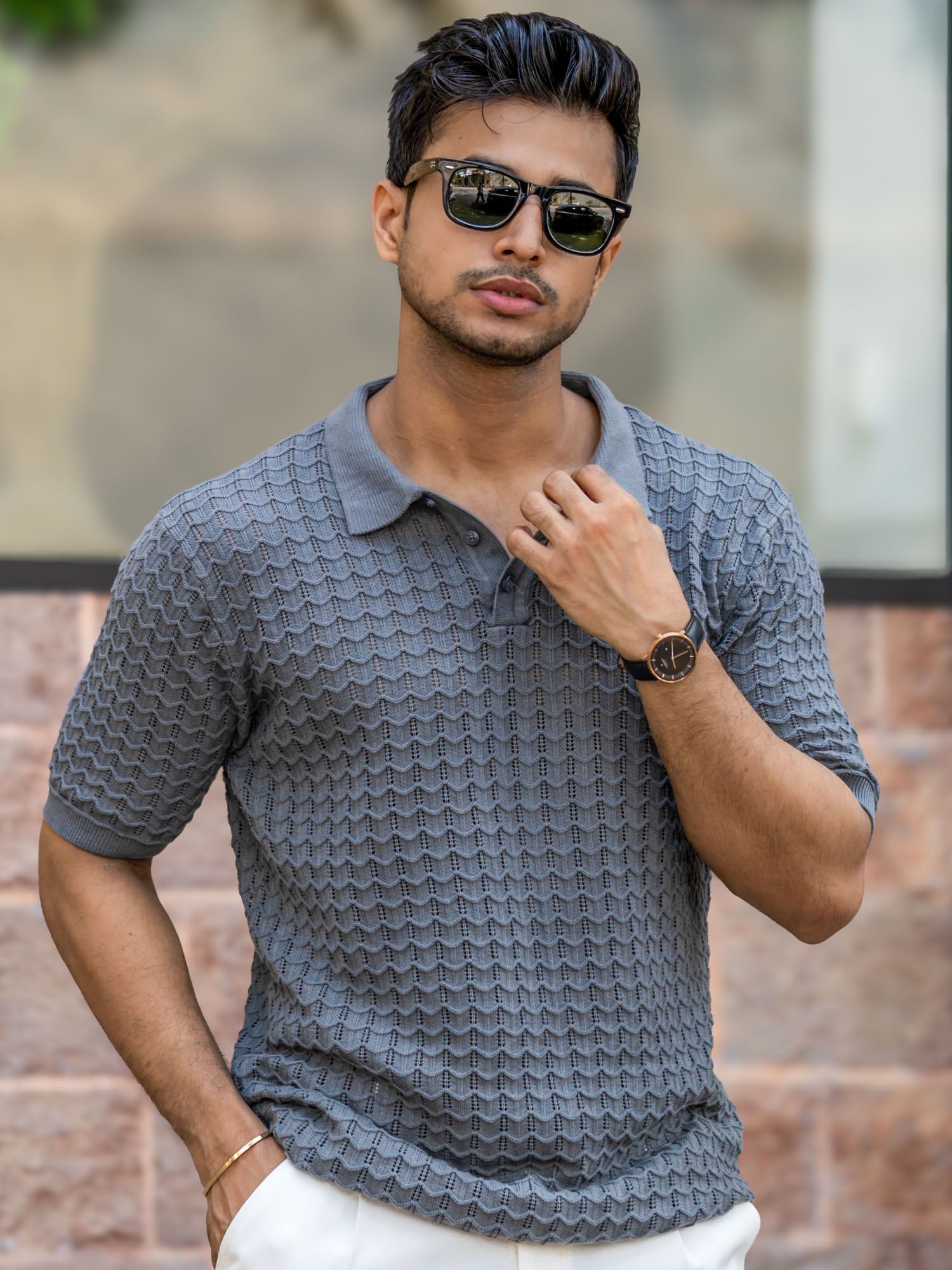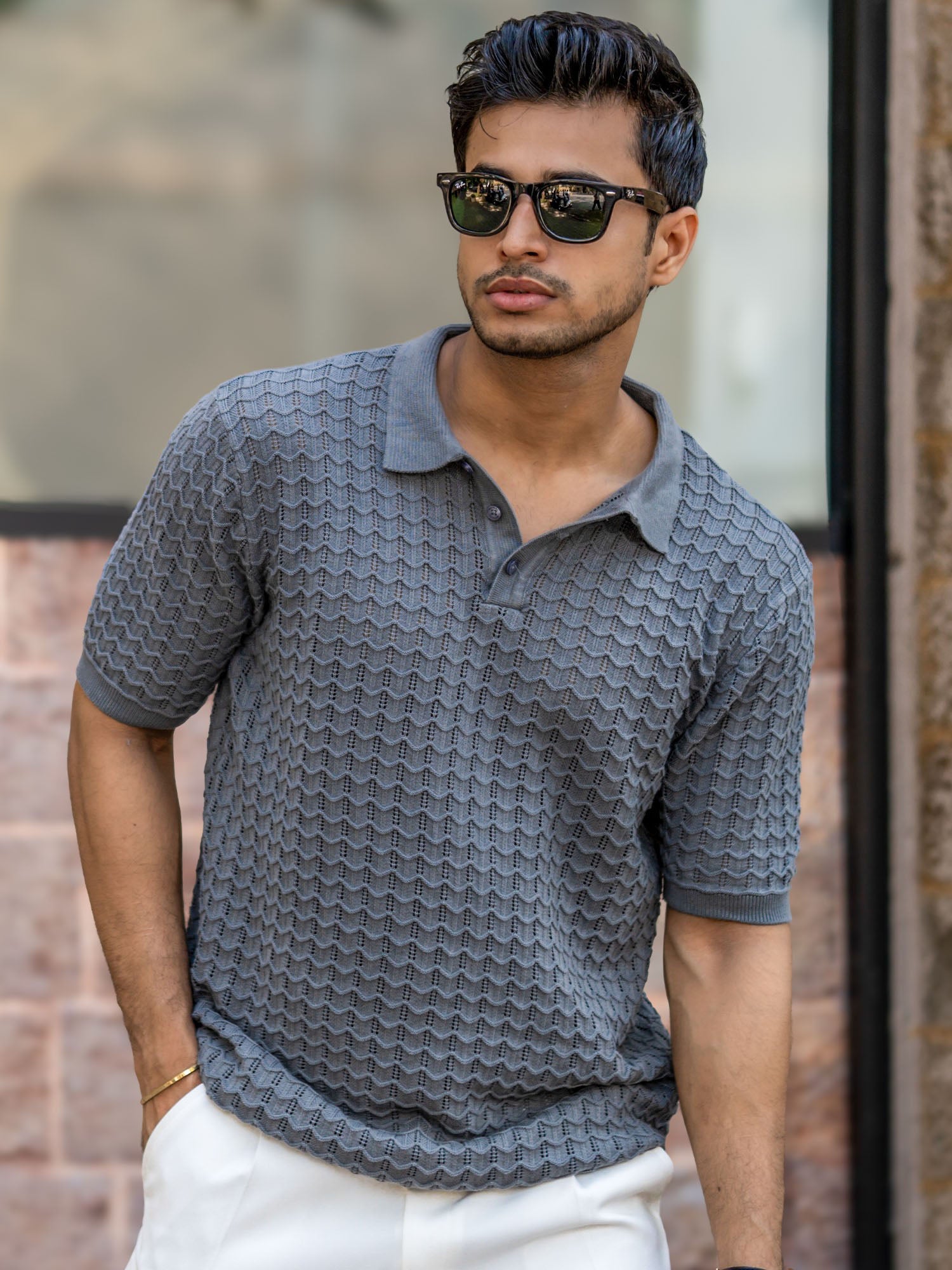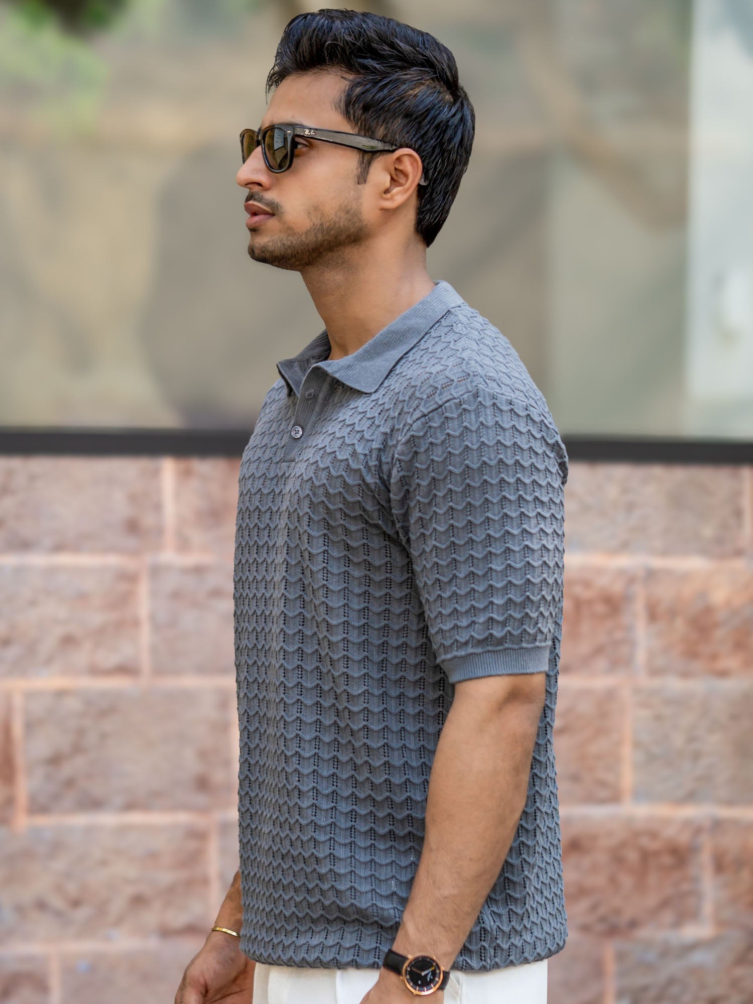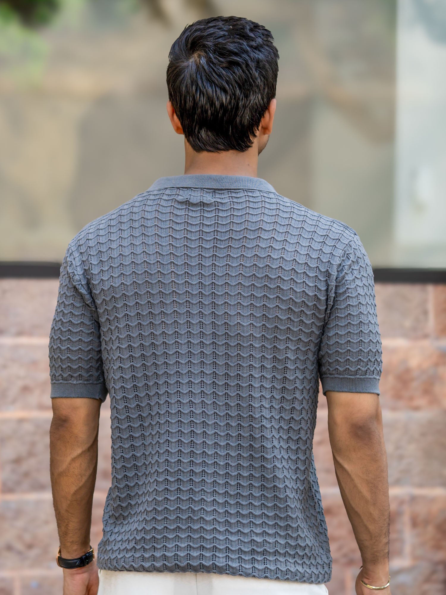 Cable Flatknit Dark Grey Half Sleeve Polo T-Shirt
