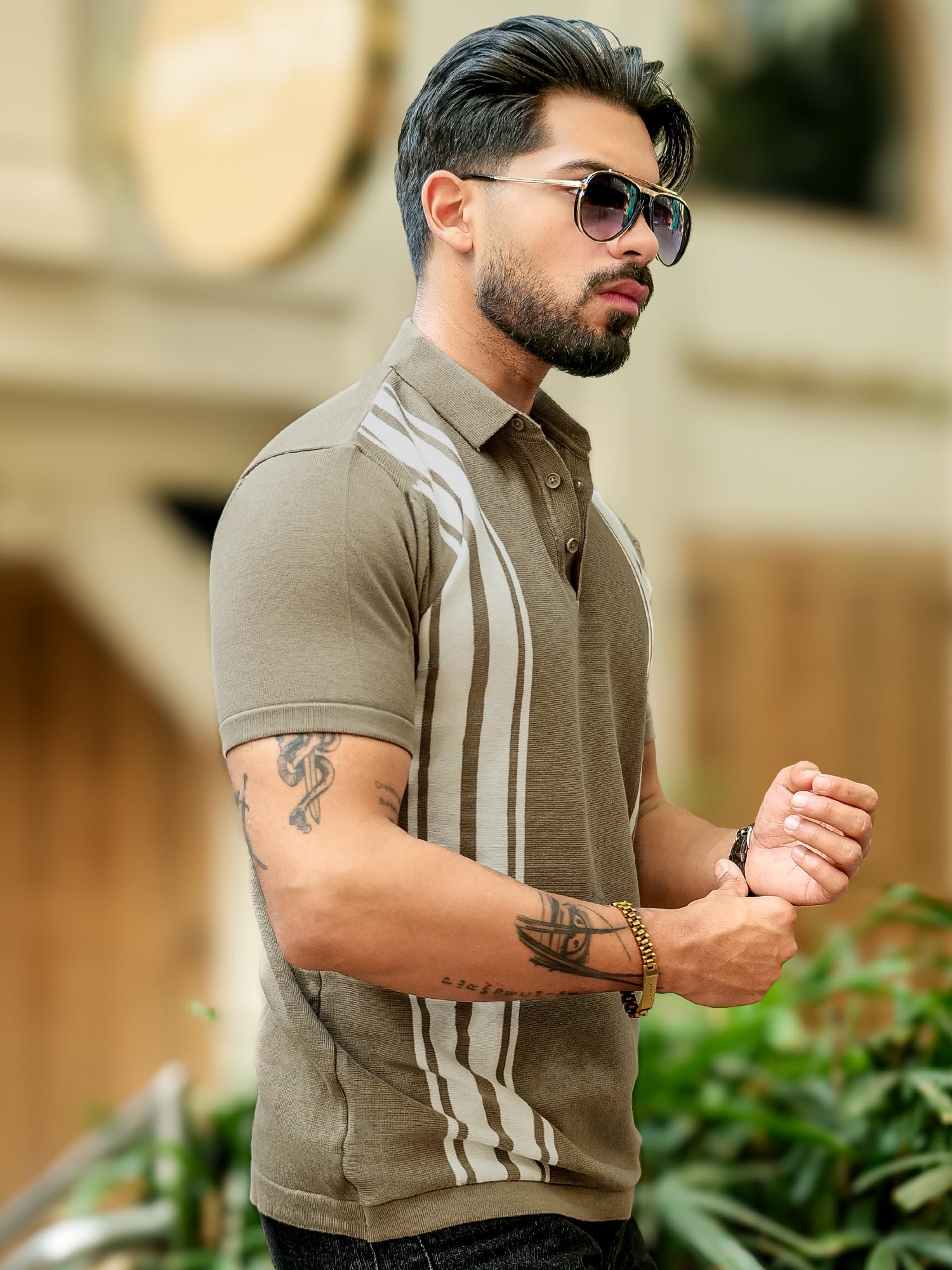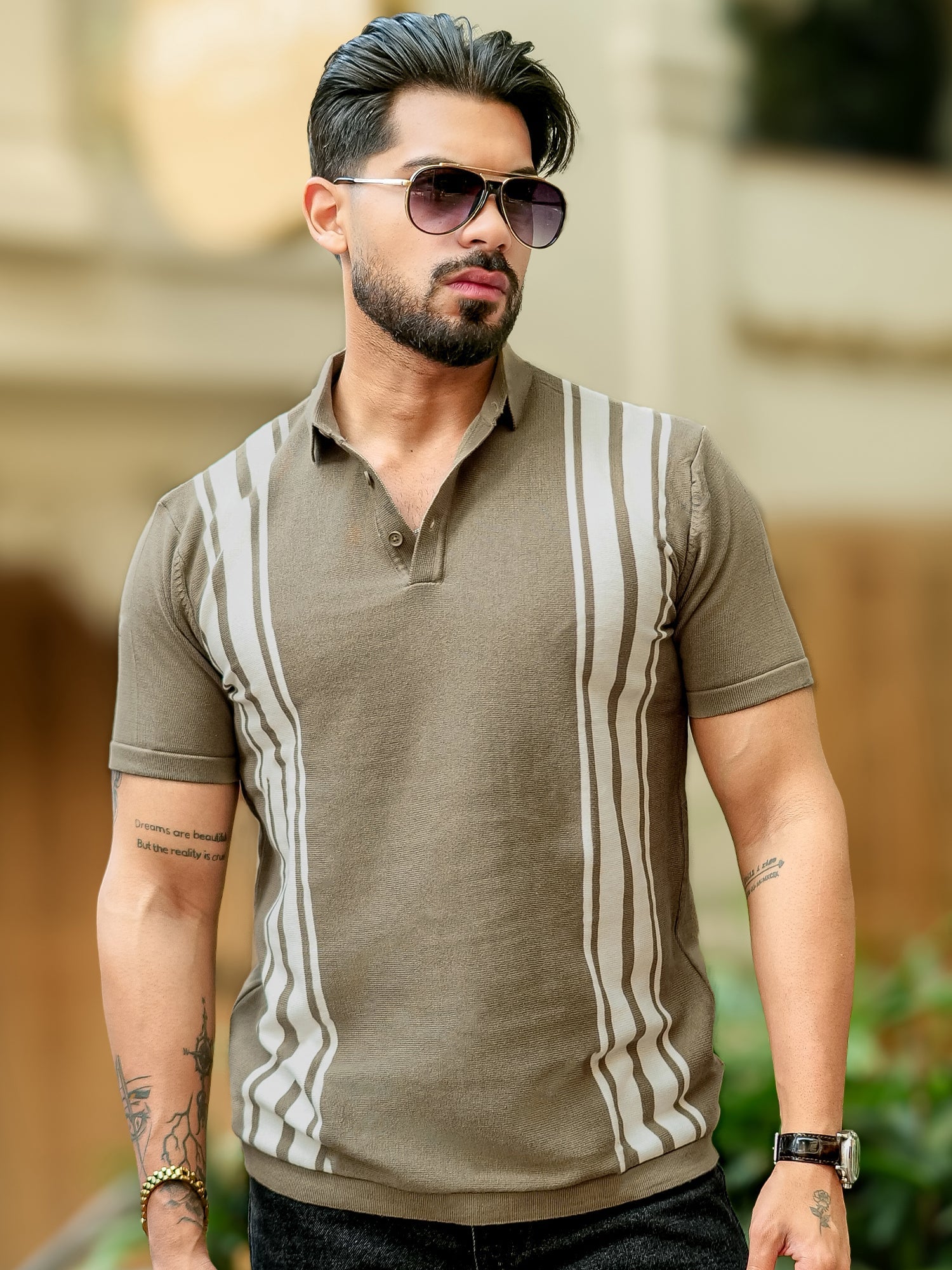 Vertical Stripe Green Flatknit Half Sleeve Polo T-Shirt
