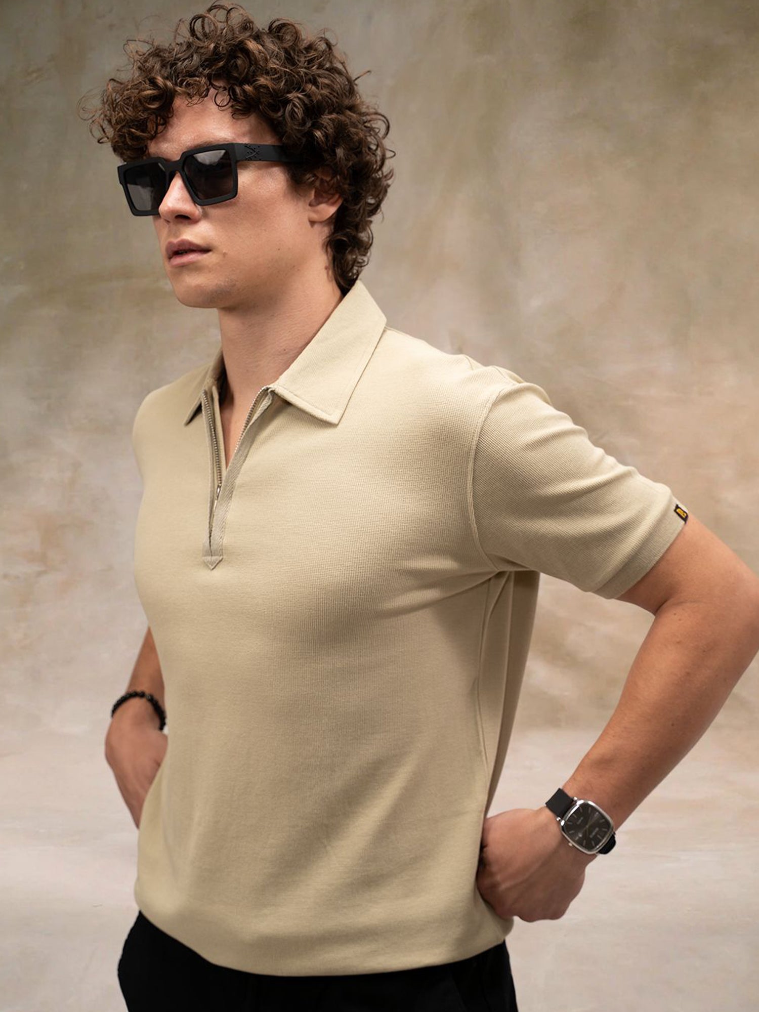 Beige Half Zipper Polo Half Sleeve T-Shirt