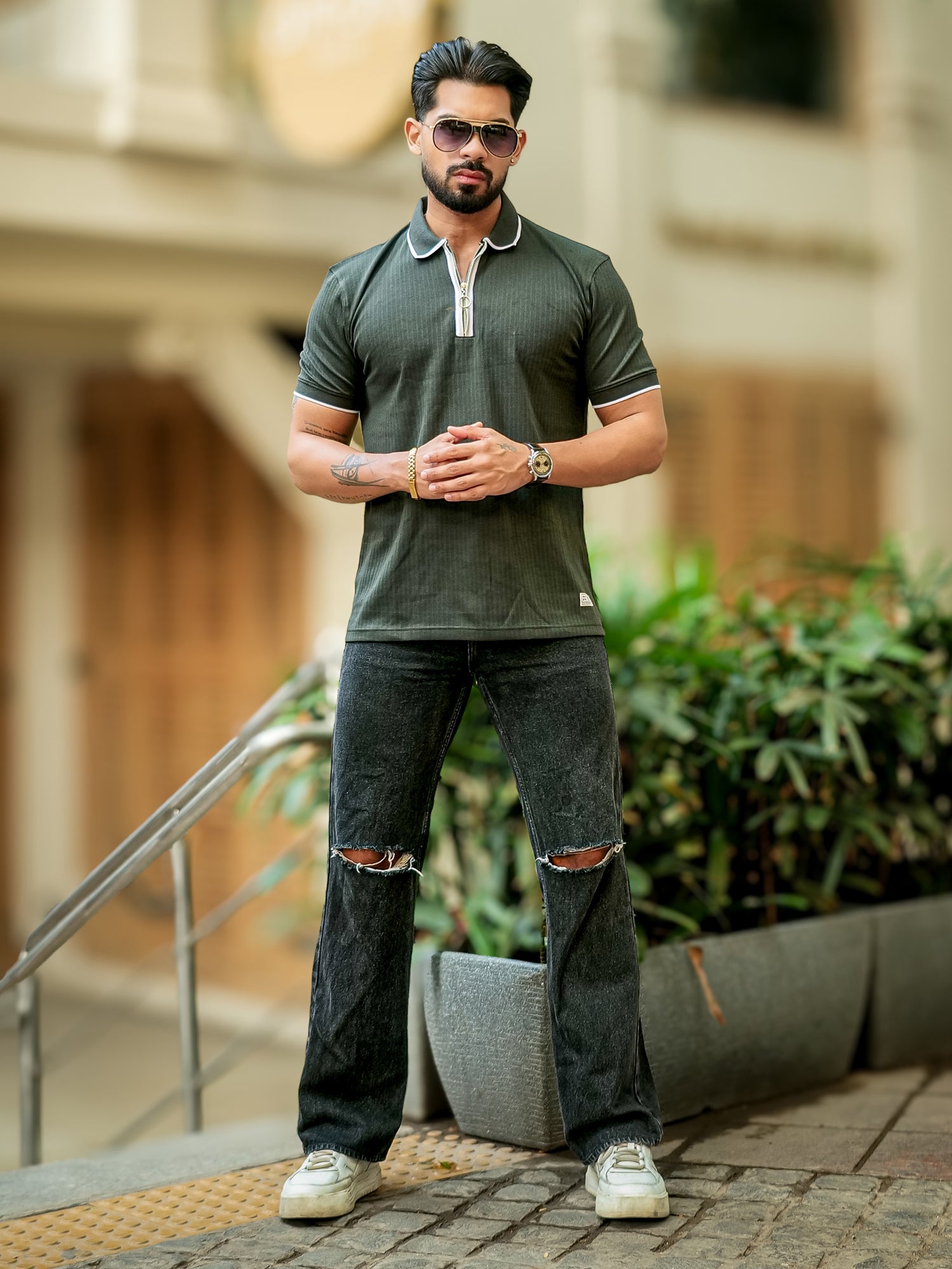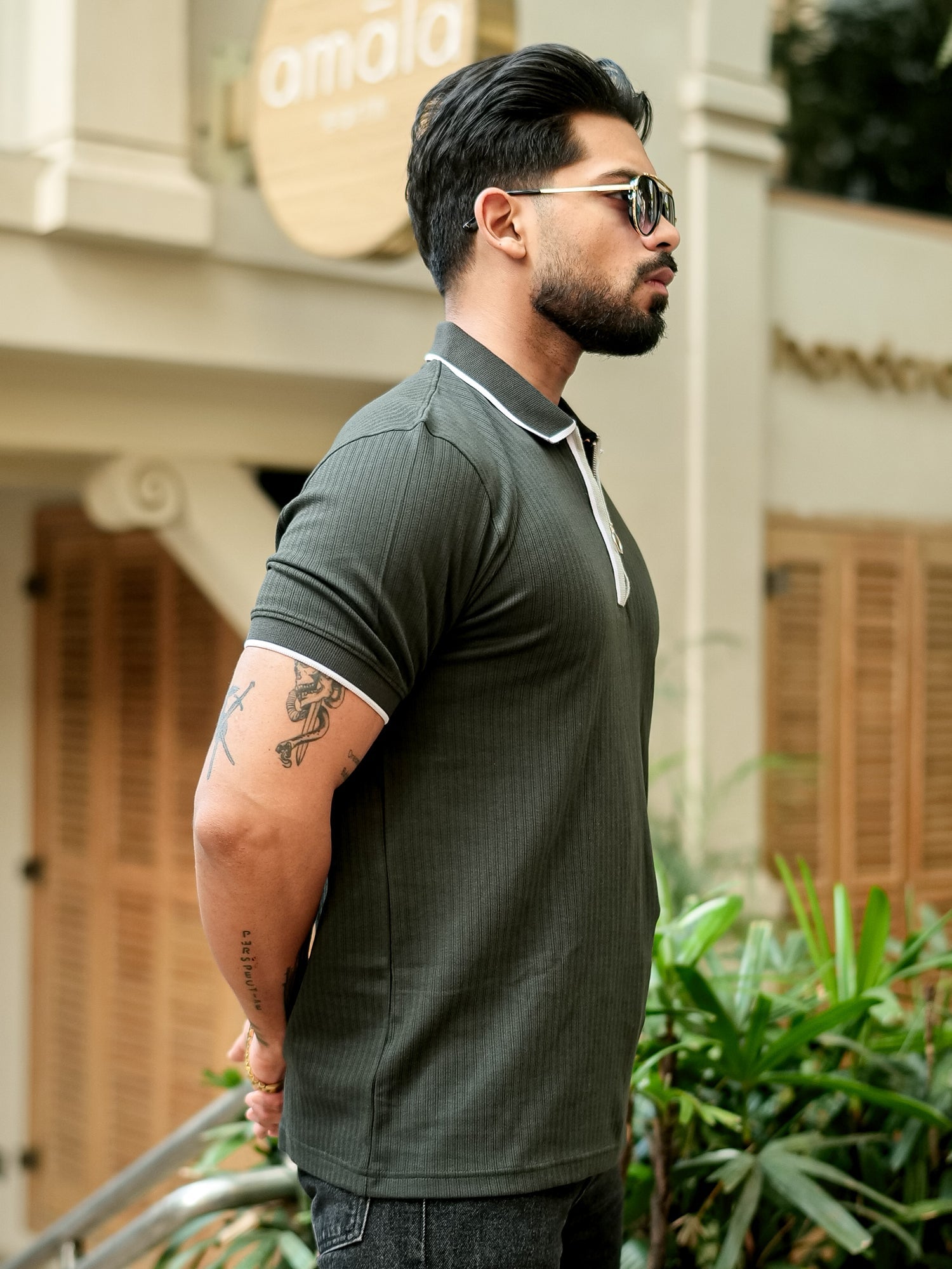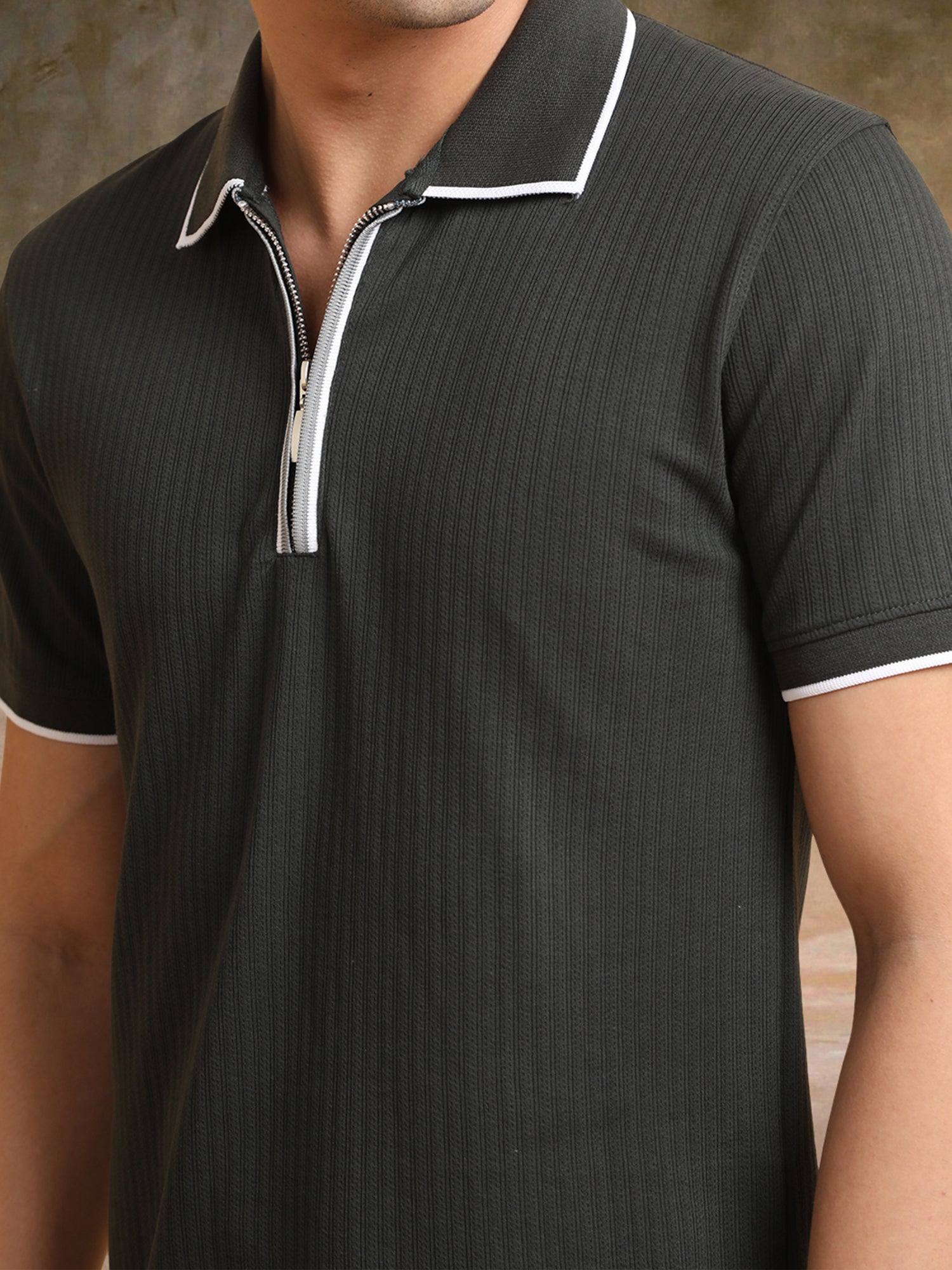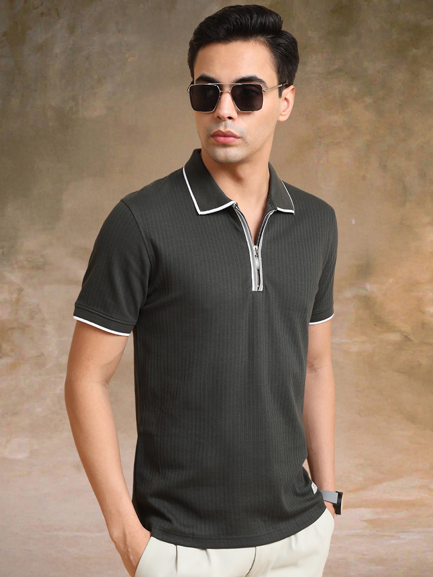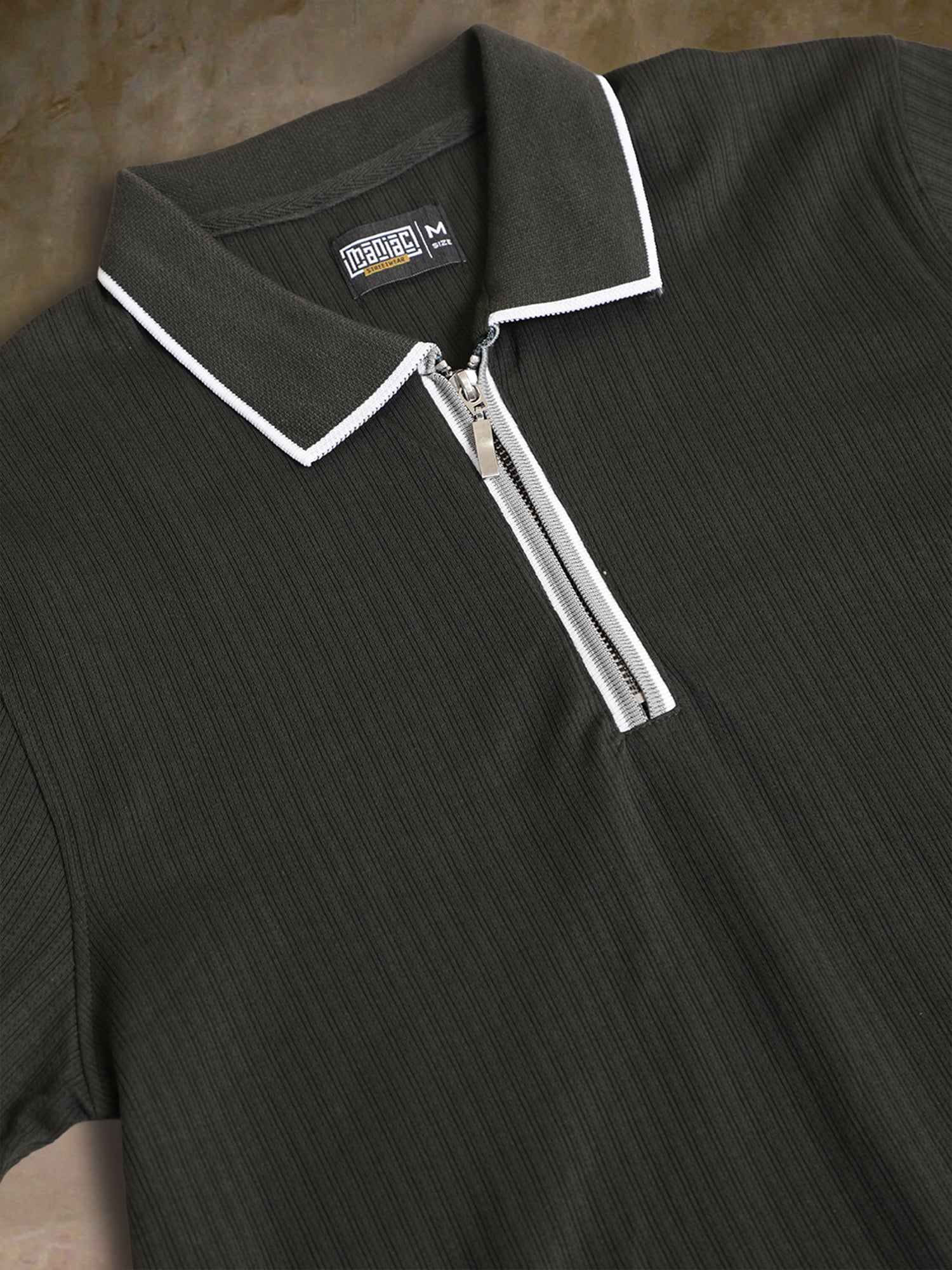 Pointel HalfZipper Olive Half Sleeve Polo T-Shirt