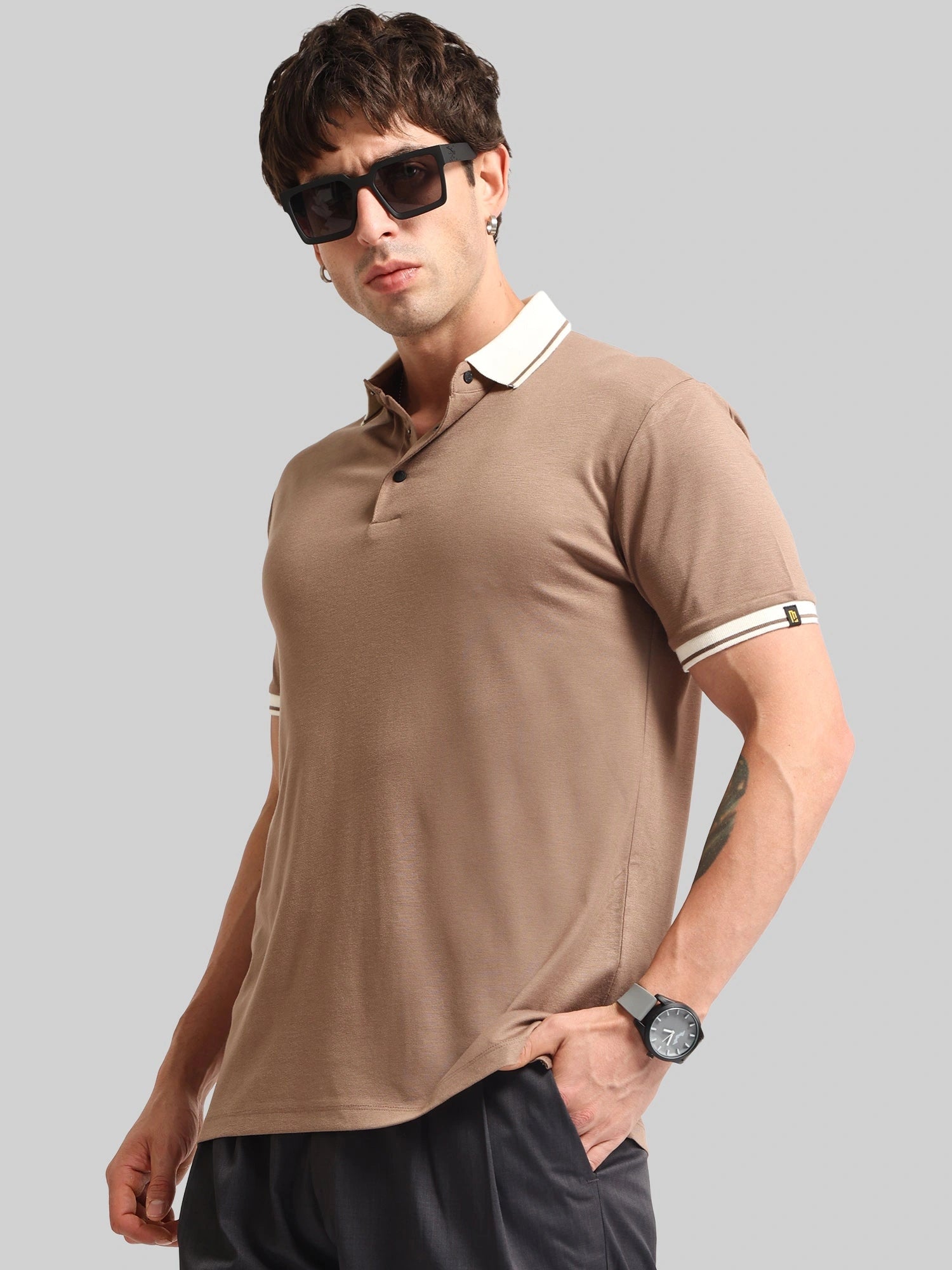 Contrast Collar Brown Half Sleeve Polo T-Shirt