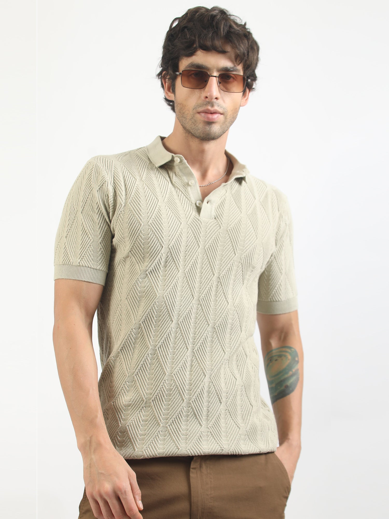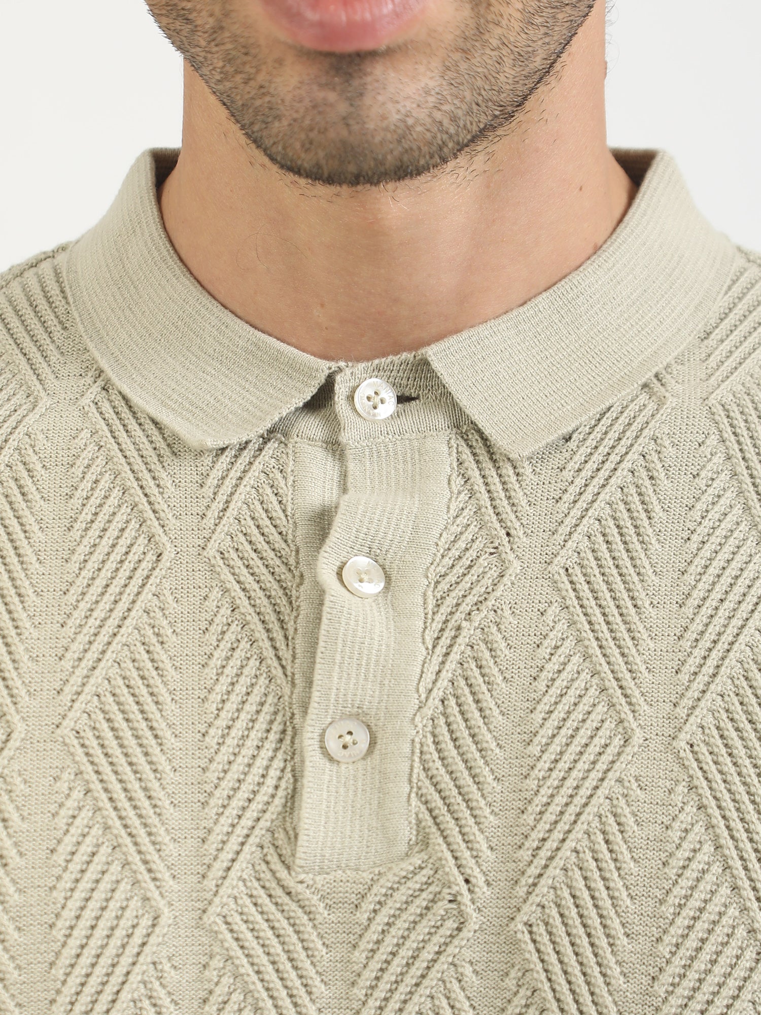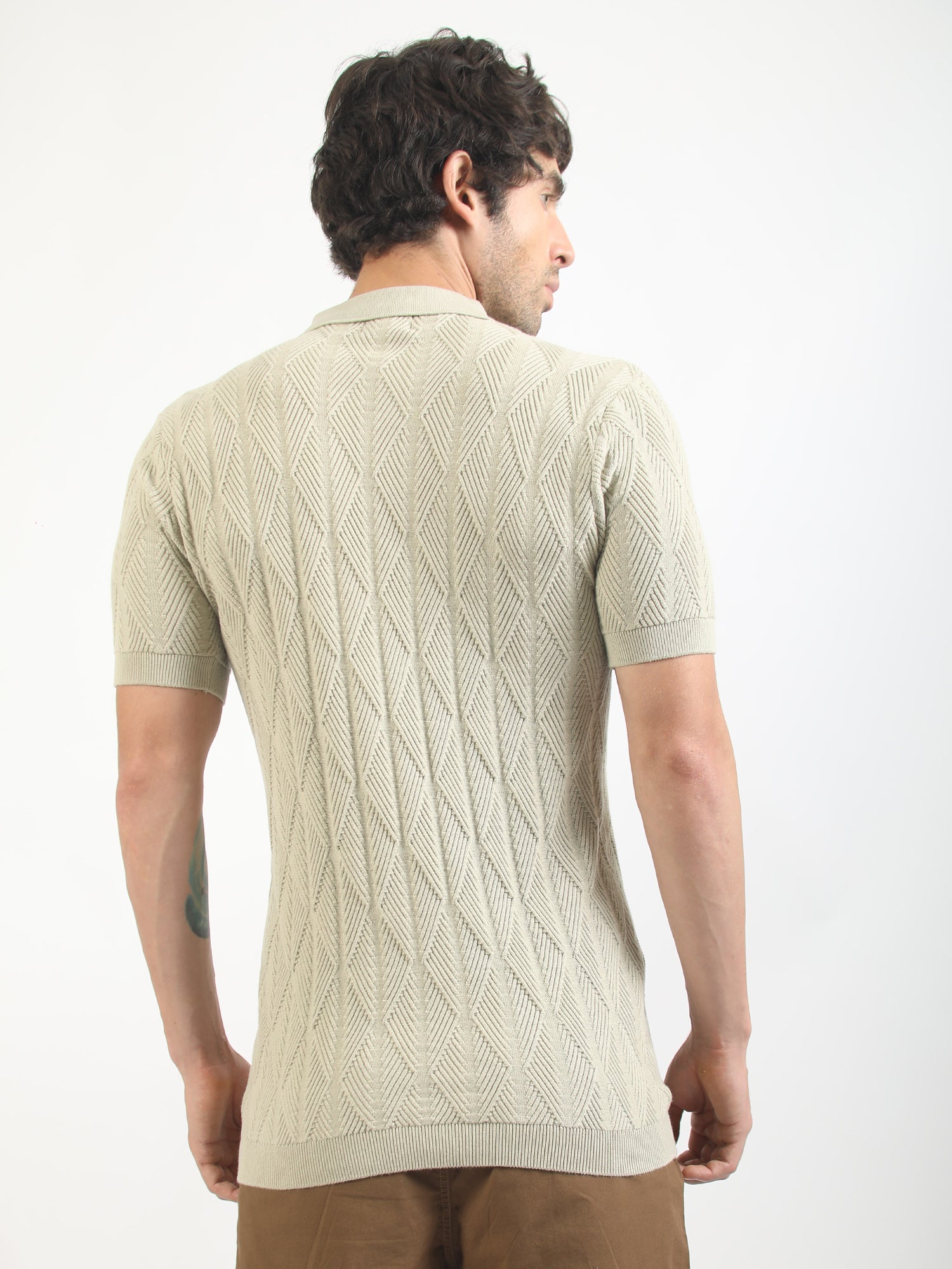 Geo Weave Flatknit Cotton Biscuit Half Sleeve Polo T-Shirt