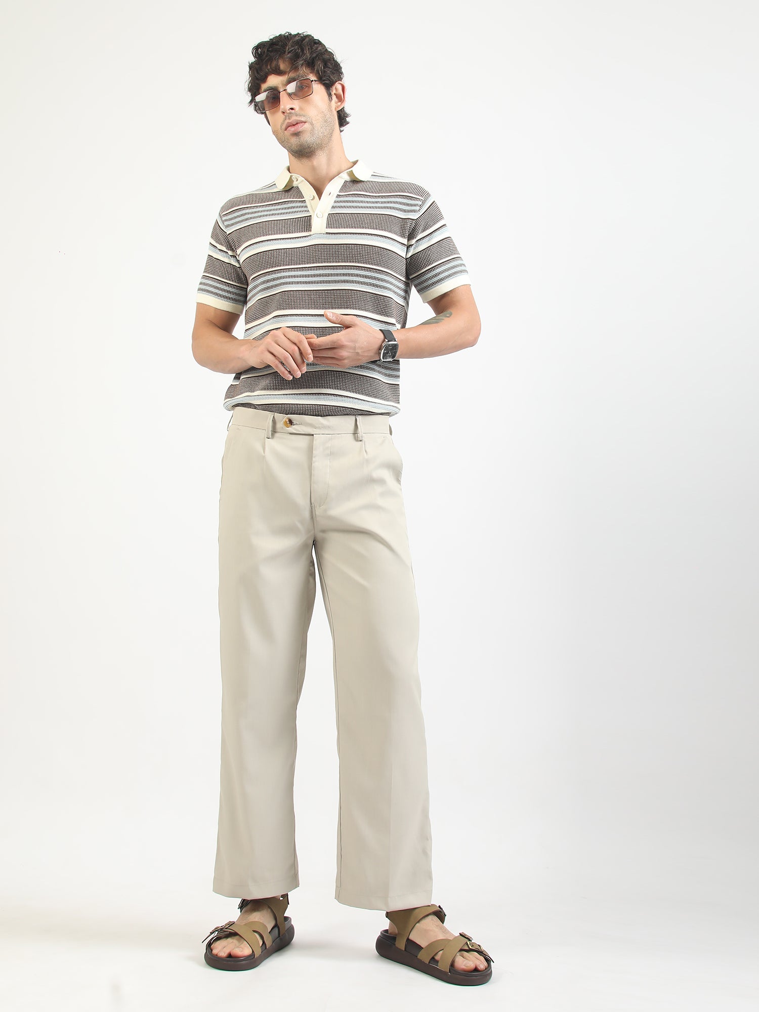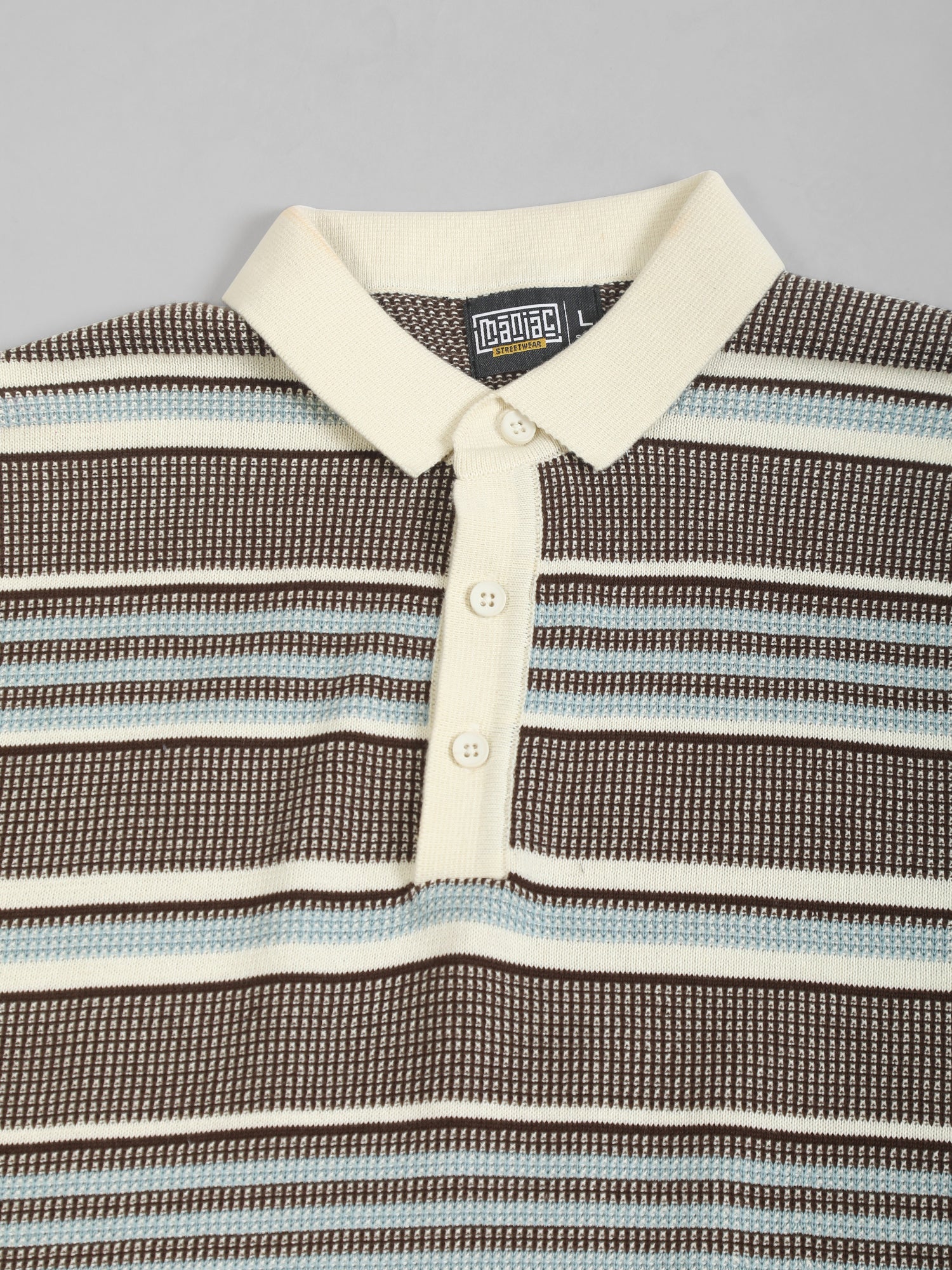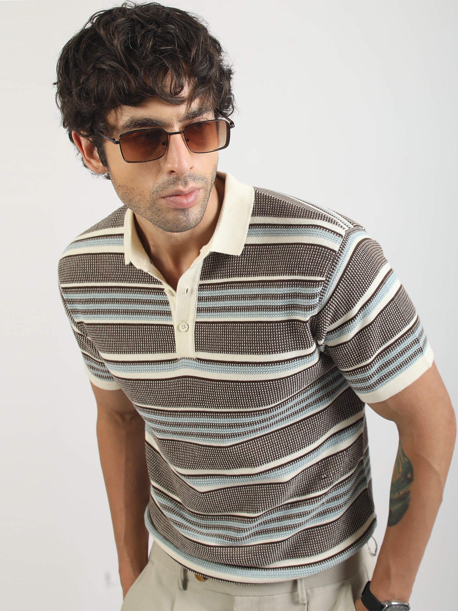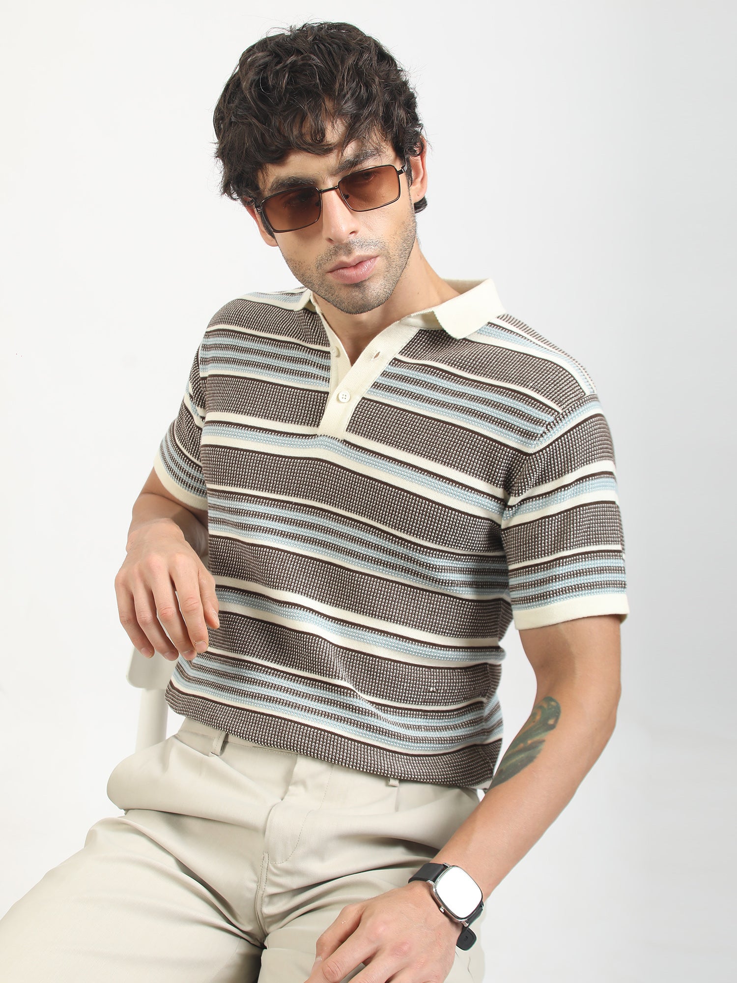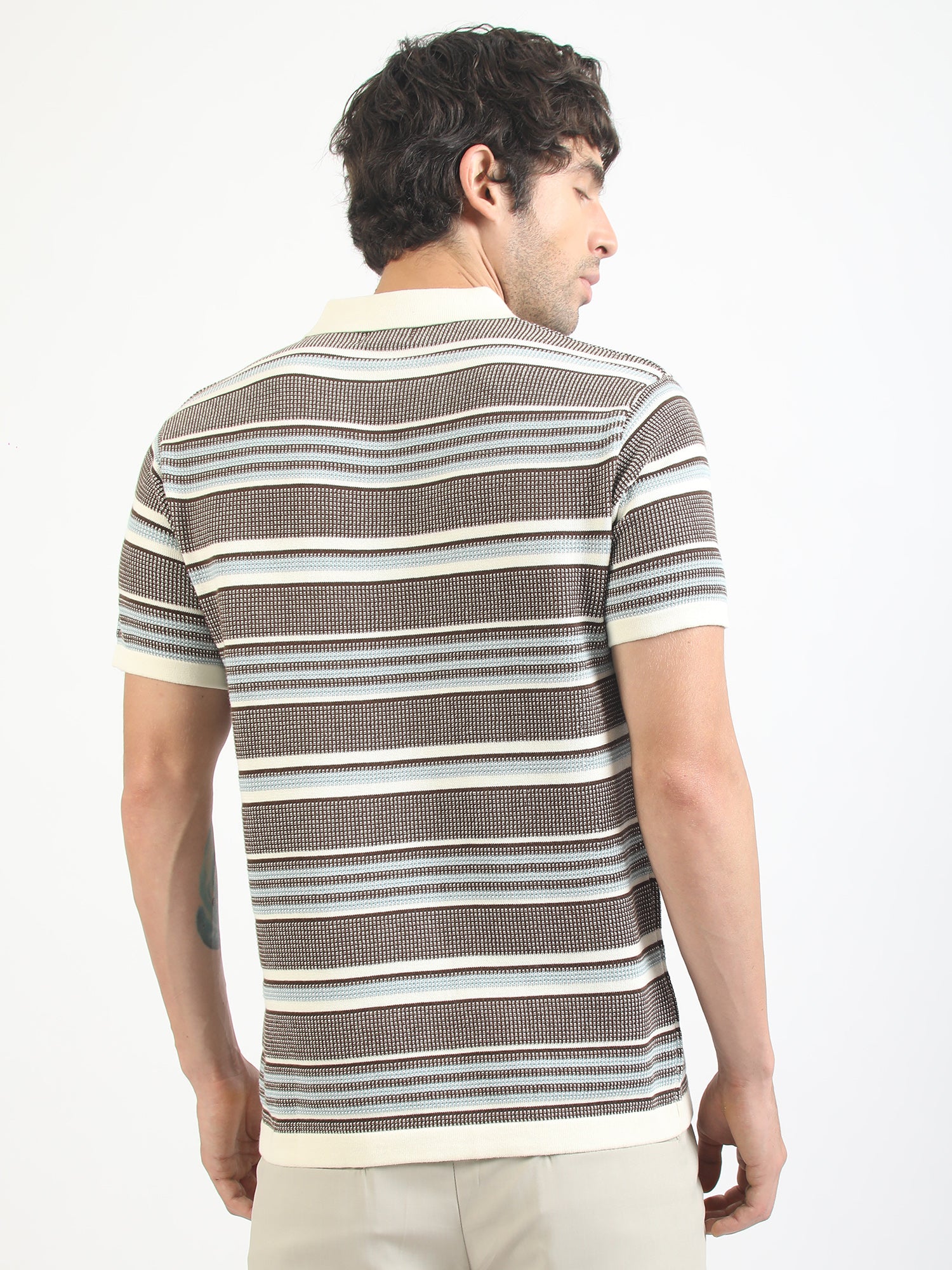 Brown Flat-Knit Half-Sleeve Polo T-Shirt with Signal Stripe