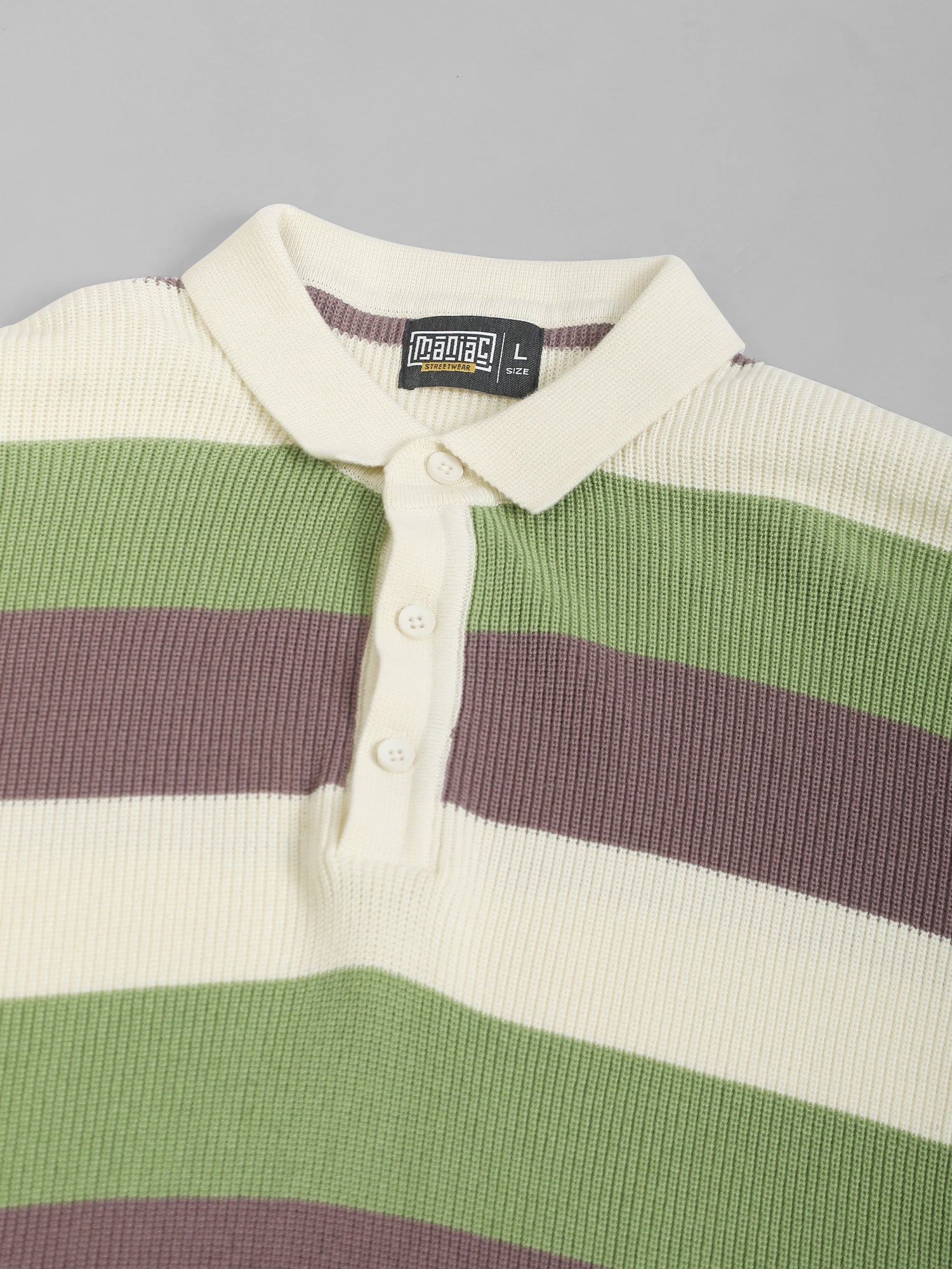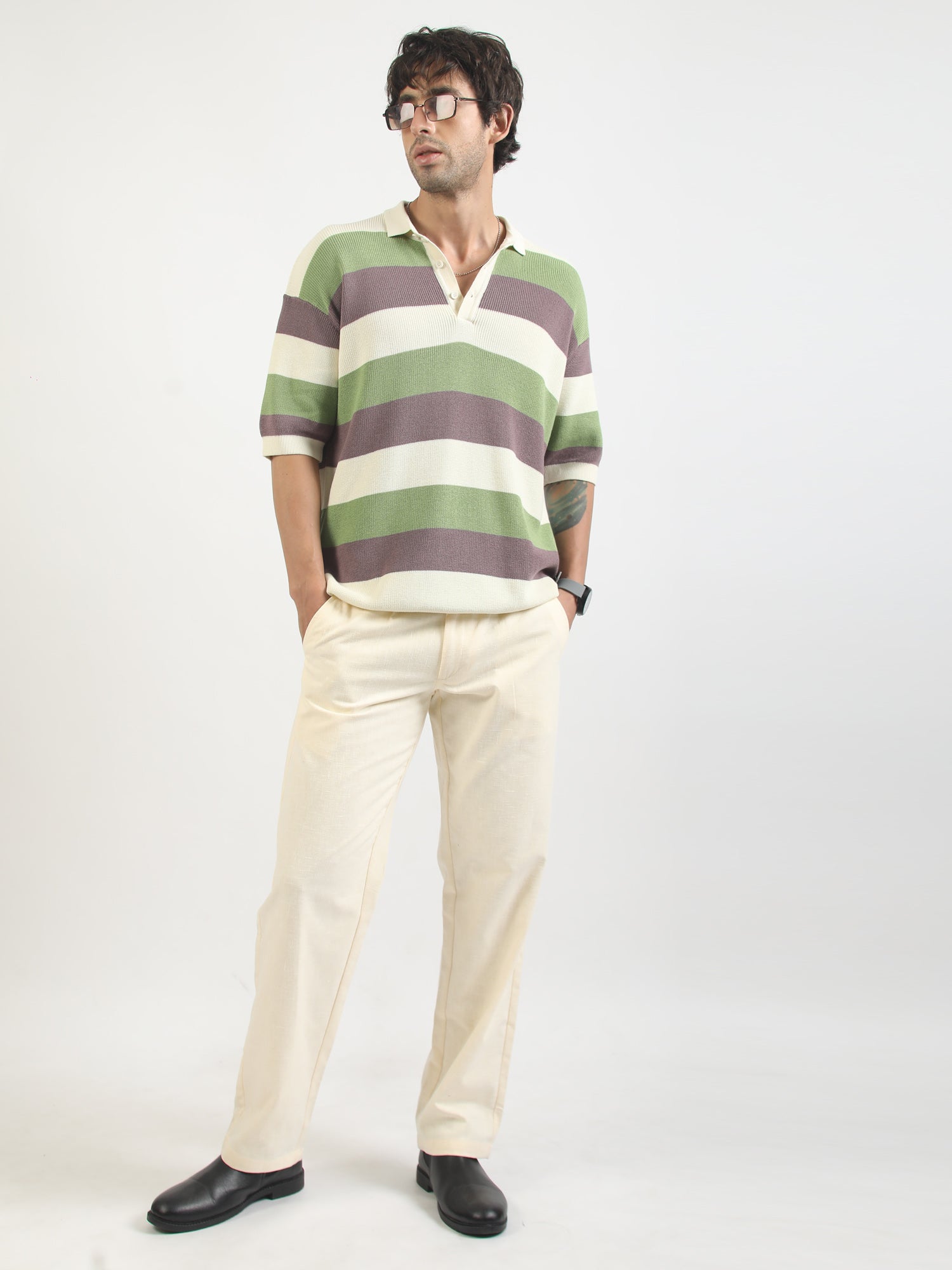 Cream Hawaii Stripes Flat-Knit Half Sleeve Polo T-Shirt