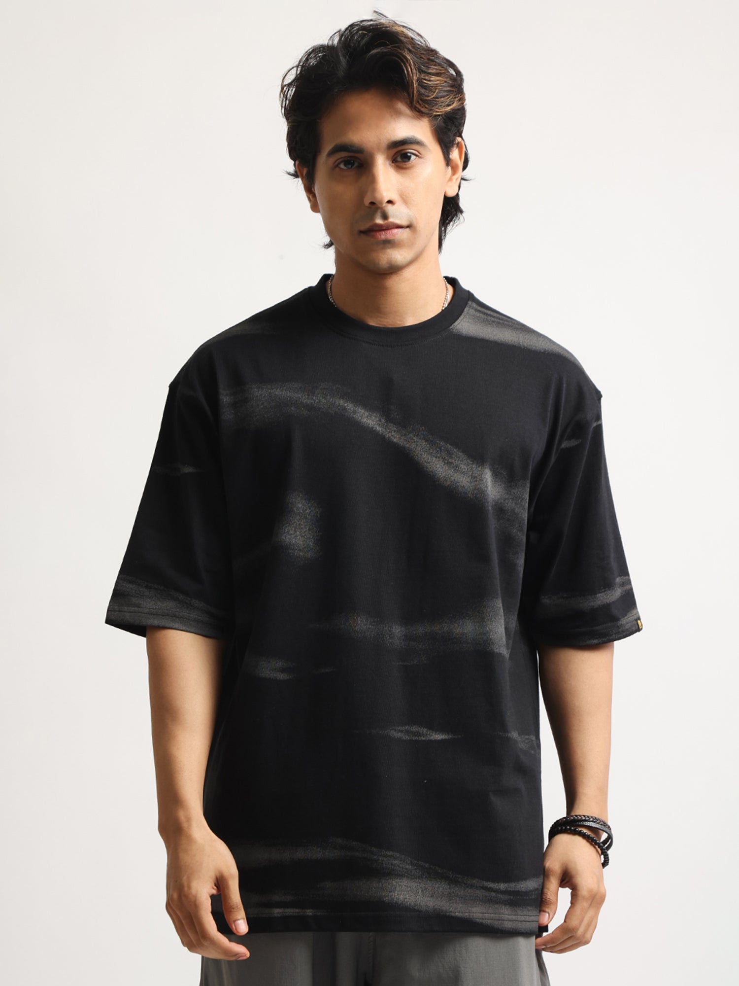Wave Sparay Printed Black Half Sleeve T-Shirt