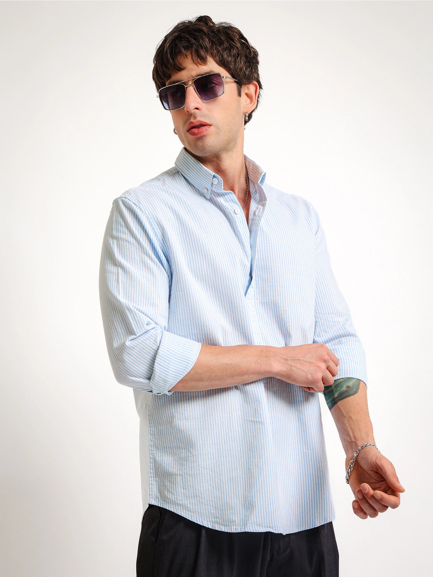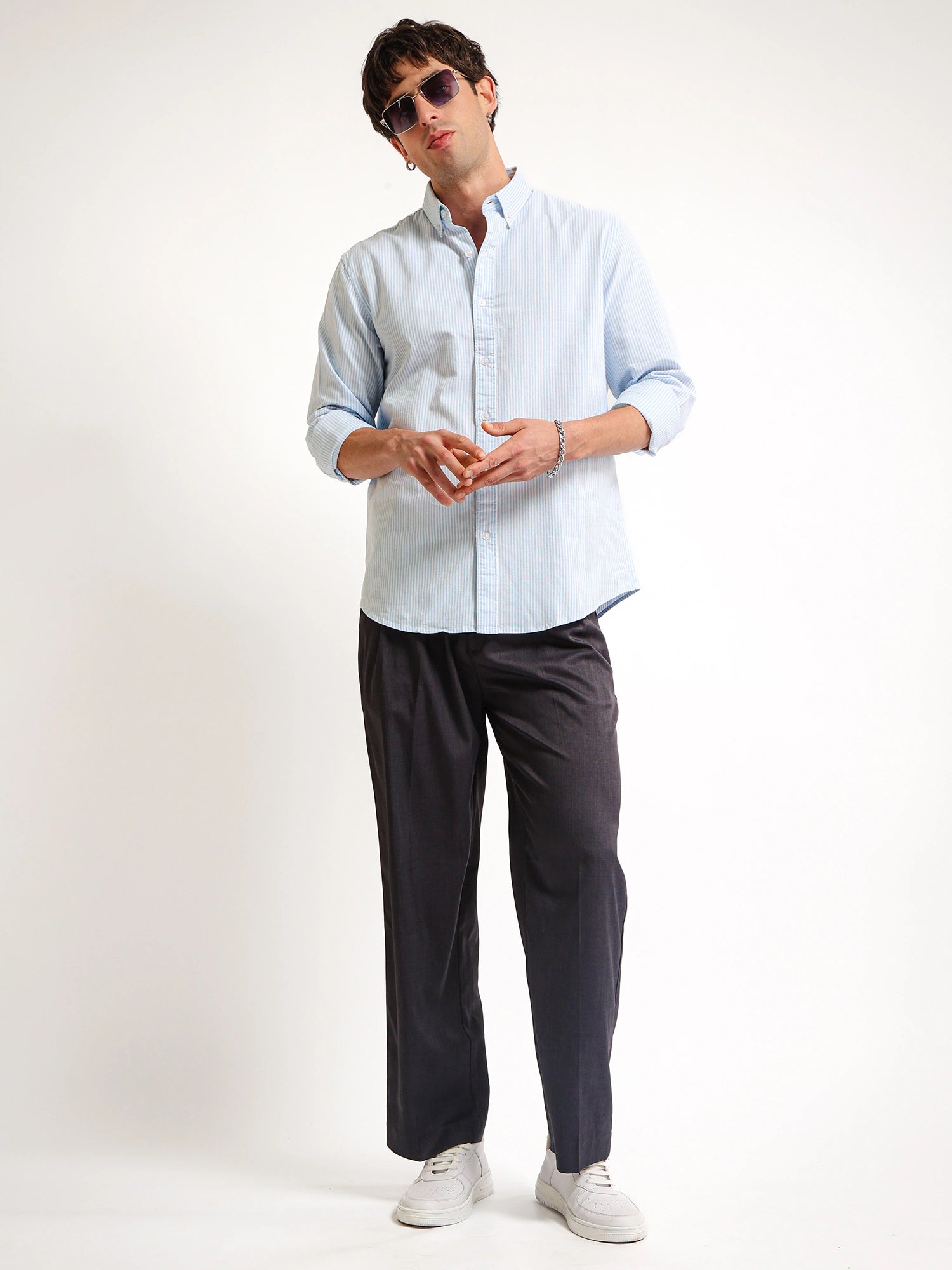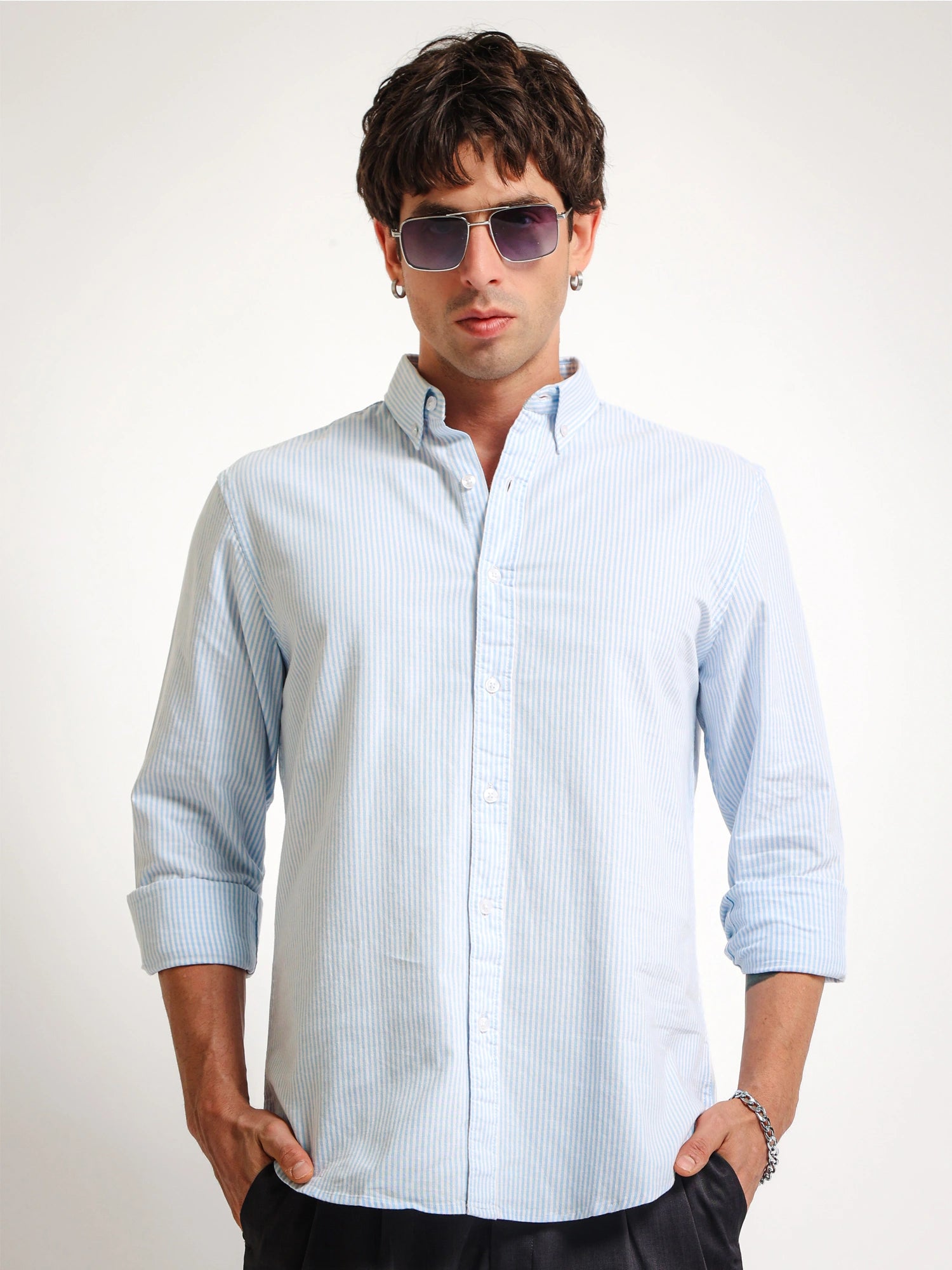 Refine your everyday style with the Light Blue Oxford Stripe Full Sleeve Shirt. Crafted from breathable 100% cotton, this light blue striped shirt men prefer delivers comfort and a clean smart casual look. Featuring a button down collar and classic stripe pattern, this cotton oxford shirt for men is perfect for office wear, casual outings, and everyday style.