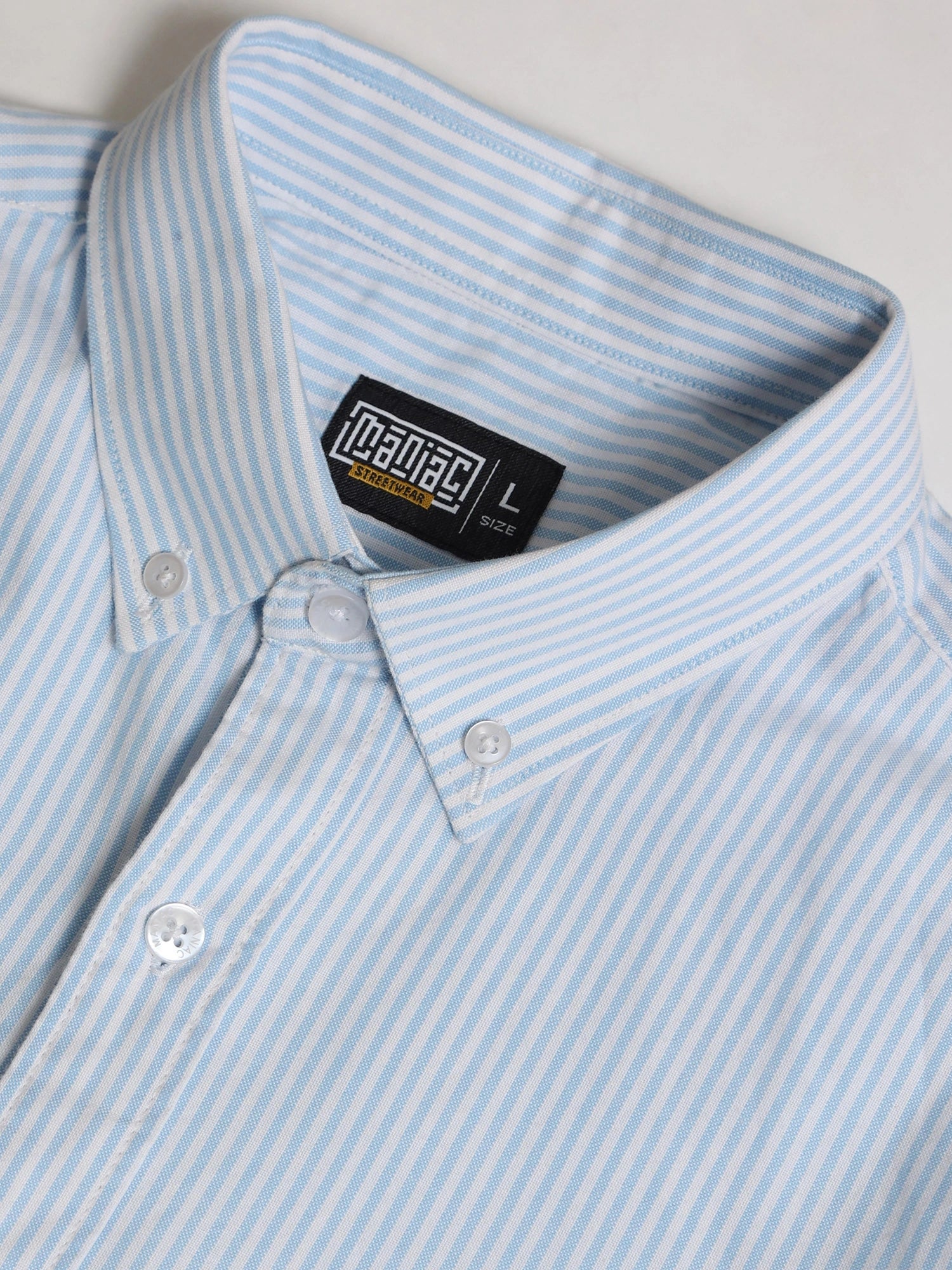 Light blue striped cotton shirt with button down collar & relaxed fit.